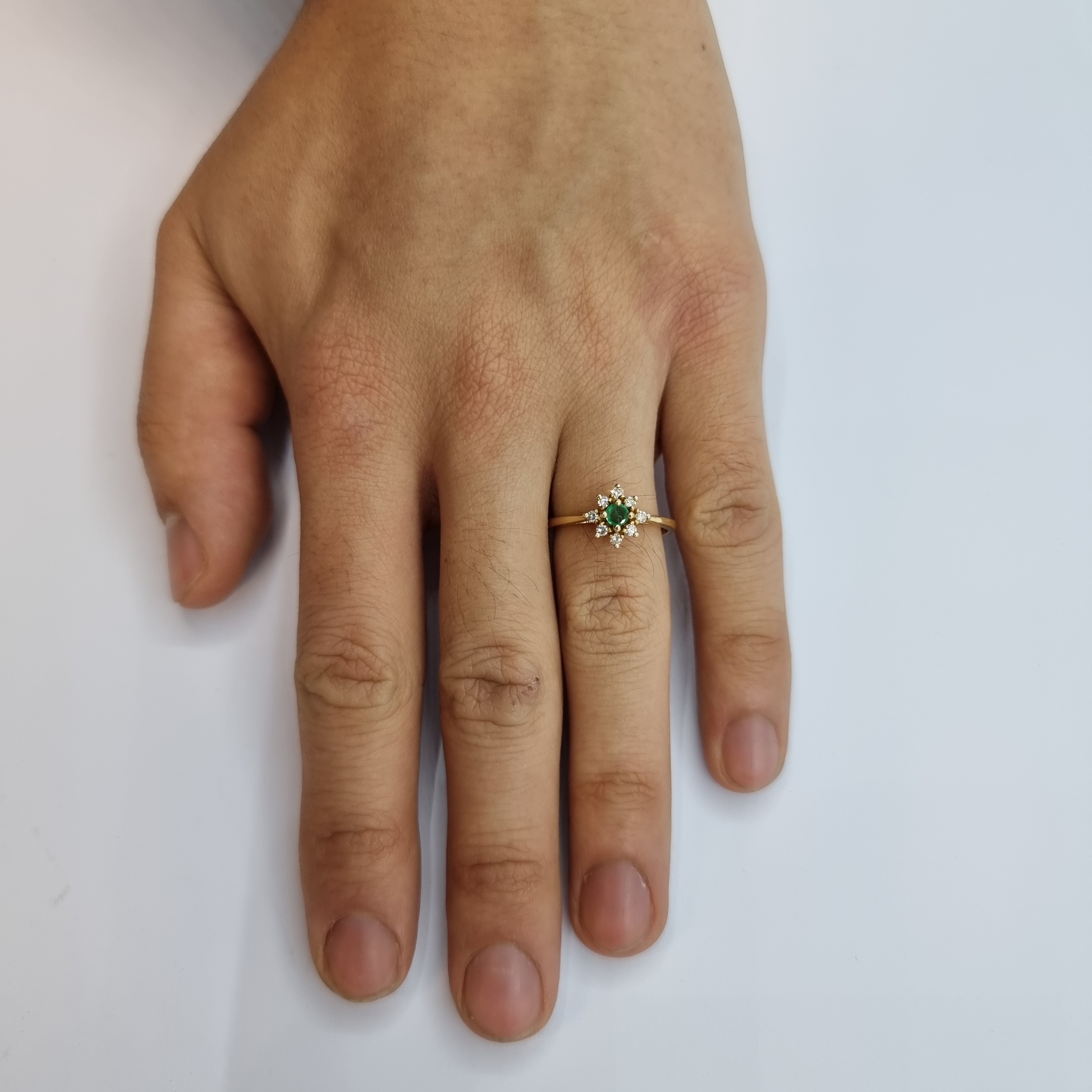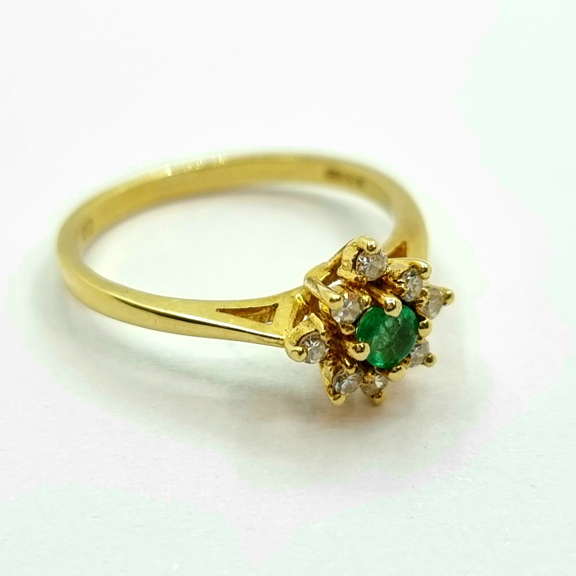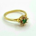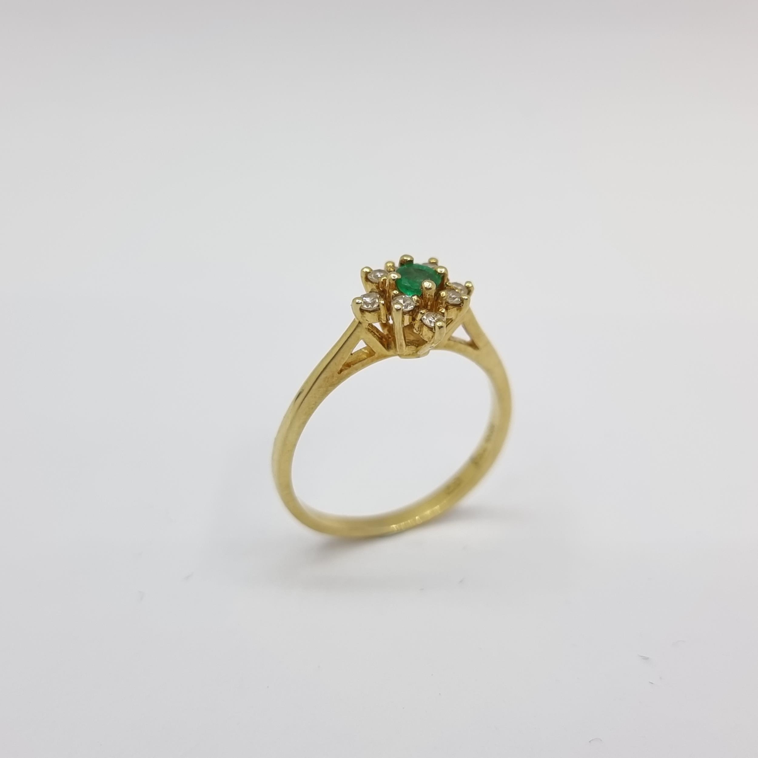 Star Lot: A very attractive 18K gold daisy ring with emerald and diamonds. Ring size M 1/2, weight 2.45g.