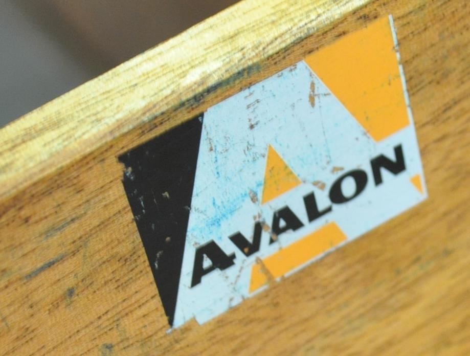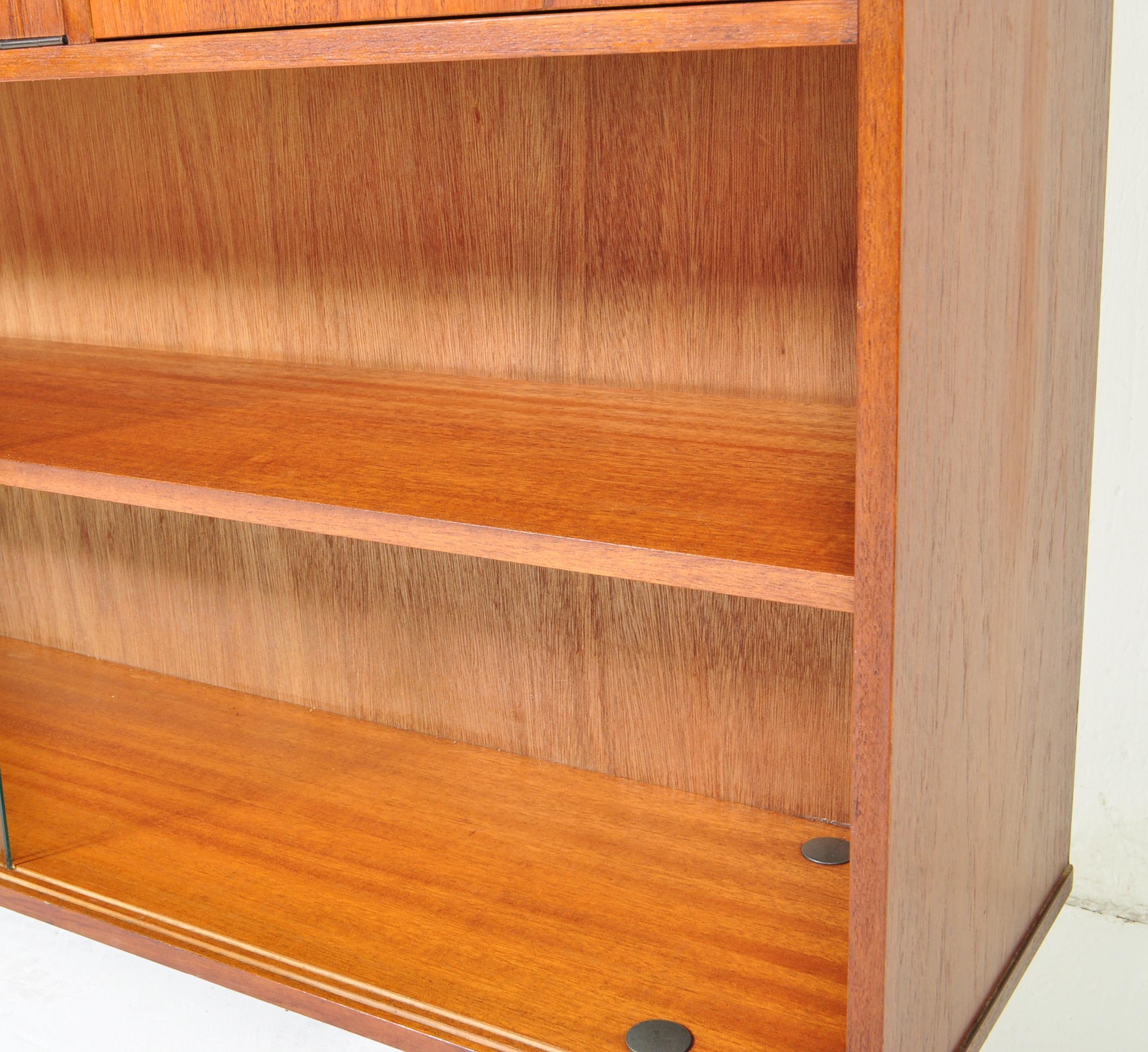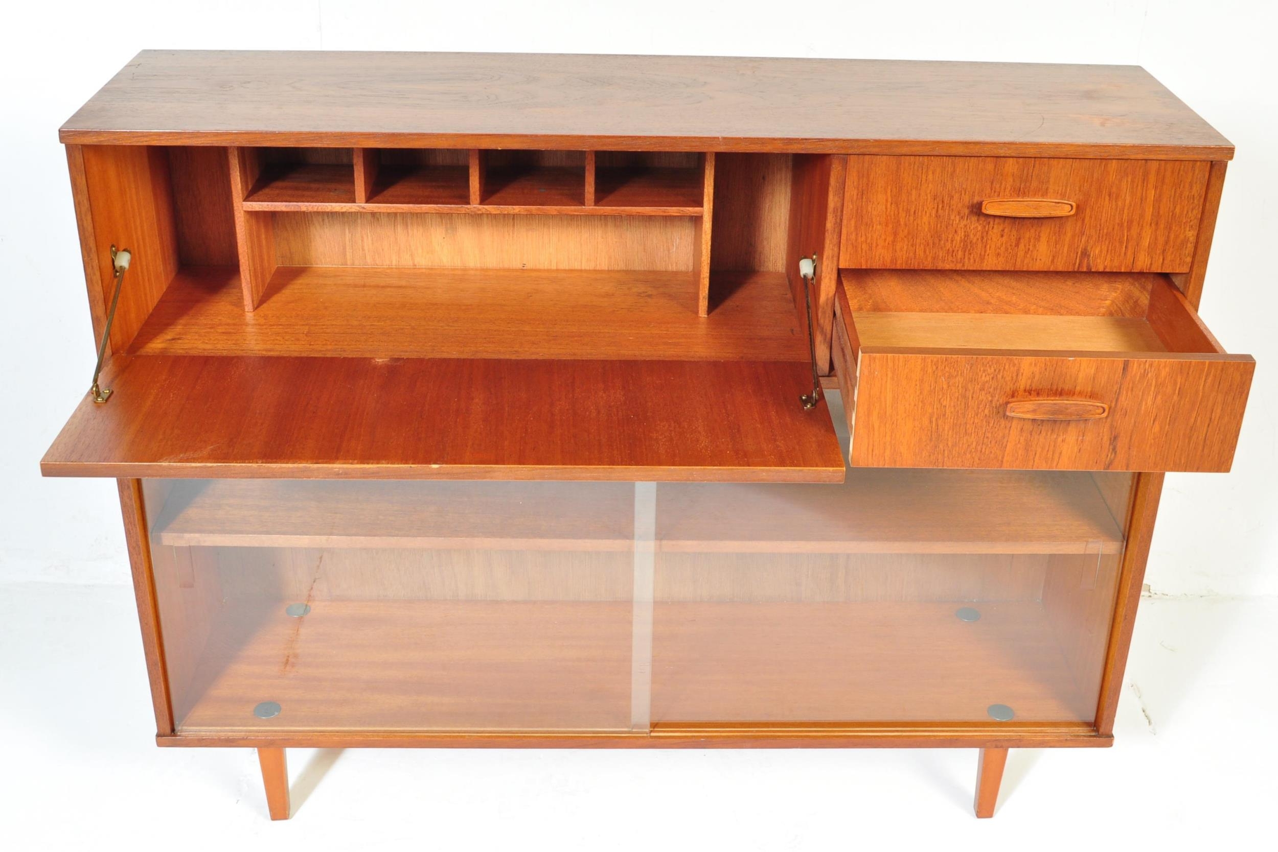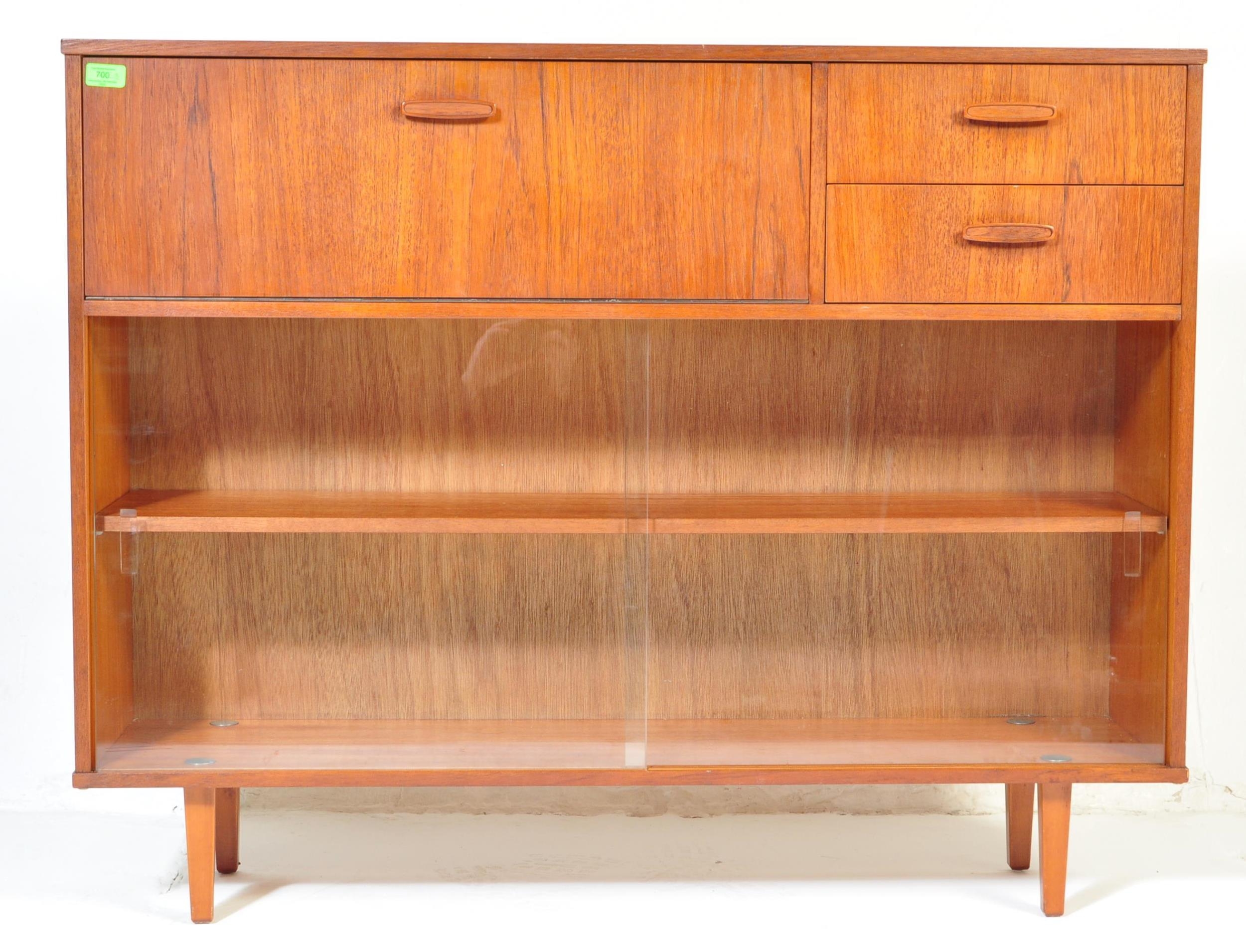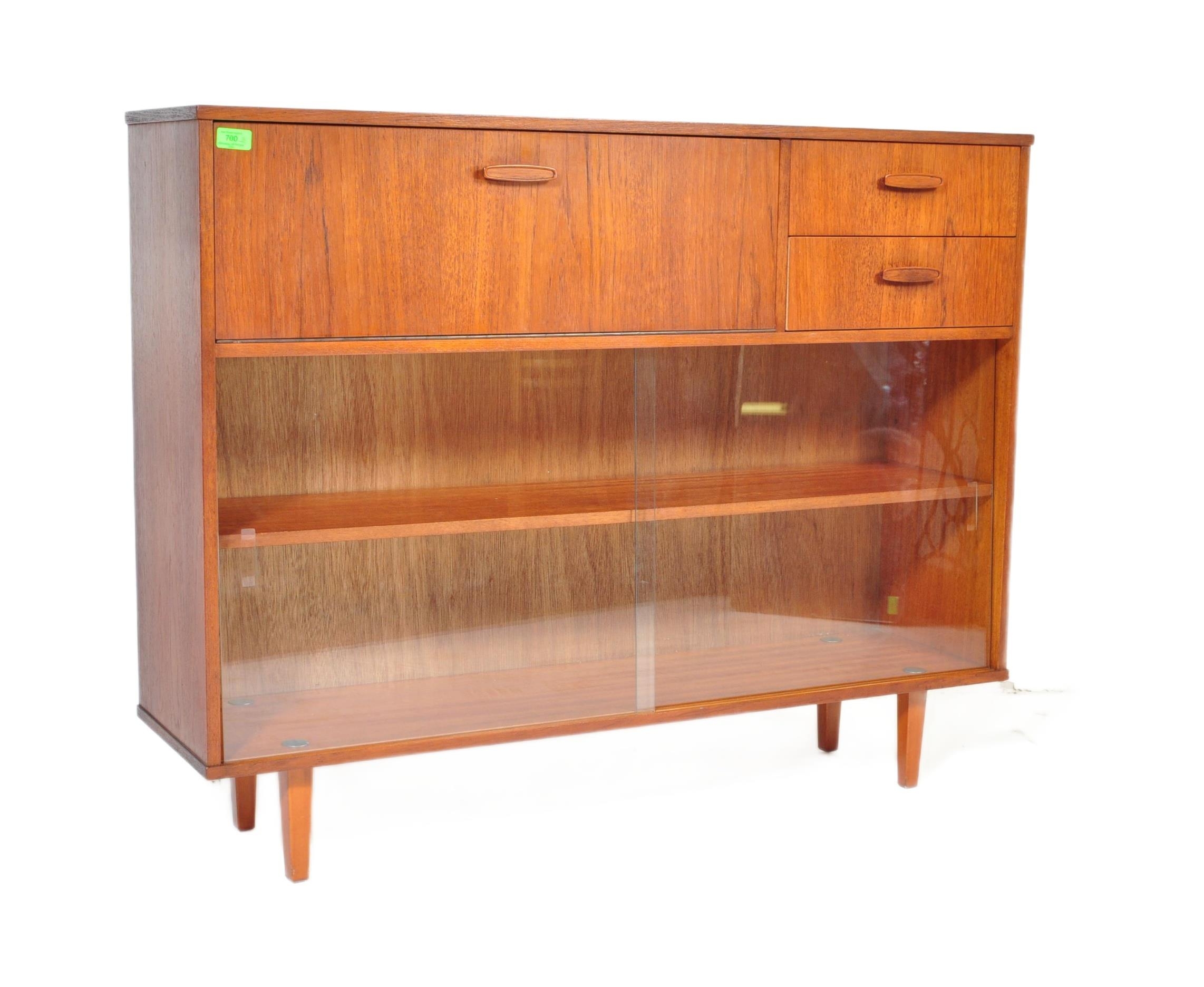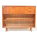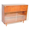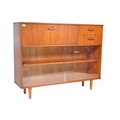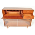 Avalon - Mid 20th Century teak wall unit cabinet. Rectangular form with pull down door to left with two small drawers to right atop two shelves space all supported on stumped tapering square supports. Measures approx. 90cm x 114cm x 31cm.