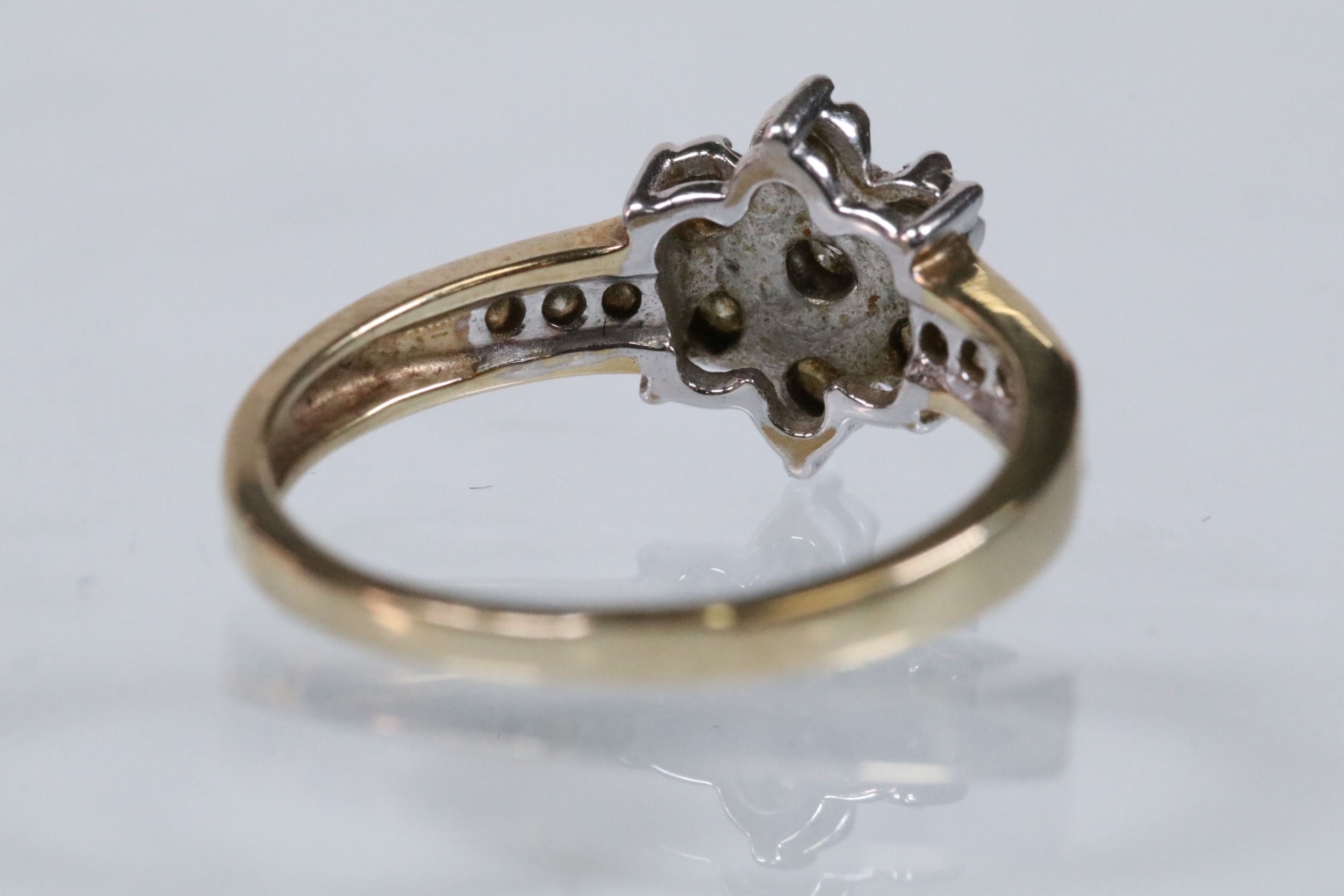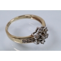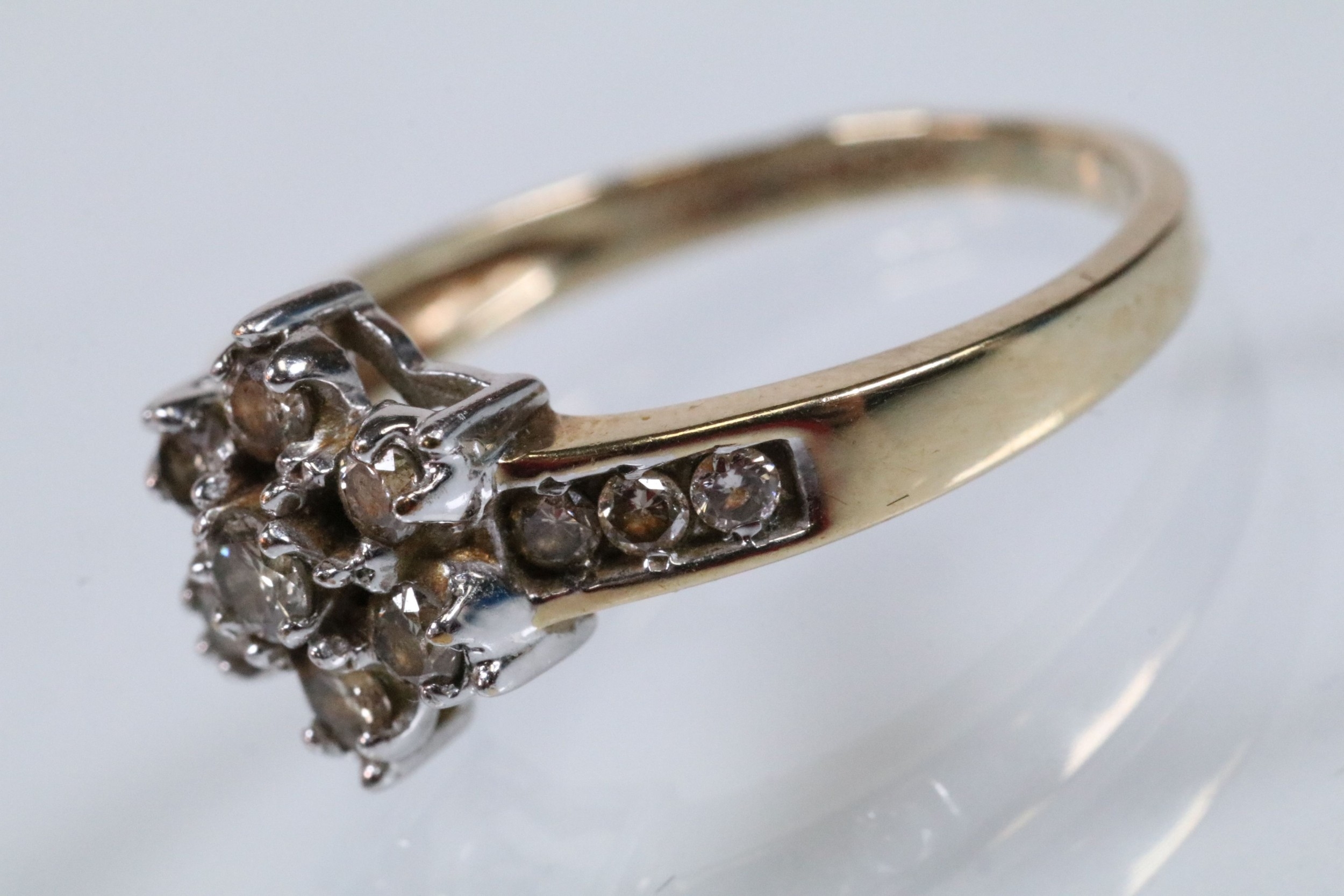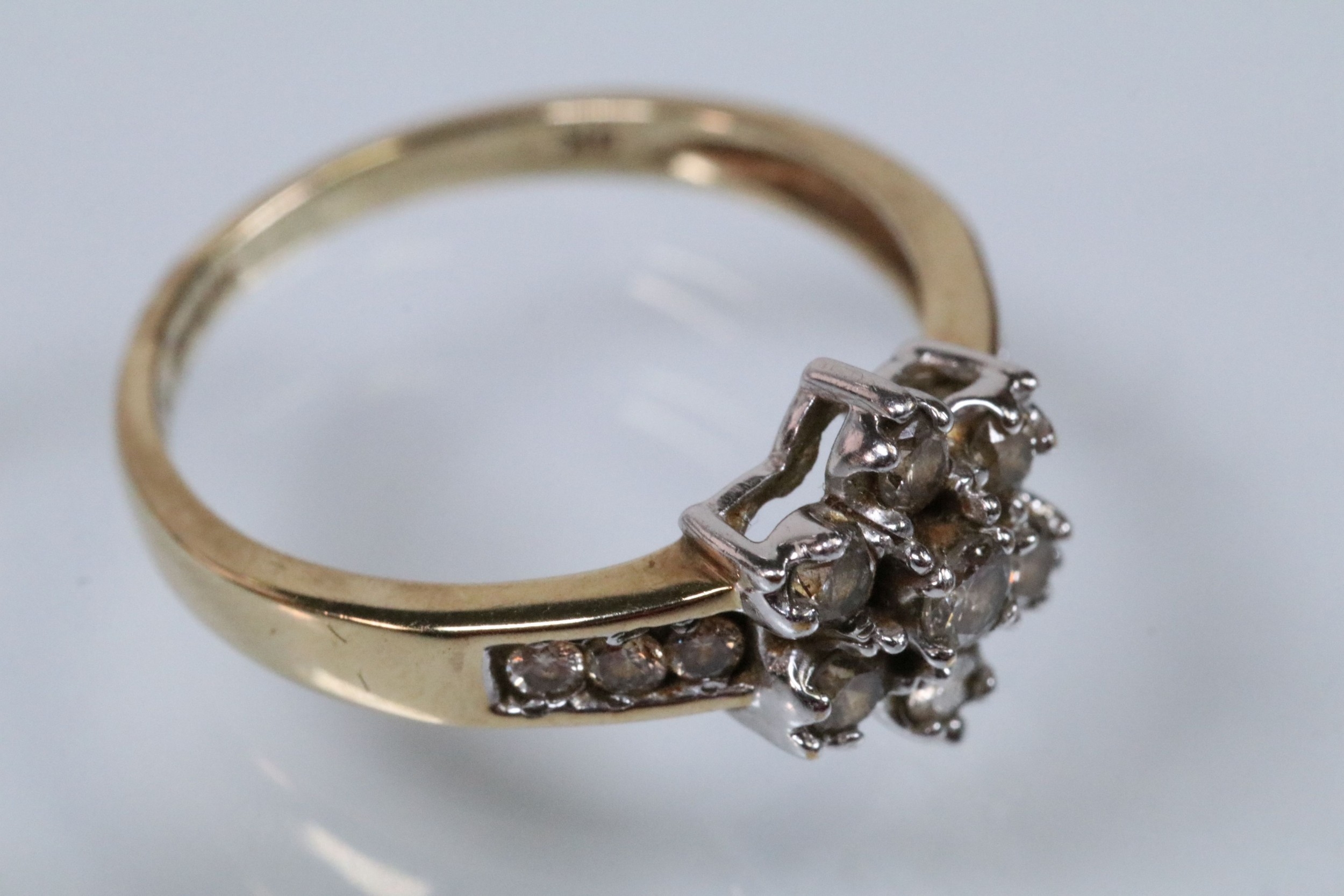 9ct gold and diamond cluster ring. The ring being set with a central cluster of round brilliant cut diamonds with further diamond accents stones set to the shoulders. Hallmarked to shank, marked 0.50ct. Size M.5.