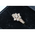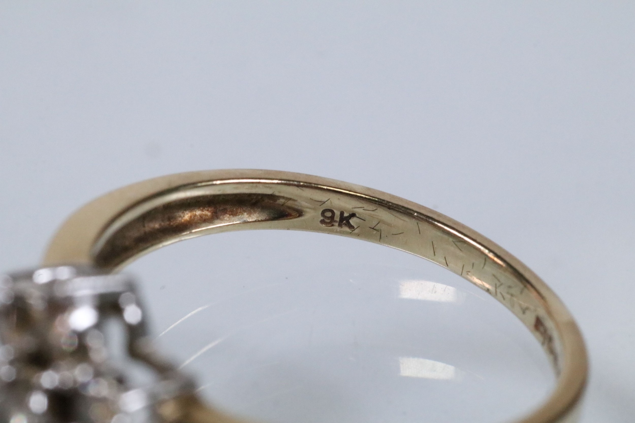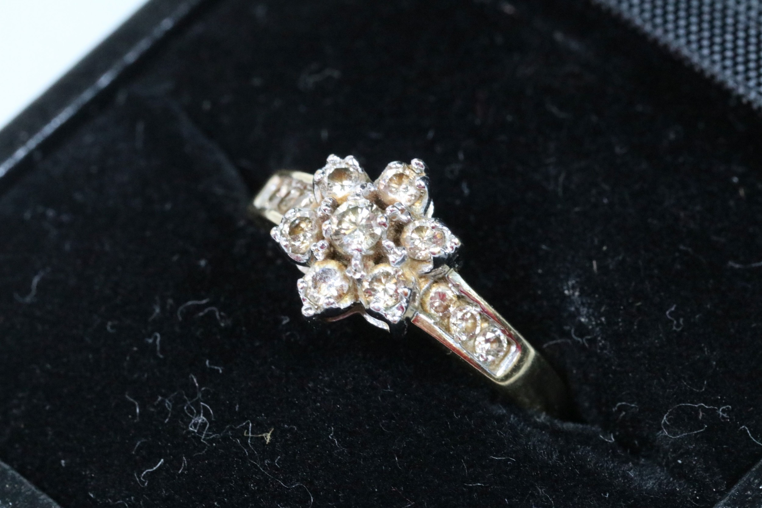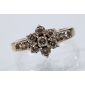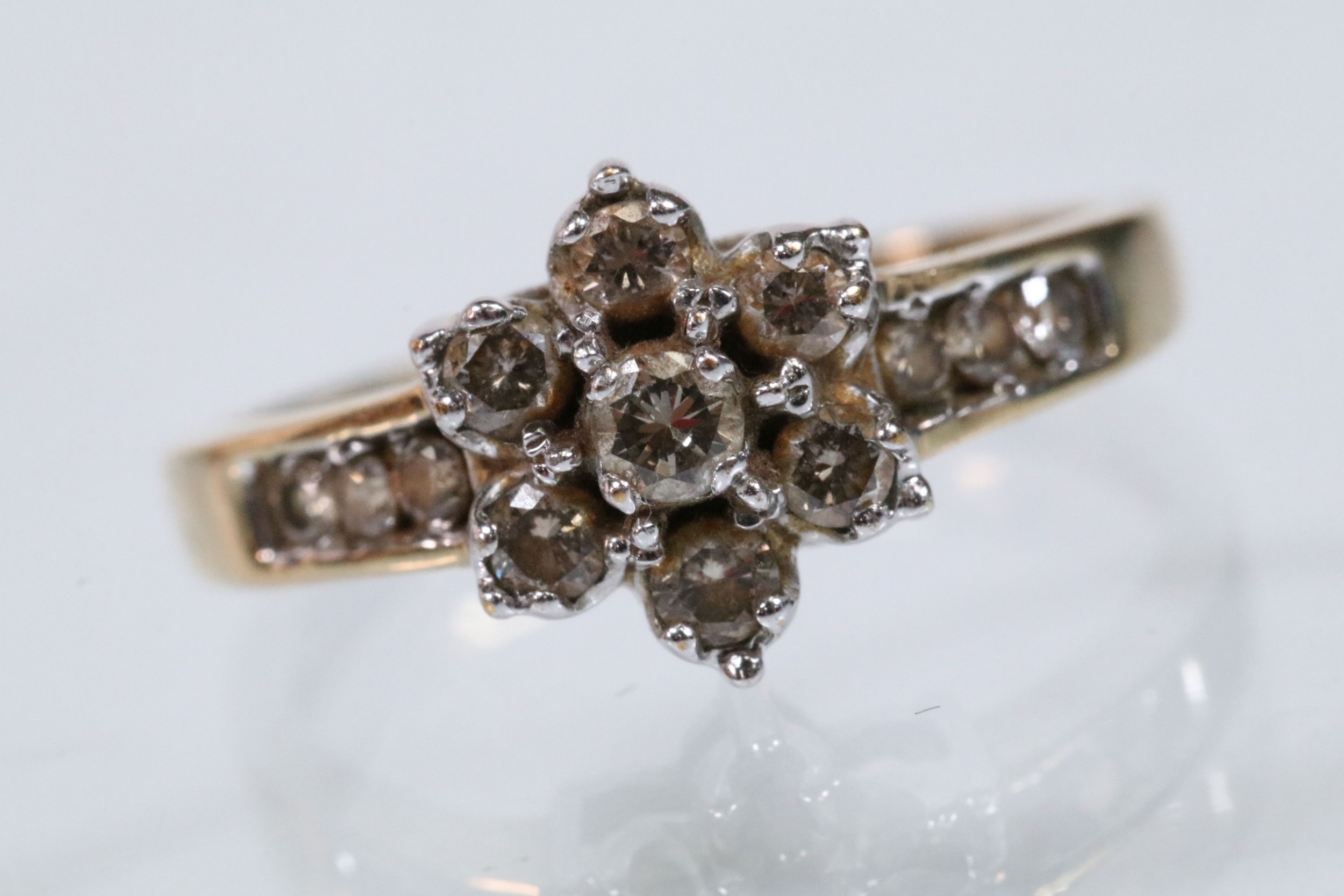 9ct gold and diamond cluster ring. The ring being set with a central cluster of round brilliant cut diamonds with further diamond accents stones set to the shoulders. Hallmarked to shank, marked 0.50ct. Size M.5.