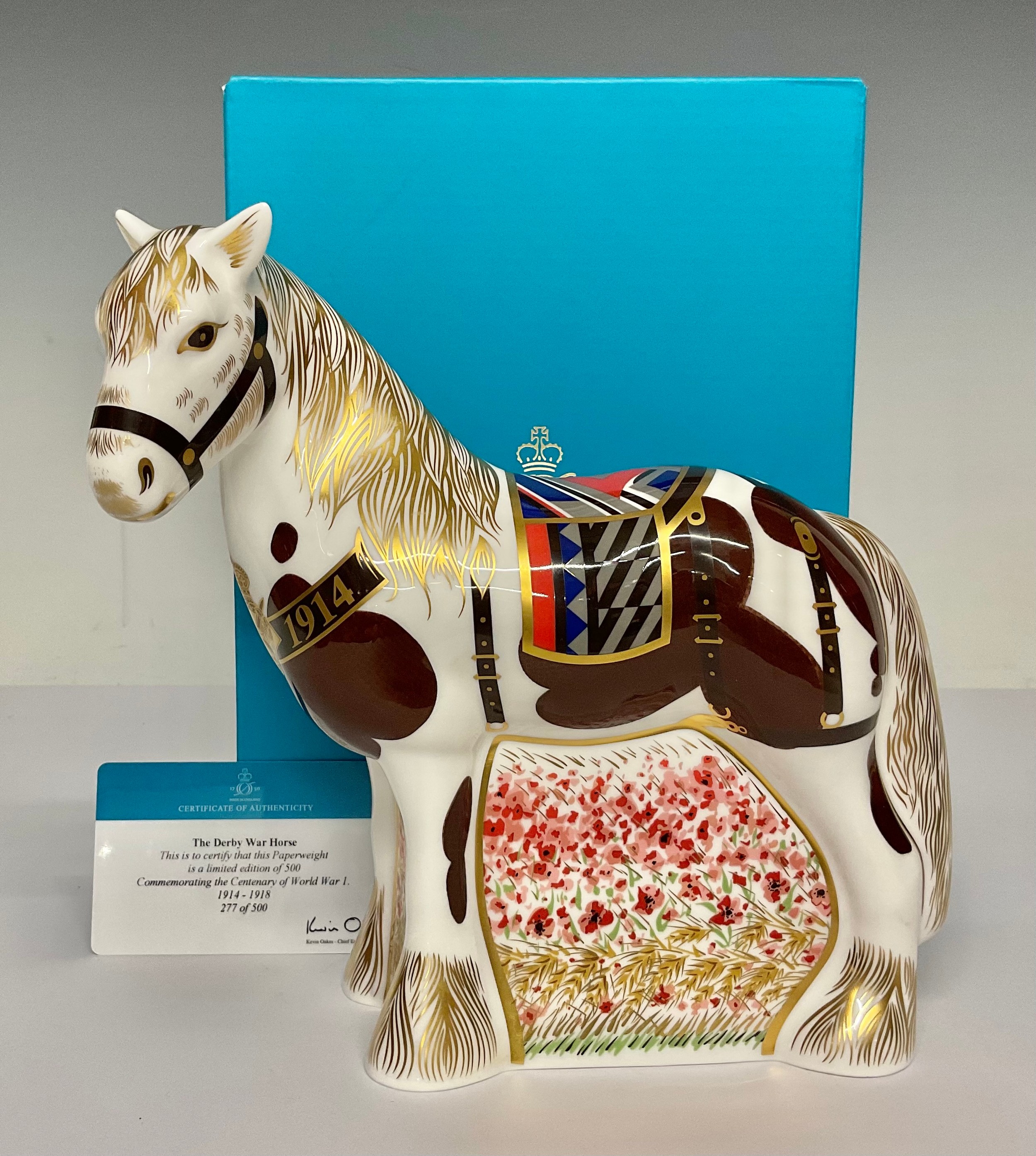 A Royal Crown Derby paperweight, The Derby War Horse, commemorating the centenary of World War 1 1914 - 1918, limited edition 277/500, gold stopper, 20cm high, printed mark in gold, certificate, boxed