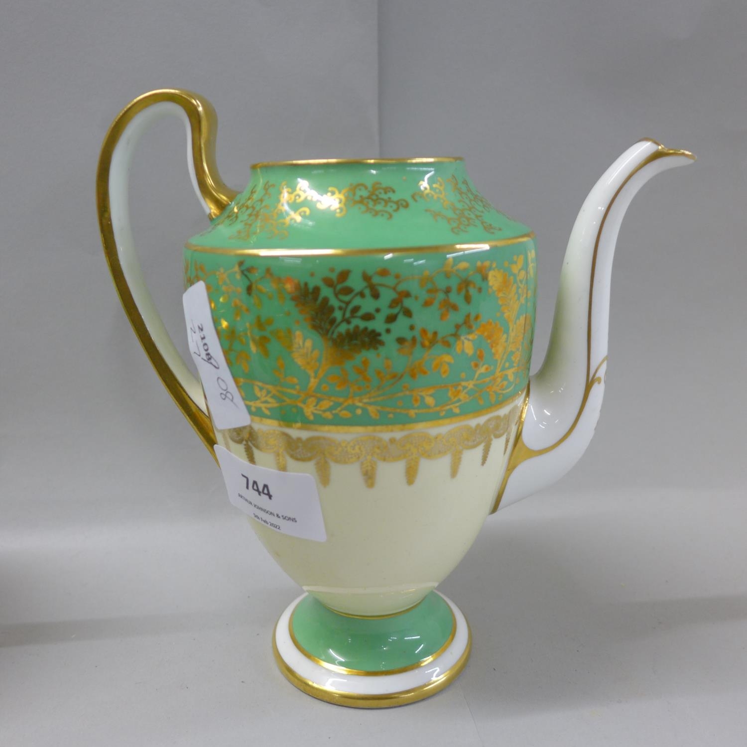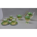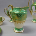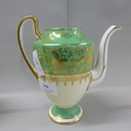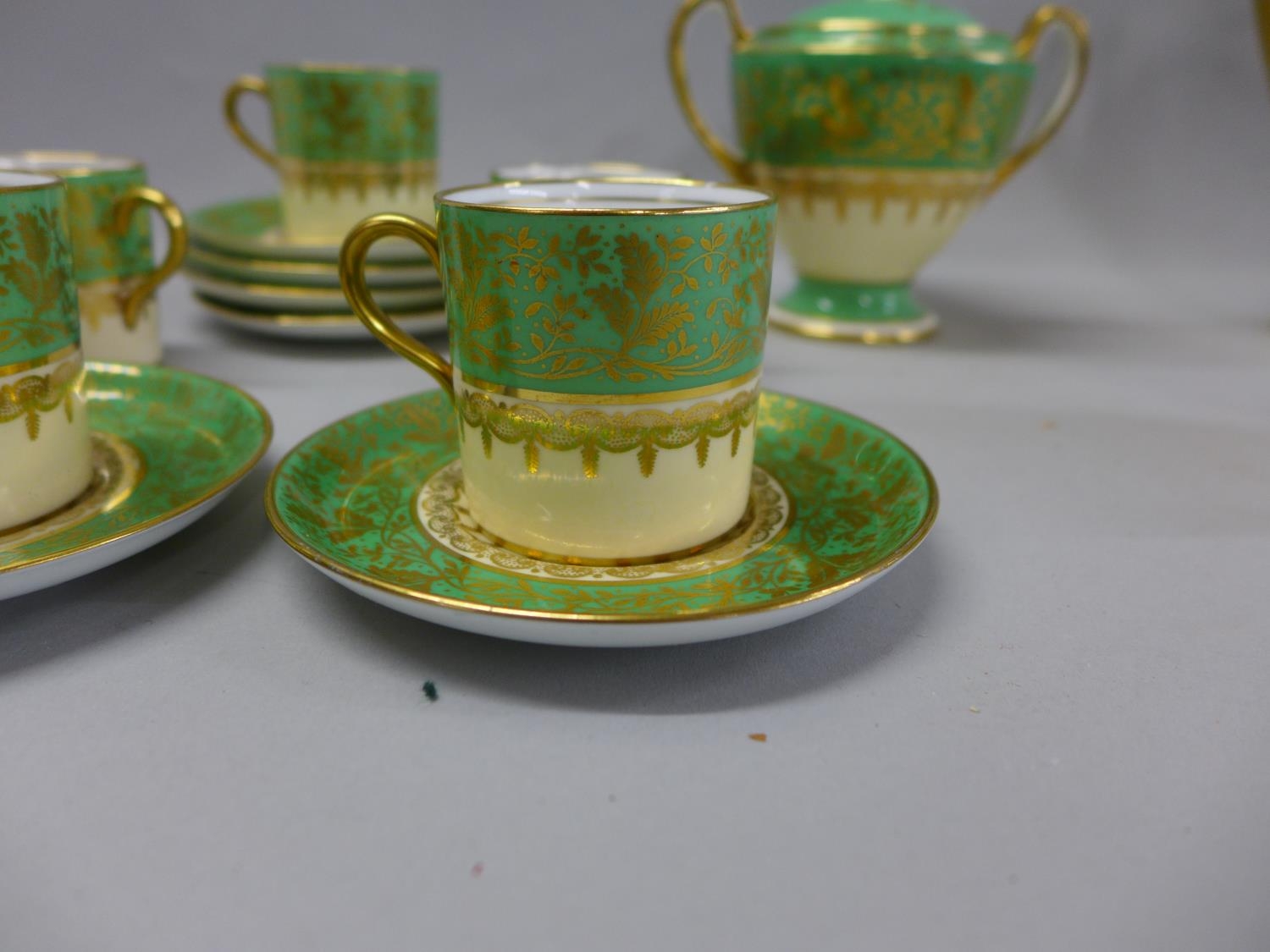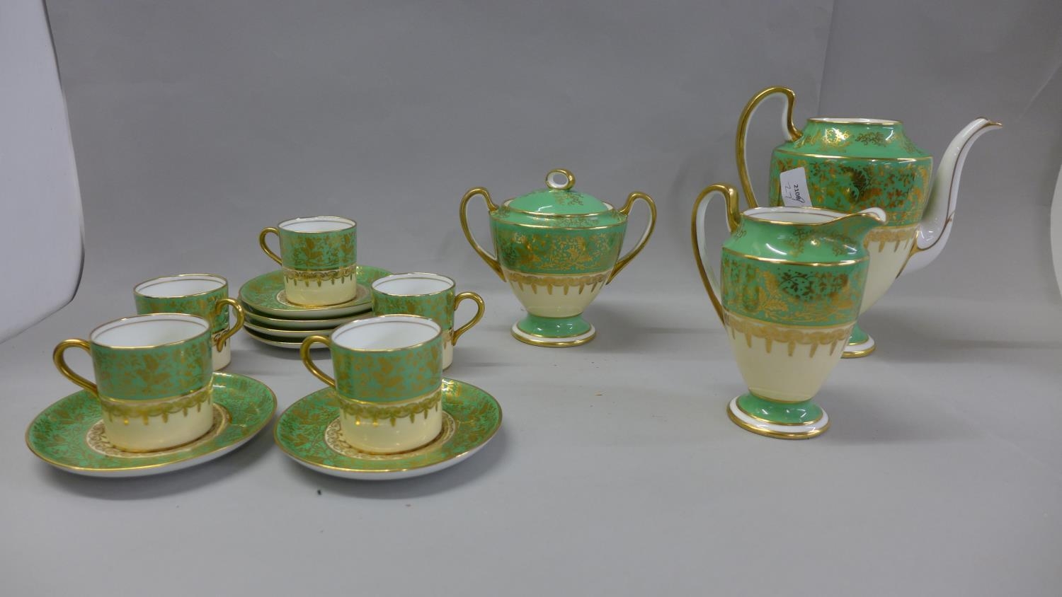 An Aynsley green, gold and white part coffee set comprising five cups, six saucers, cream and sugar and coffee pot, coffee pot lacking lid