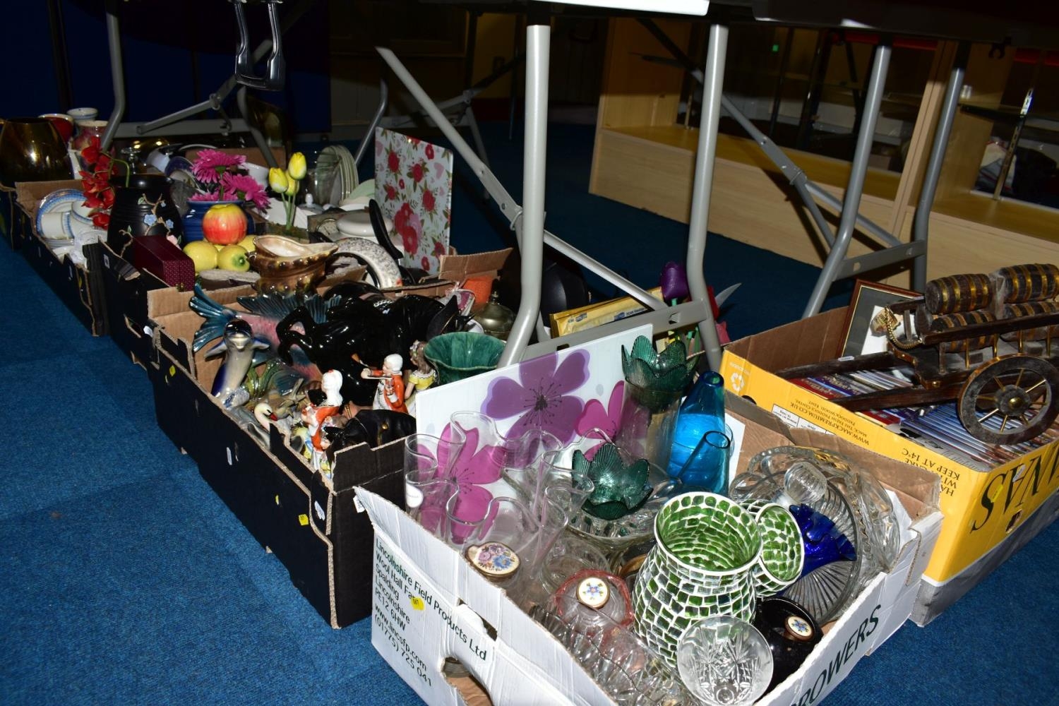 NINE BOXES CERAMICS, GLASS, DVD'S ETC, to include Laurel and Hardy, Bonanza etc