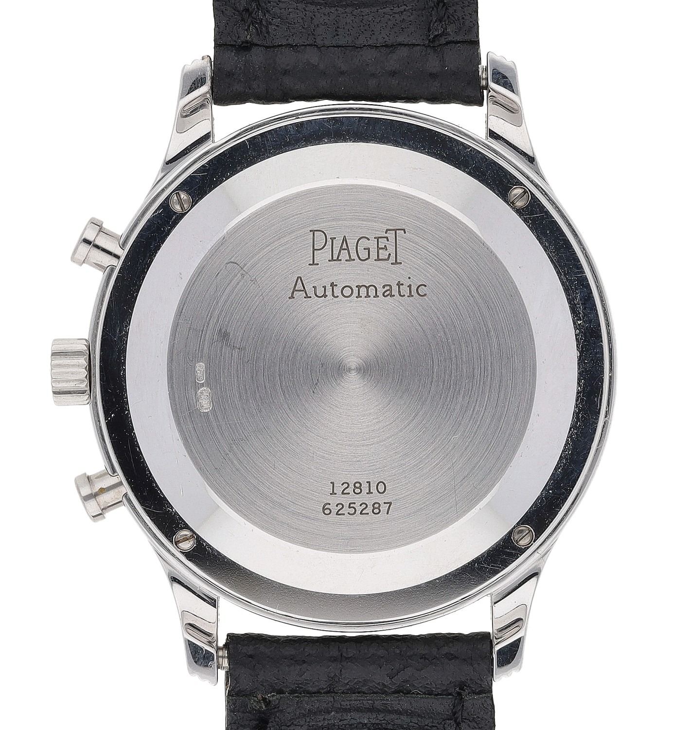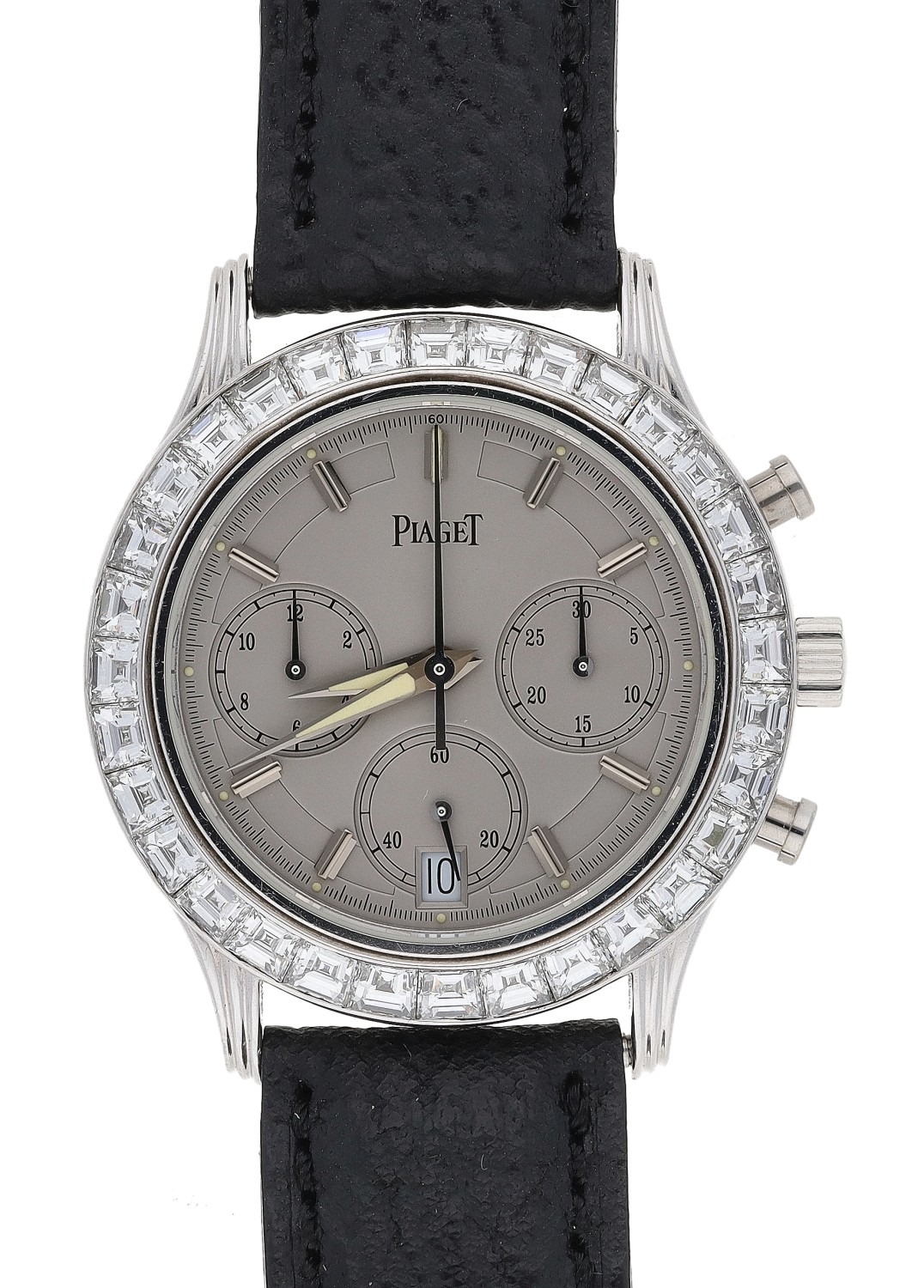 Piaget 18ct white gold Chronograph automatic gentleman's wristwatch, reference no. 12810, serial no. 625xxx, grey dial, after market set diamond bezel, Morellato black leather strap, 35mm (lacking strap buckle) (ref: 341)