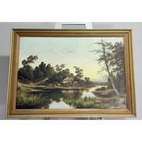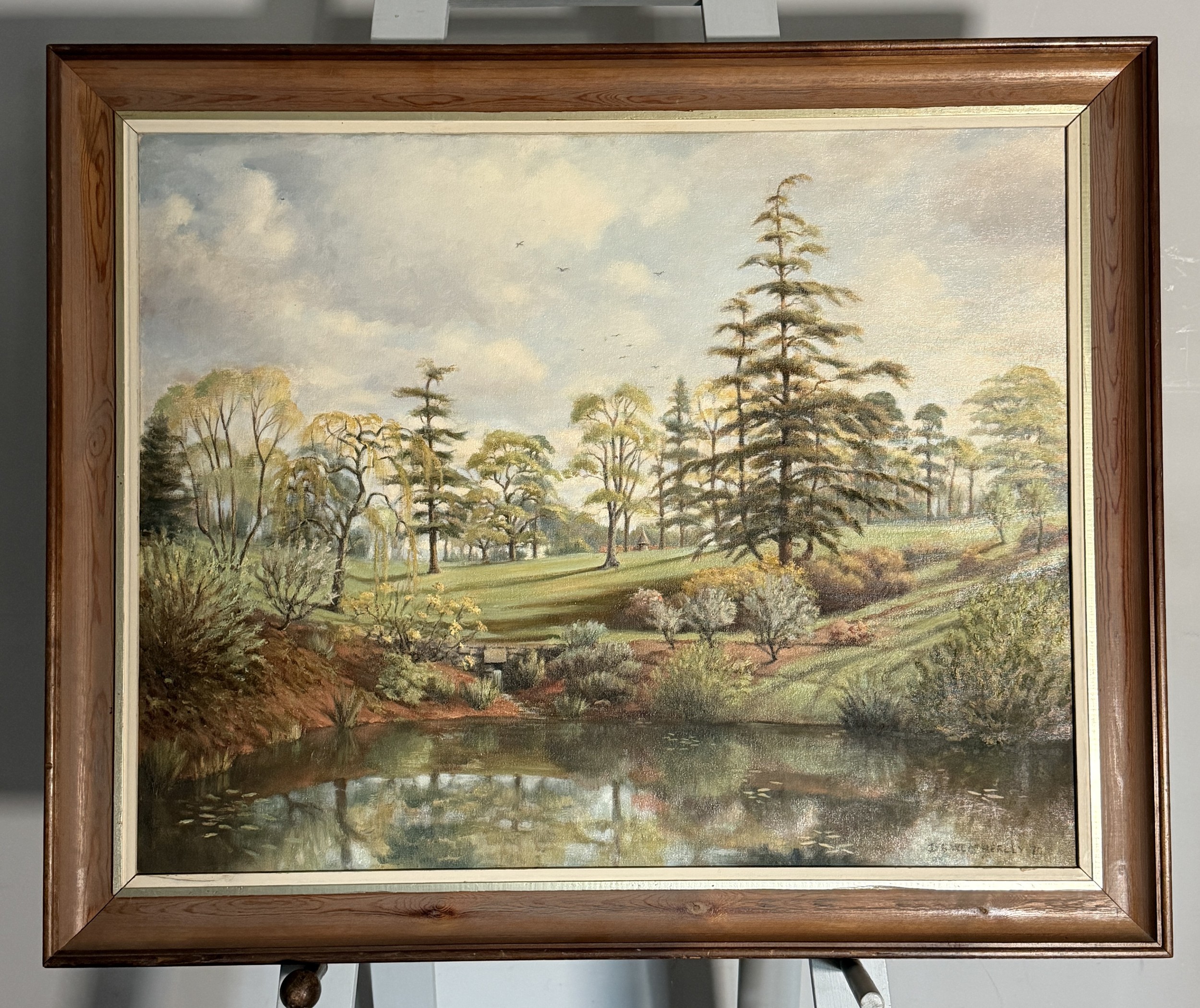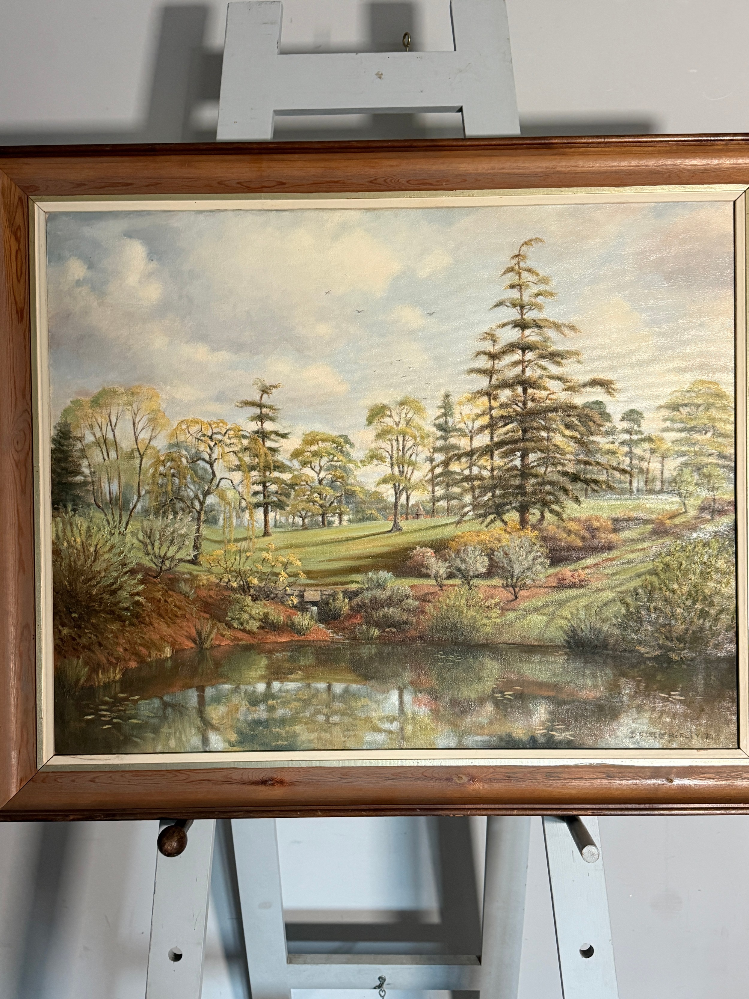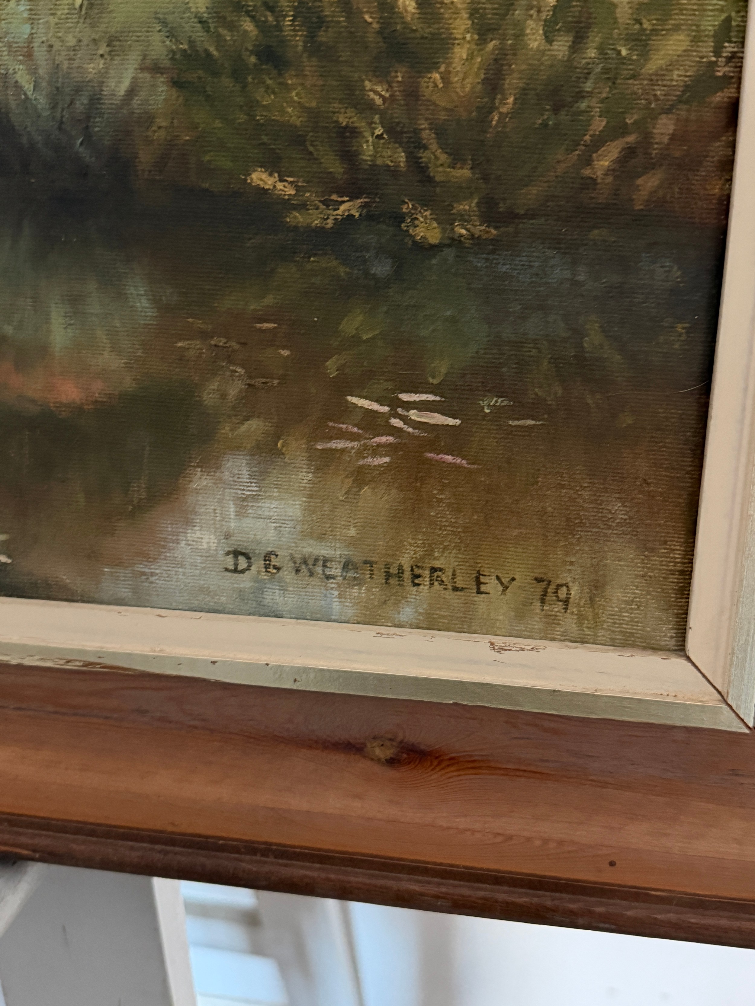 Dudley Graham Weatherley (1912-2004), oil on canvas, The Willow Garden and Pond, Tiverton, signed and dated, 60 cm x 75 cm, framed.