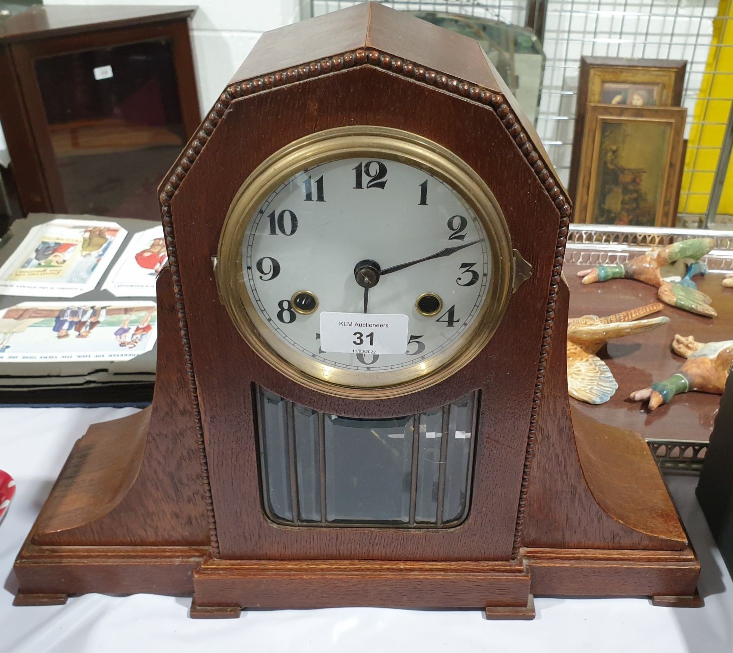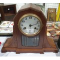 An early 20th century oak cased mantel clock. No in-house shipping. Please arrange collection or your own packer and shipper.