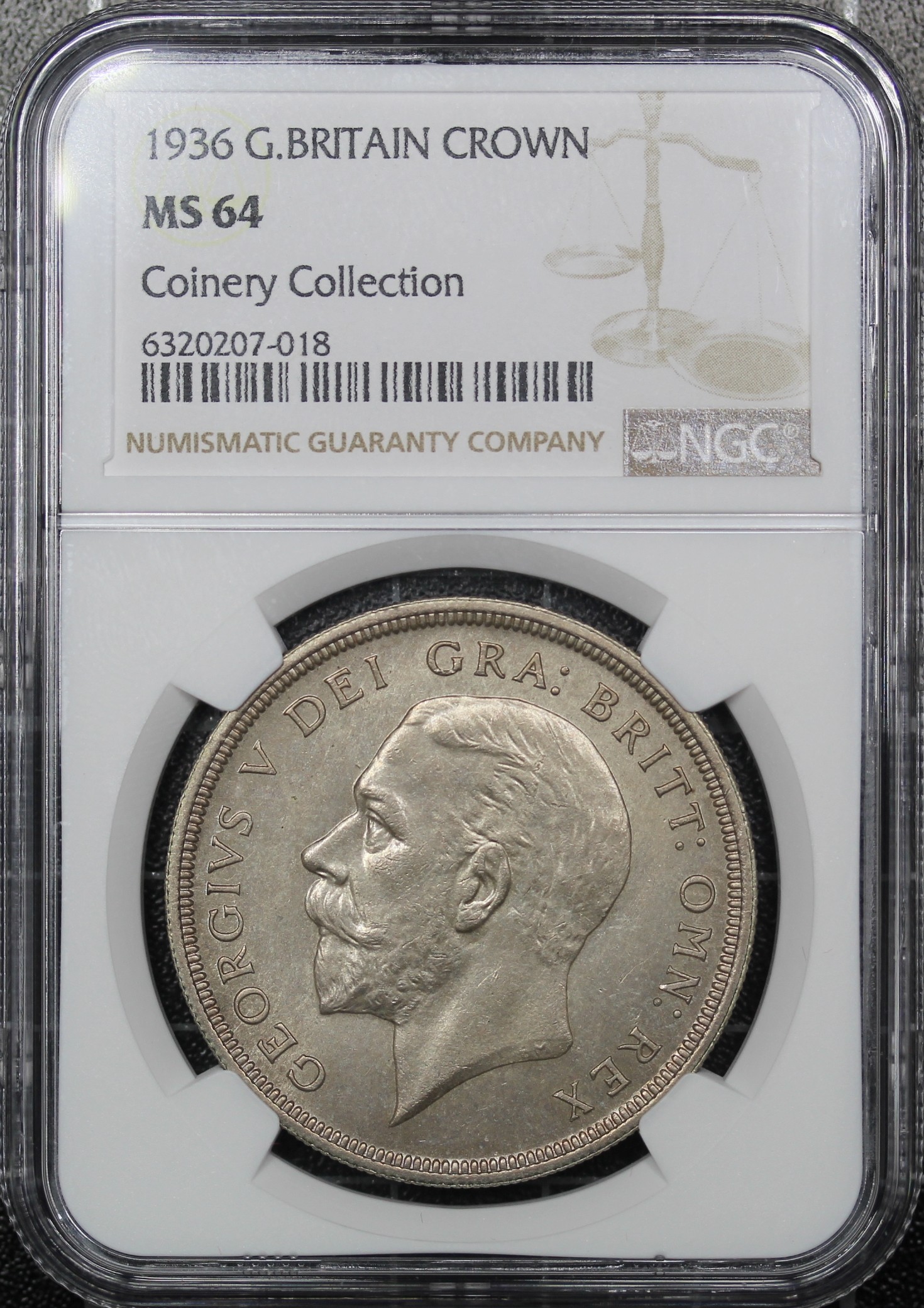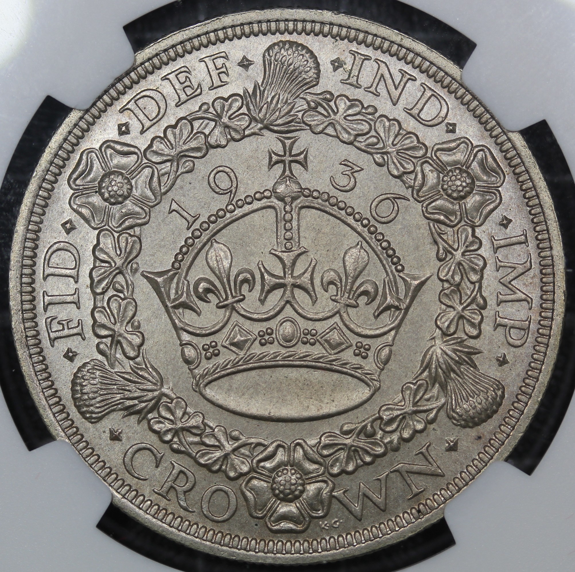 1936 Wreath Crown, George V (ESC 381, Bull 3649, S.4036). Graded NGS MS64, UNC, with attractive grey toning over soft lustre and presented in a Coinery Collection holder. 1936 crowns are notoriously difficult to find at the highest level demonstrated by the fact that just 8 sit at MS64 across both US graders, with only one coin certified higher. One of just 2,473 coins struck and perhaps the scarcest year offered to open market after the 1934.