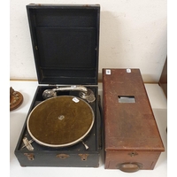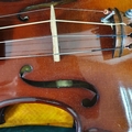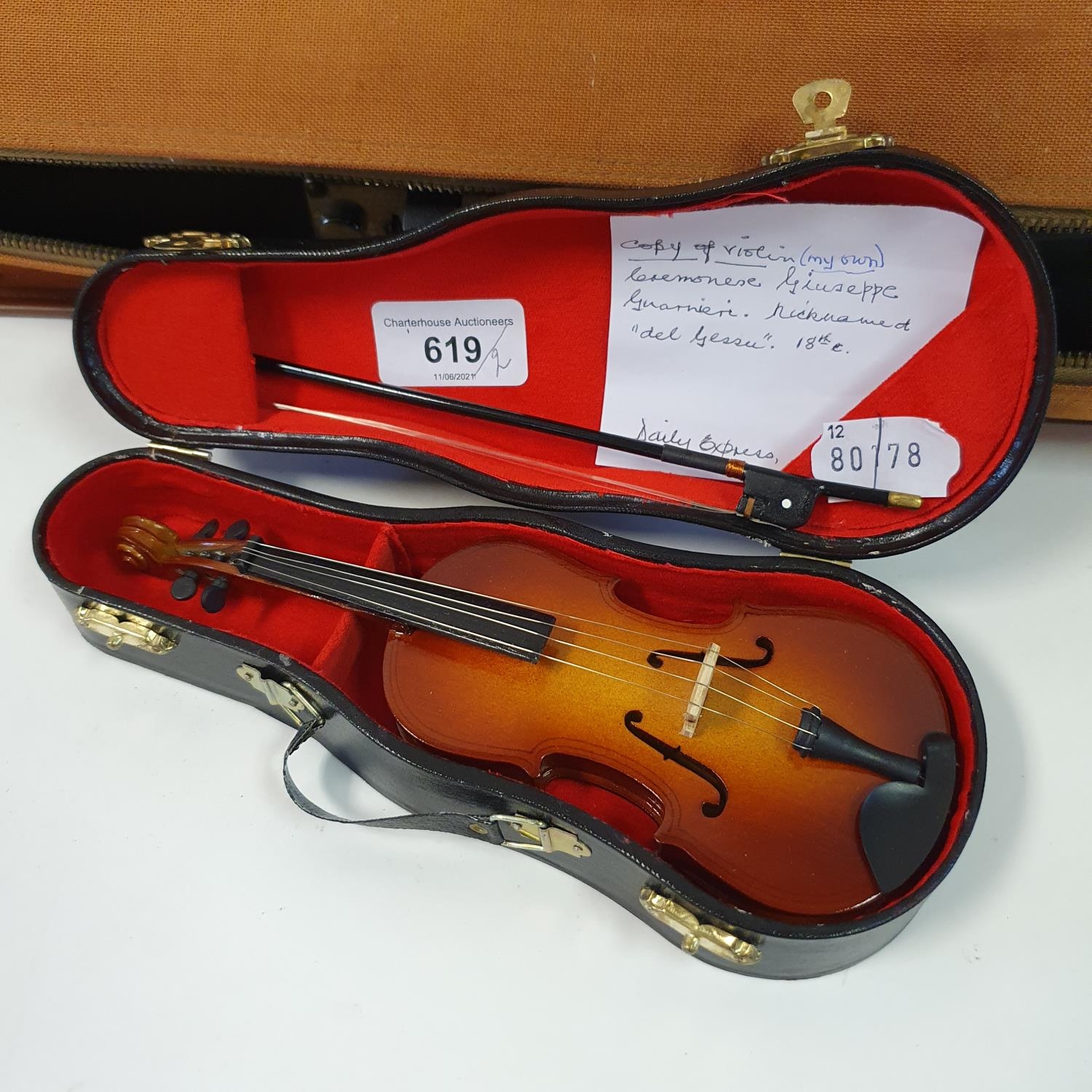 A Chinese violin, with a two piece back, three bows, in case and a miniature violin and bow, in a case (2)