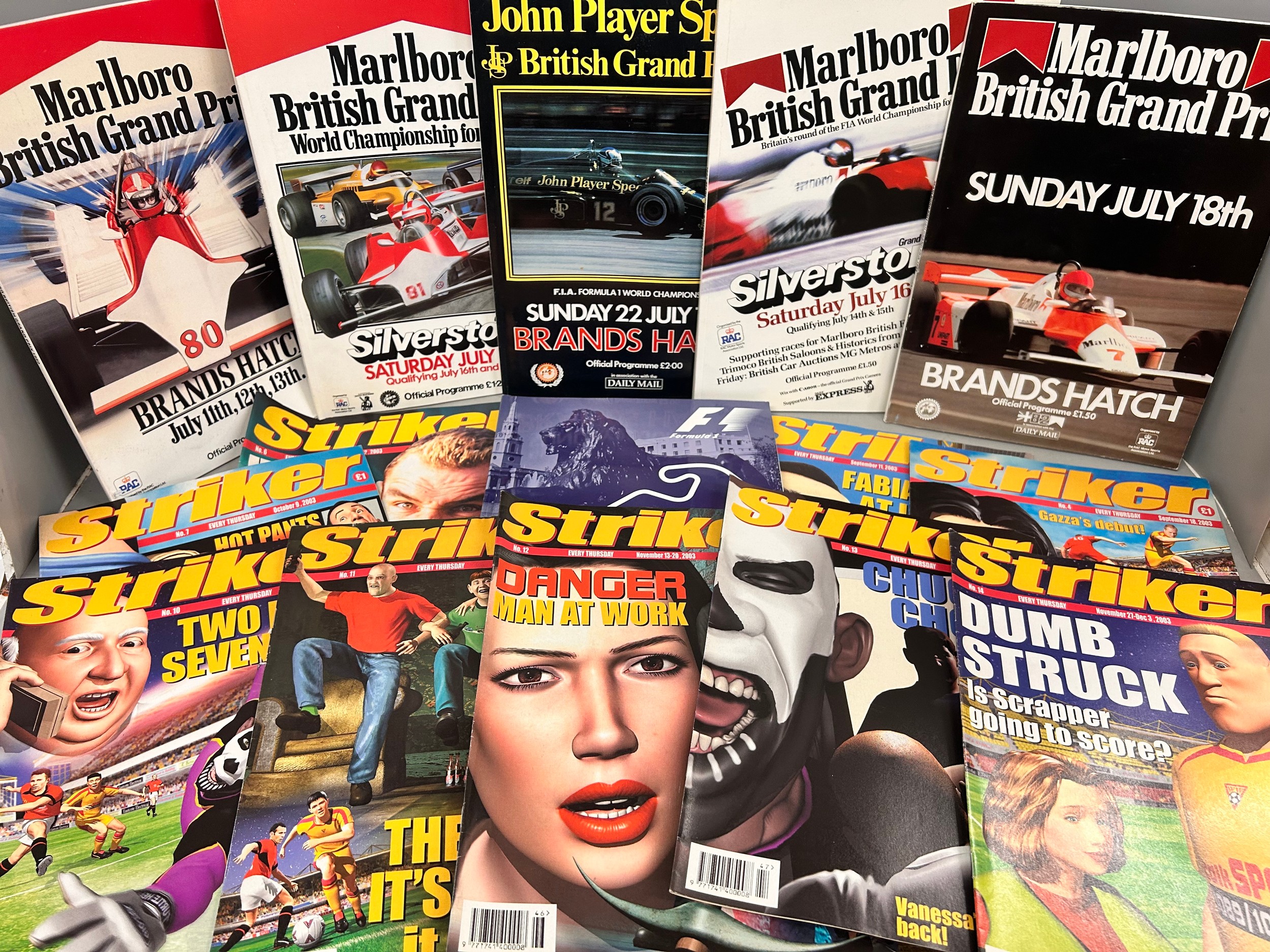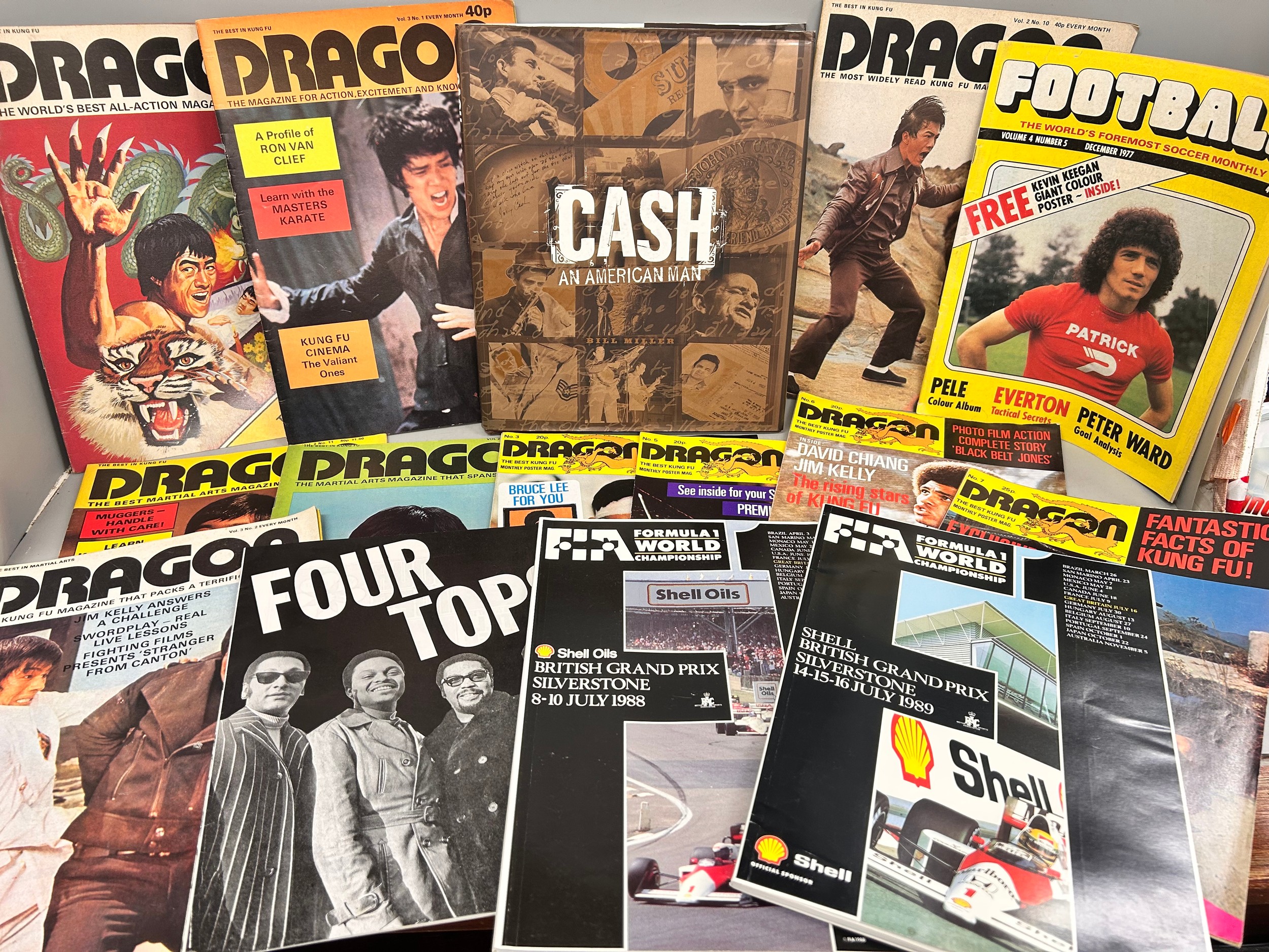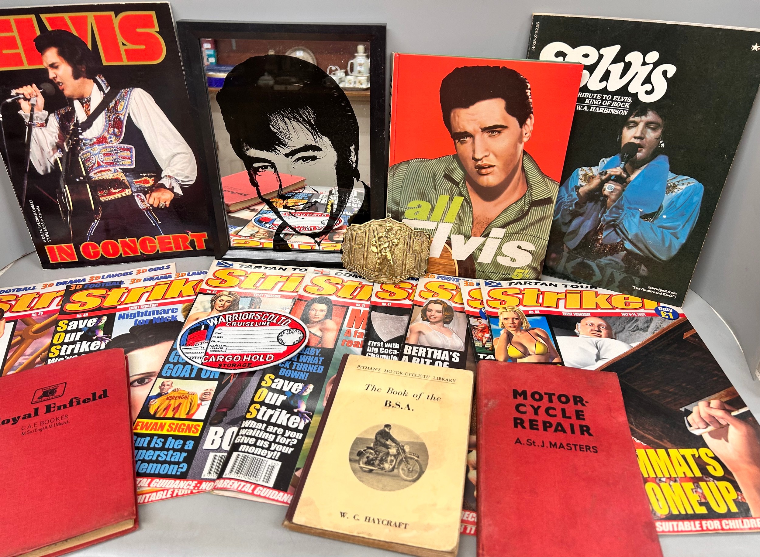 A collection of martial art publications including Dragon, British GP Formula 1 programmes, Striker, The Book of the BSA and a Royal Enfield book, Elvis collectables including a brass buckle and books