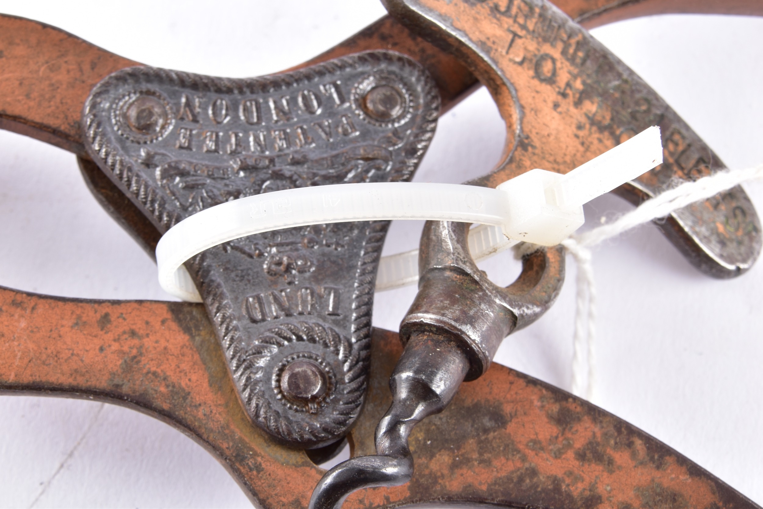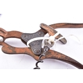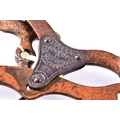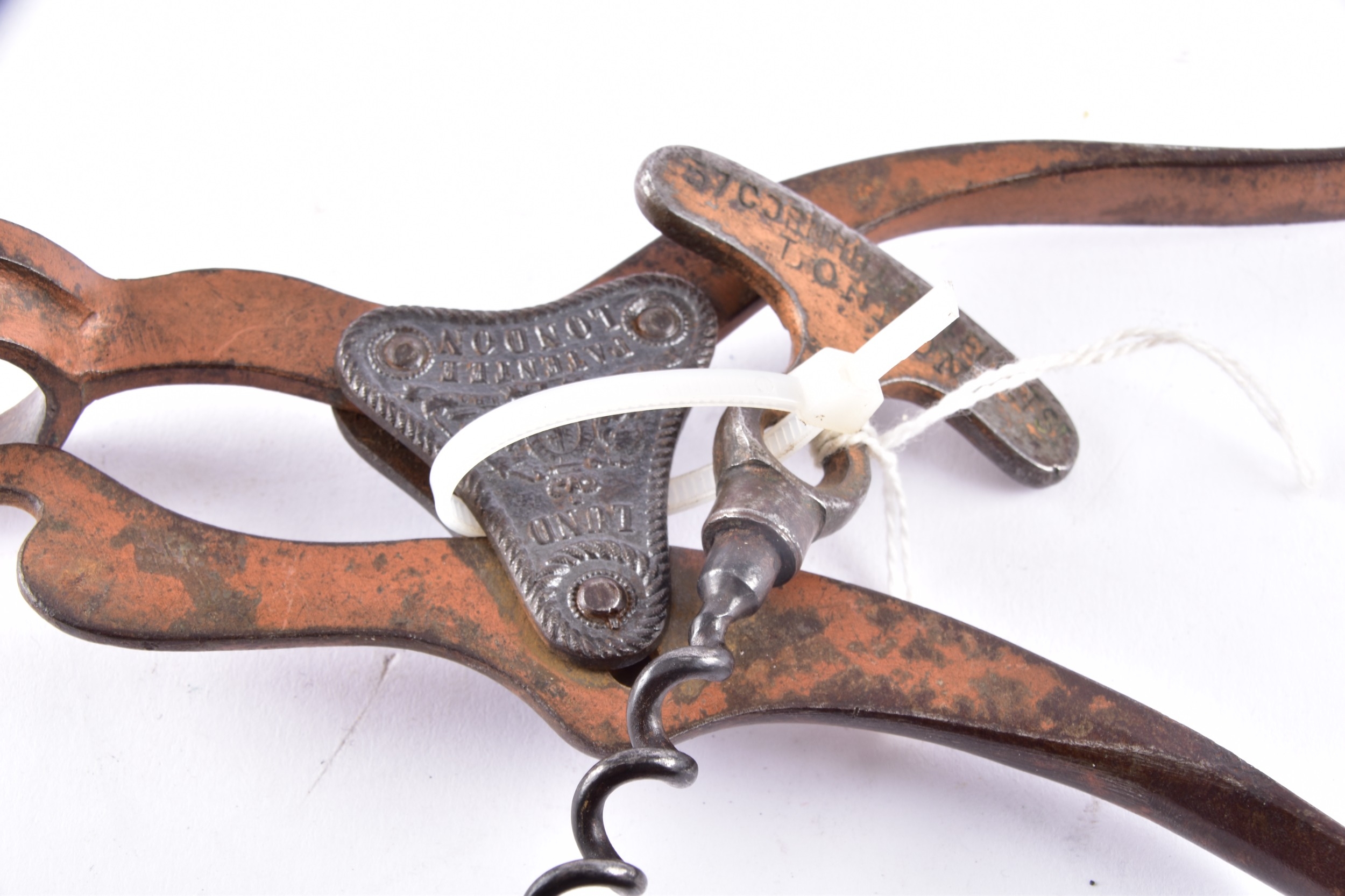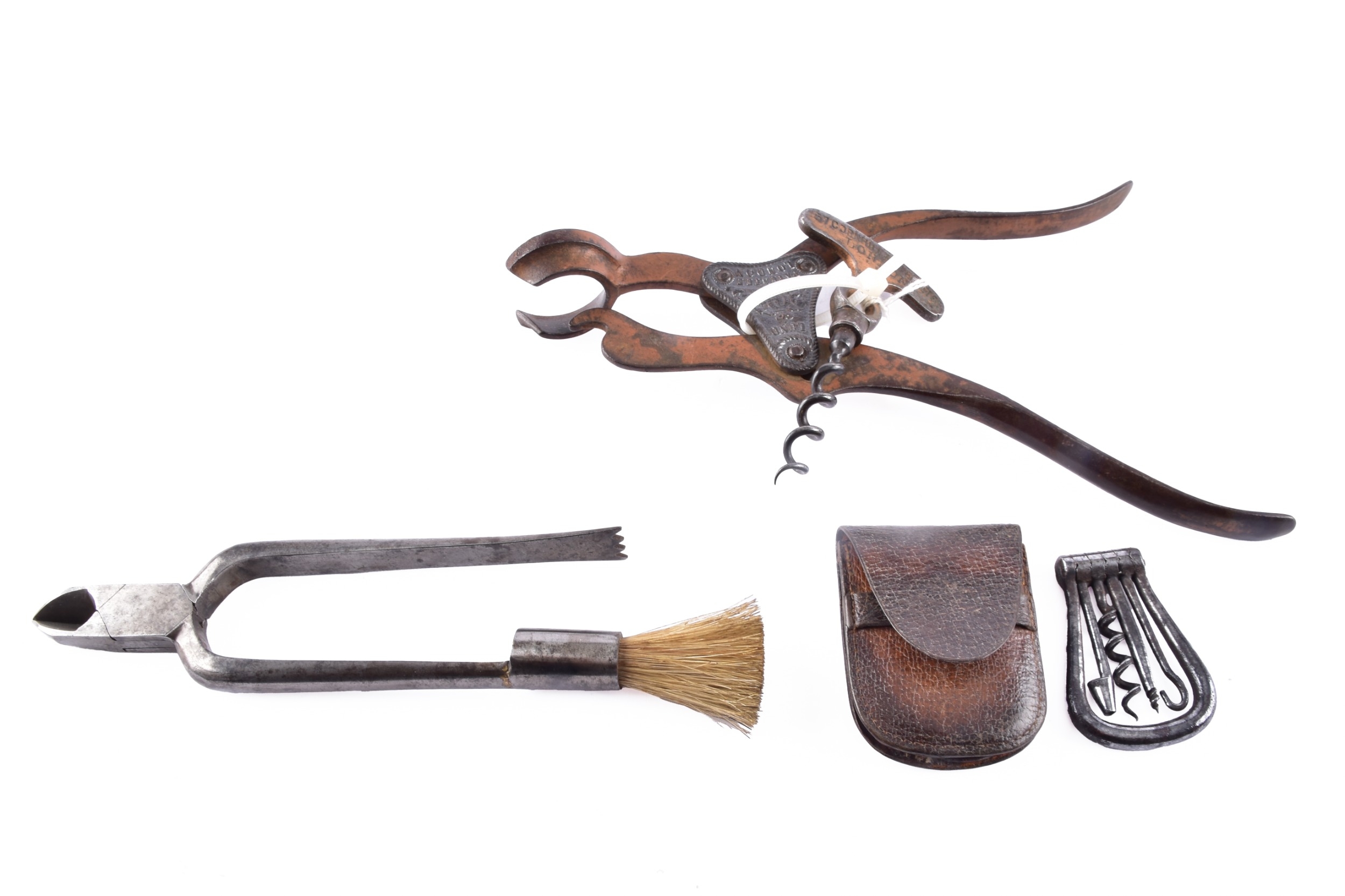A pair of champagne nippers, featuring pliers at one end to cut the wire and an integrated dusting brush, a Lund's Patent lever corkscrew, together with a 19th century folding bow corkscrew in a leather case by C.Baretti.