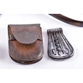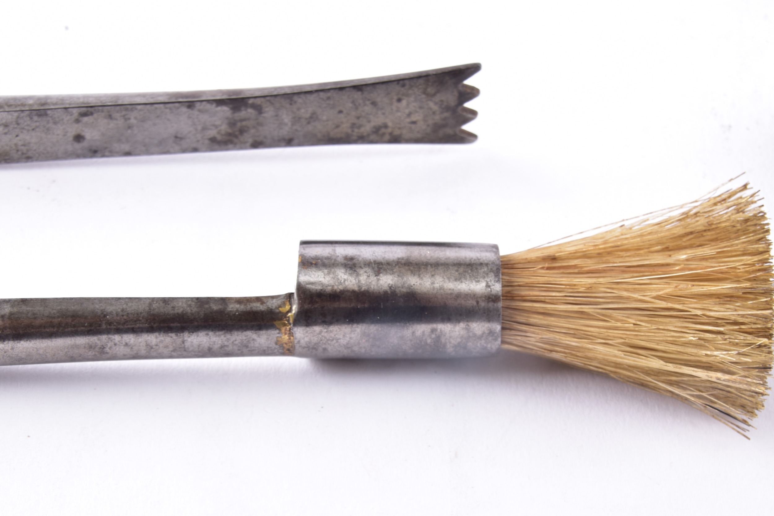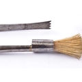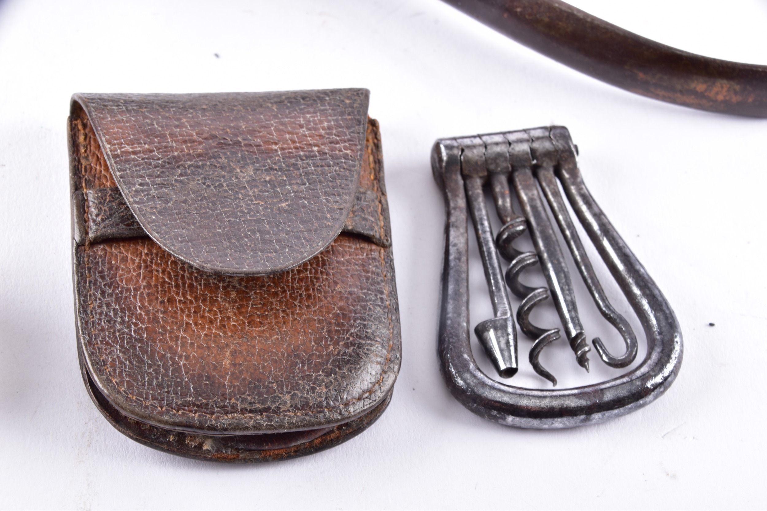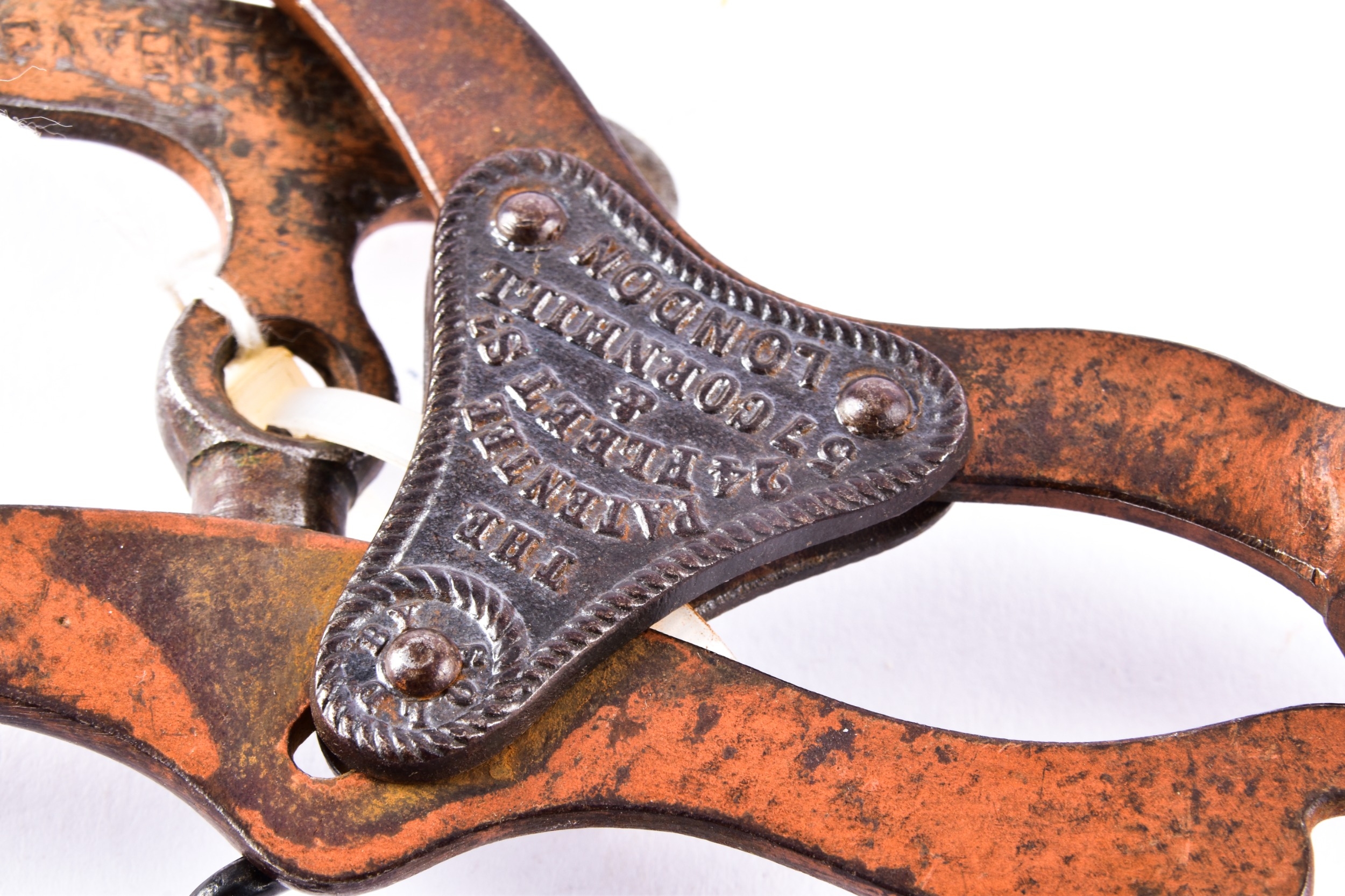 A pair of champagne nippers, featuring pliers at one end to cut the wire and an integrated dusting brush, a Lund's Patent lever corkscrew, together with a 19th century folding bow corkscrew in a leather case by C.Baretti.