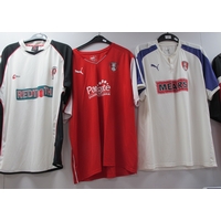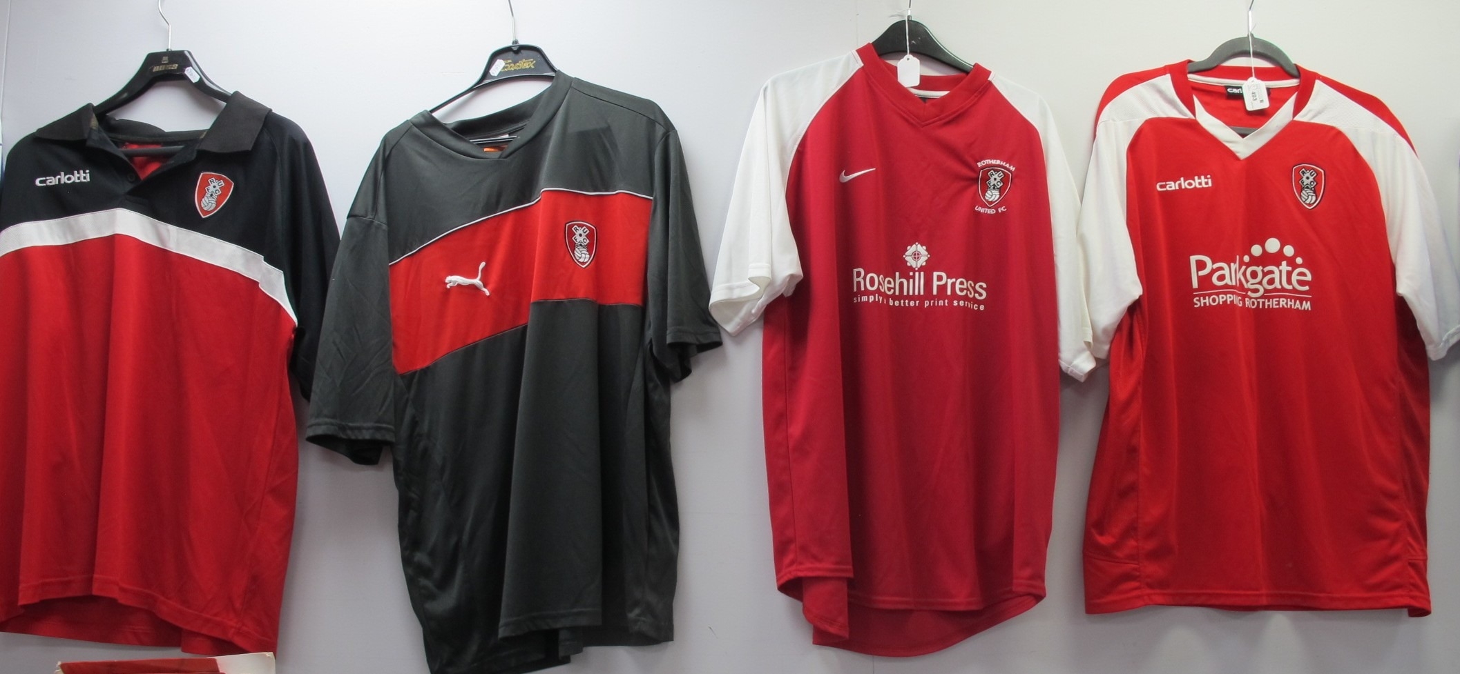 Rotherham United Red Home Shirts Carlotti bearing 'Parkgate' logo, Nike with 'Rosehill Press' logo, both size XL, Puma and Carlotti t-shirts (4).