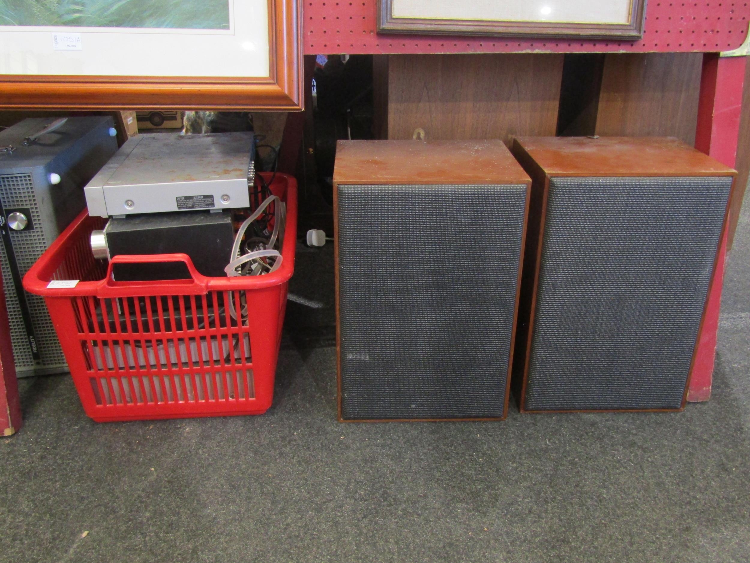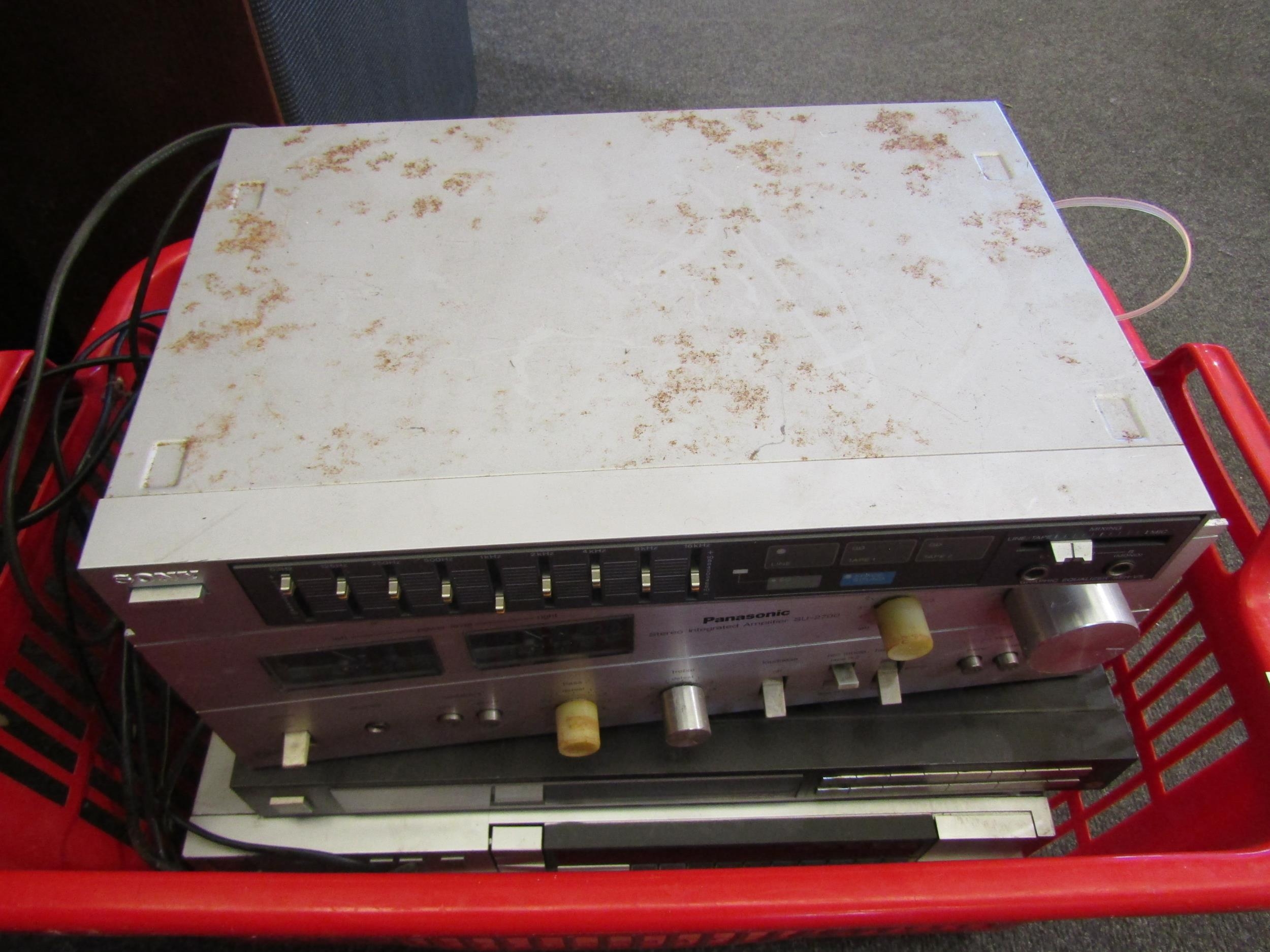 Audio equipment including Hi Fi separates: Panasonic amp, Technics CD player, Akai + Technics tuners, Sony graphic equalizer, Fidelity record player and Realistic speakers. All a/f