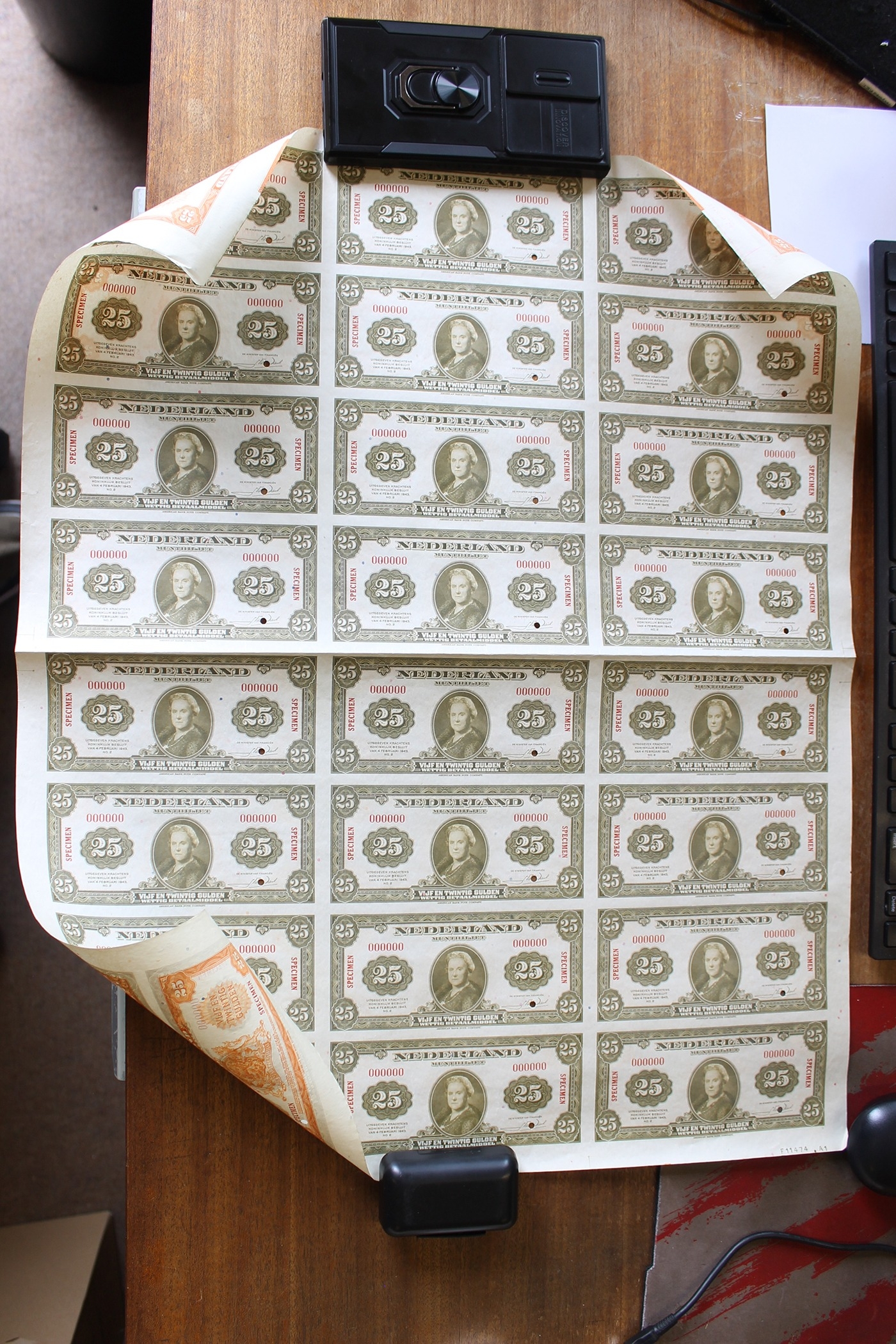 Netherlands. Muntbiljet 1943 25 gulden olive 00000 overprinted "SPECIMEN" in red sheet of 24 annotated F11474 2/24/44 good extremely fine. (Krause 67s) (R)