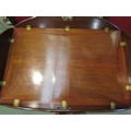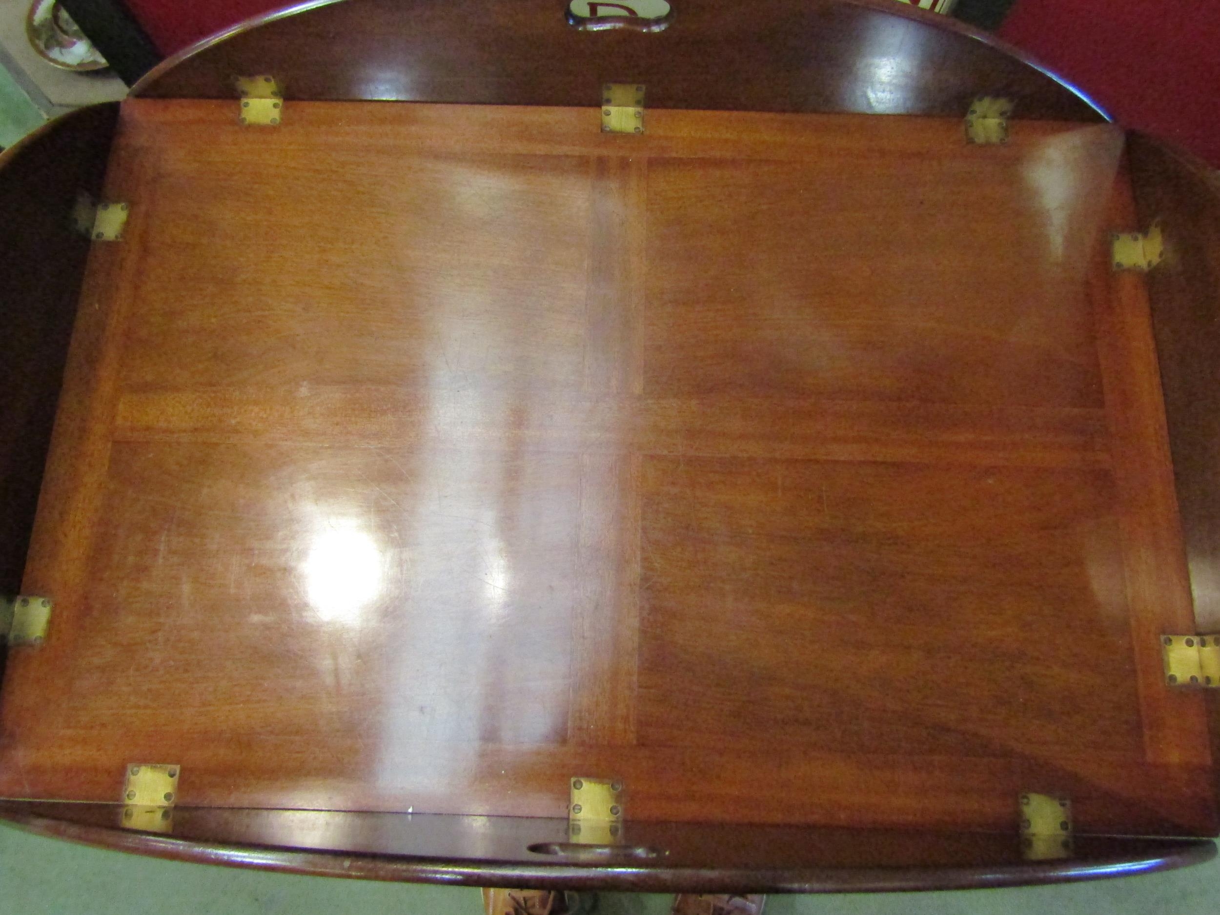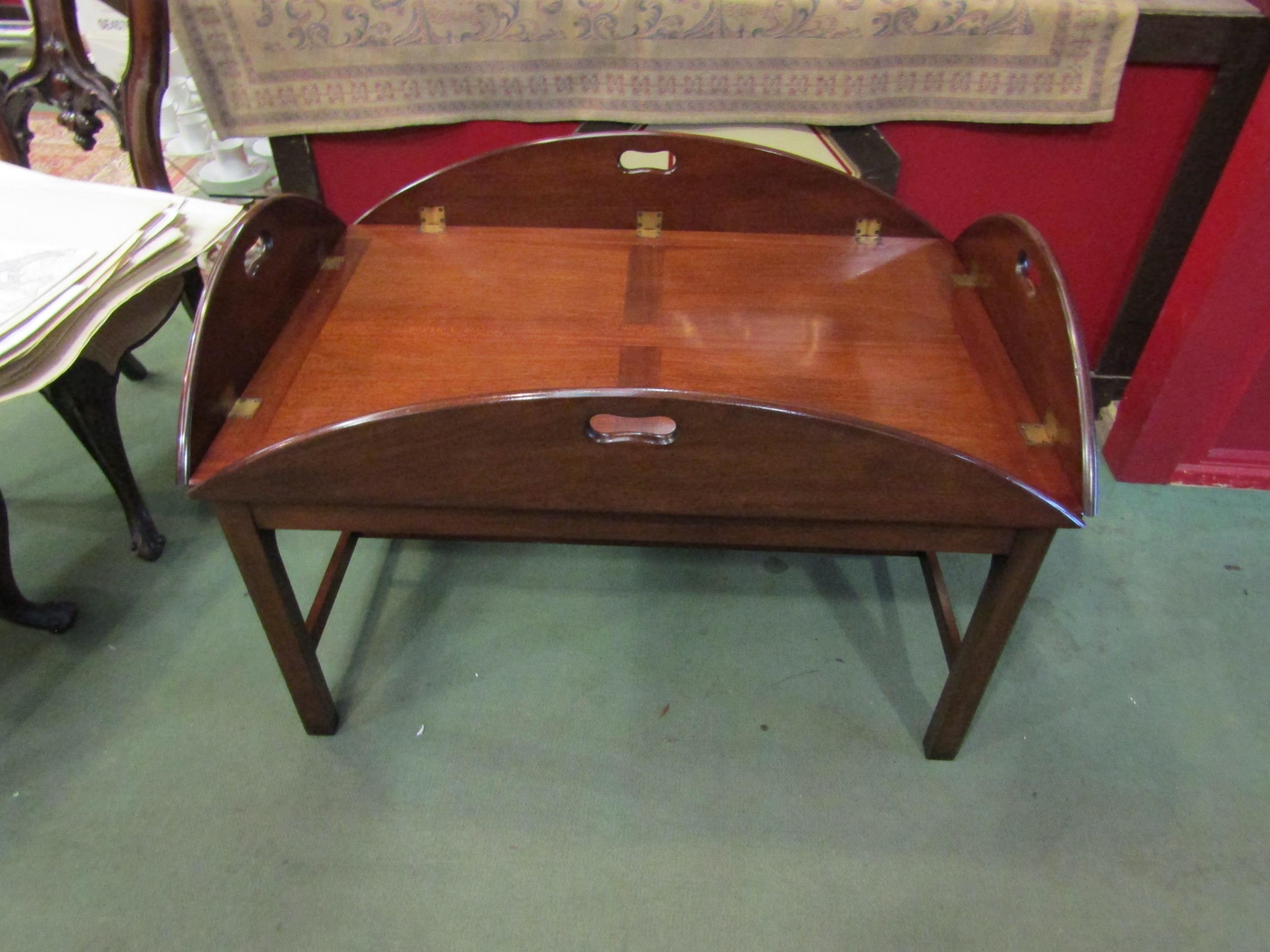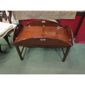 A Georgian style mahogany butlers tray top occasional table on stand with hinged sides and fret handles on a chamfered square leg base joined by an 'H' stretcher (R) £75