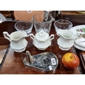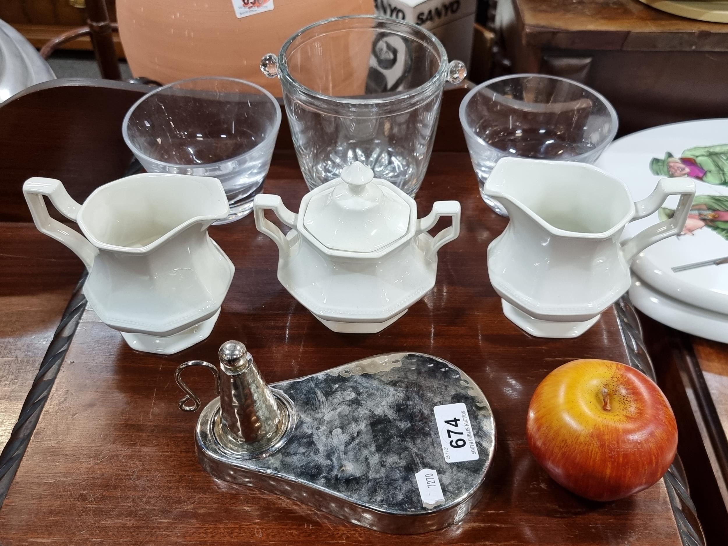 A mixed lot including three Johnson Brothers fine china items including two jugs and a sugar bowl, along with a glass table top ice bucket, Two very heavy glasses and a very unusual Candle snuffer in the form of a lighthouse. Good lot.