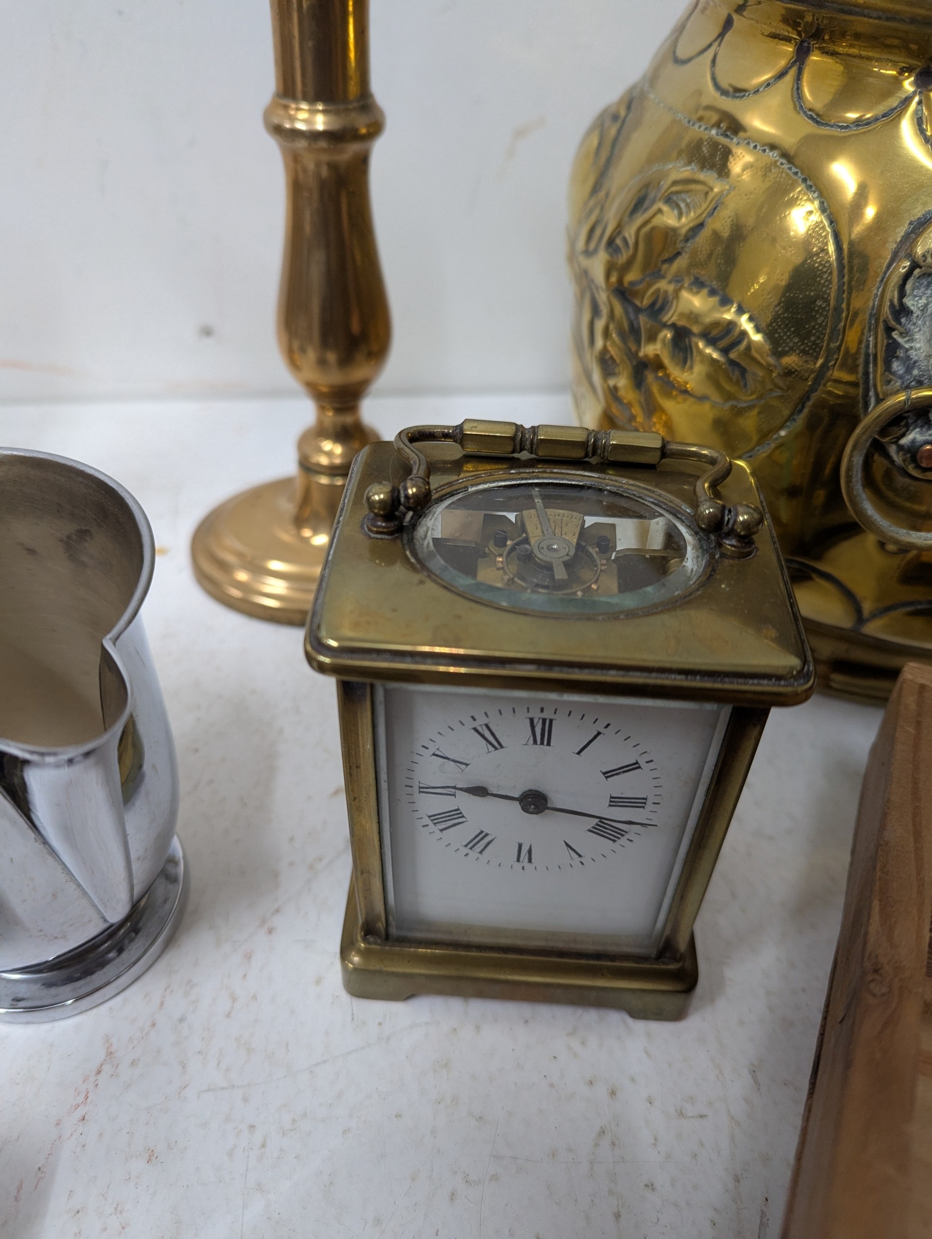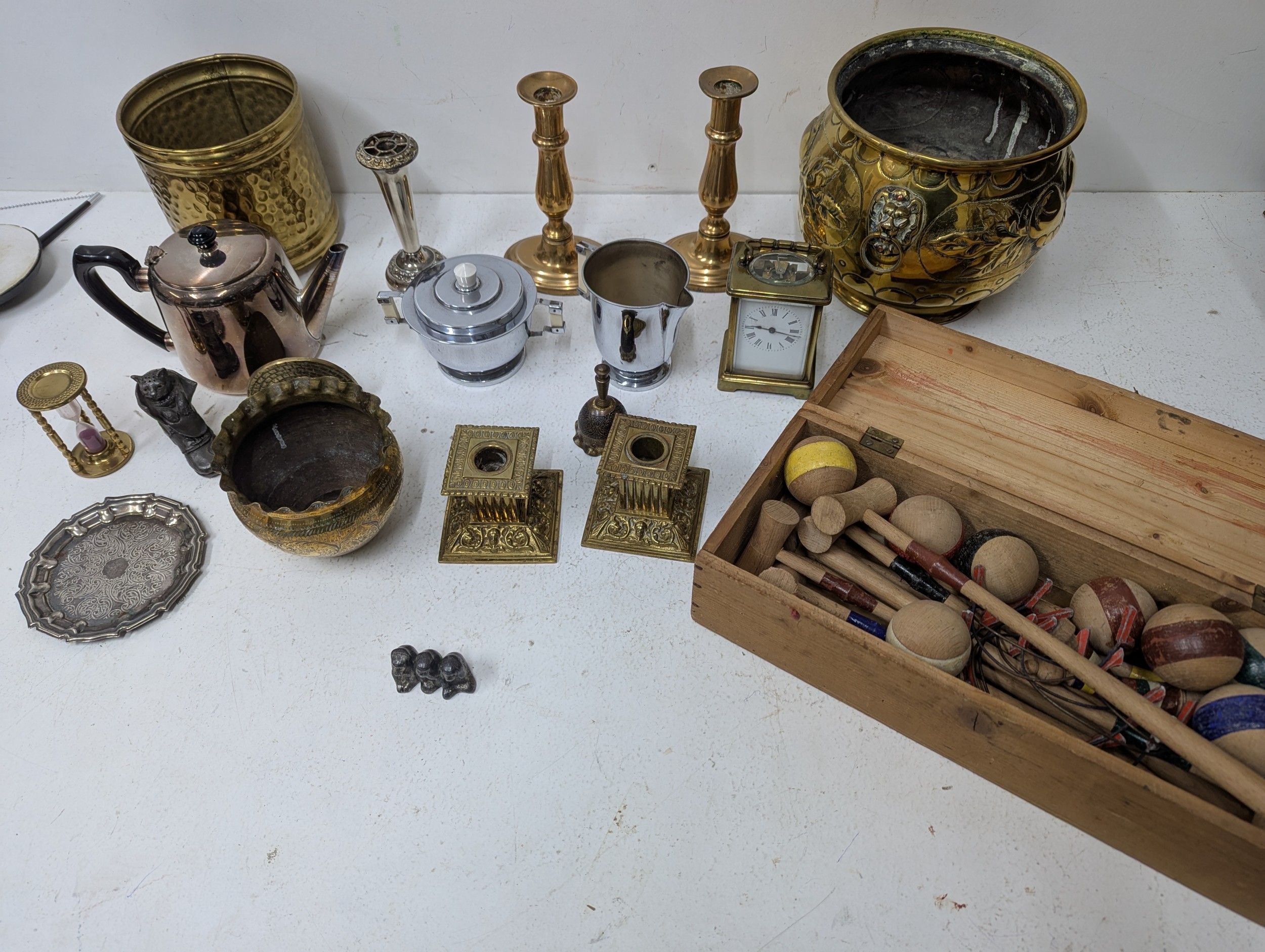 Metalware and collectables to include 19th century candlesticks, silver plate, carpet croquet, a brass carriage clock and other items Location:2-2