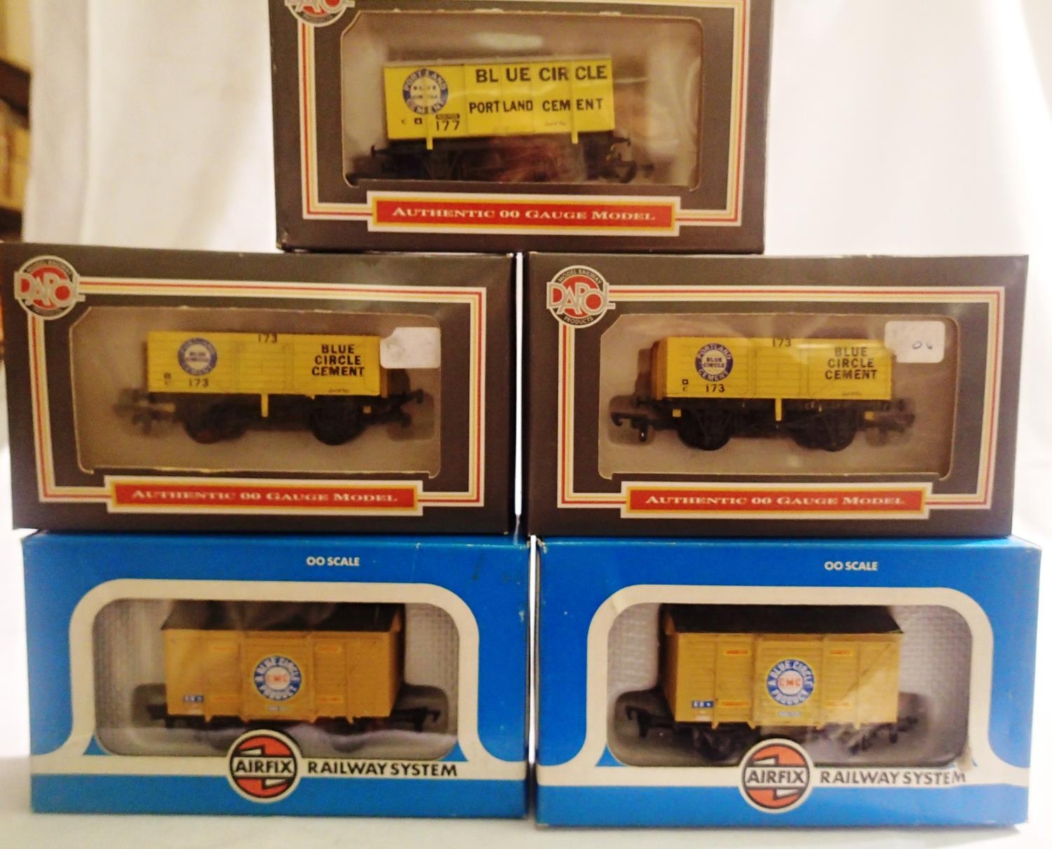 Five OO scale Blue Circle related wagons: Dapol Gun Powder, Dapol seven plank x2, Airfix 12 ton van, mostly excellent condition, wear to boxes. P&P Group 1 (£14+VAT for the first lot and £1+VAT for subsequent lots)