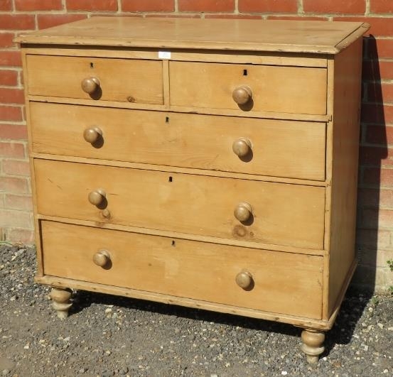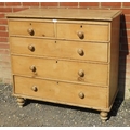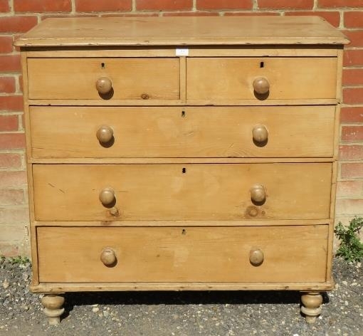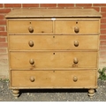 A Victorian stripped pine chest of two short over three long drawers fitted with turned wooden knob handles, on tapering turned supports.