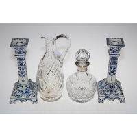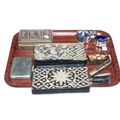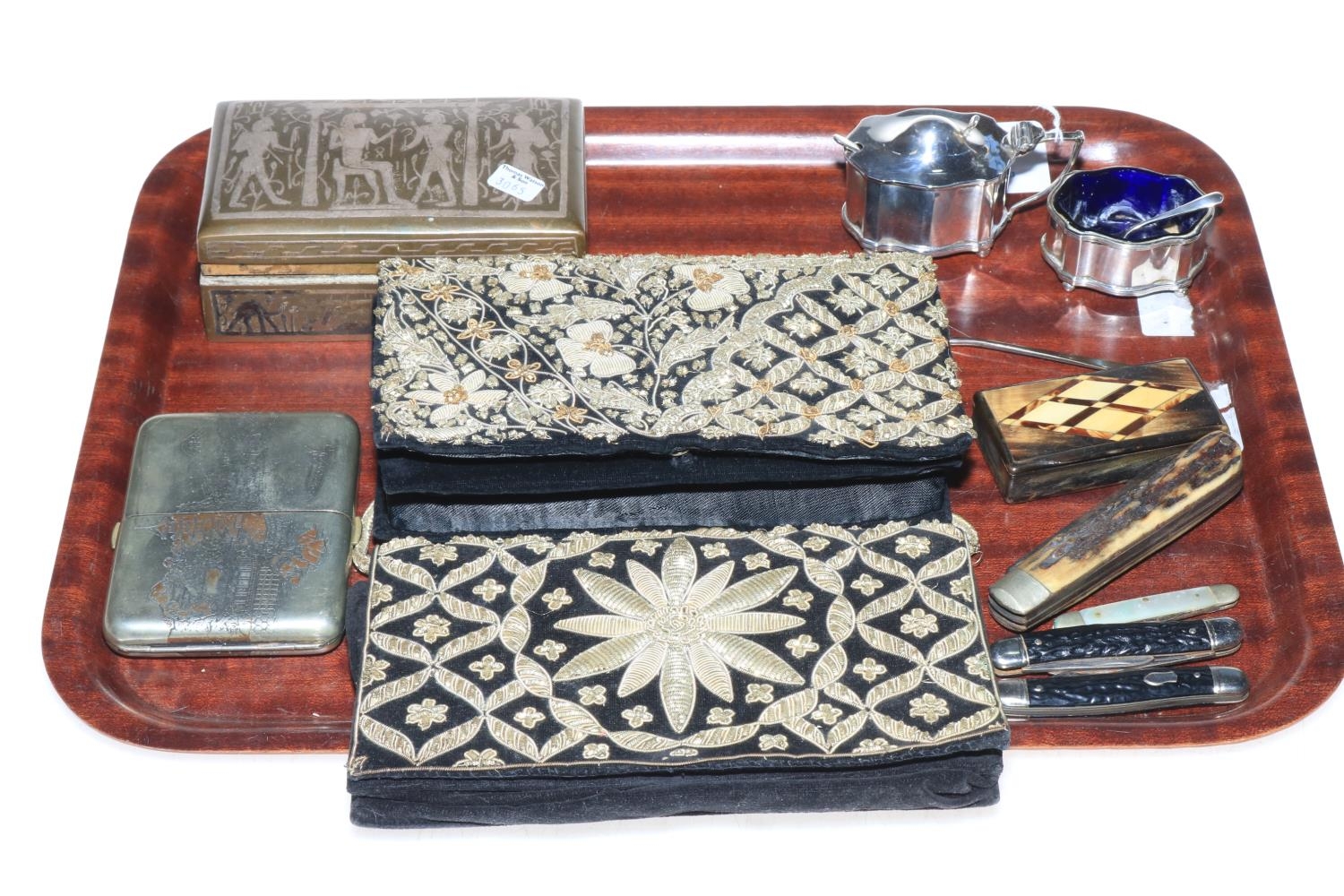 Silver mustard and salt, white metal and Niello cigarette case, Egyptian design cigarette box, pocket knives, snuff box and two evening bags.