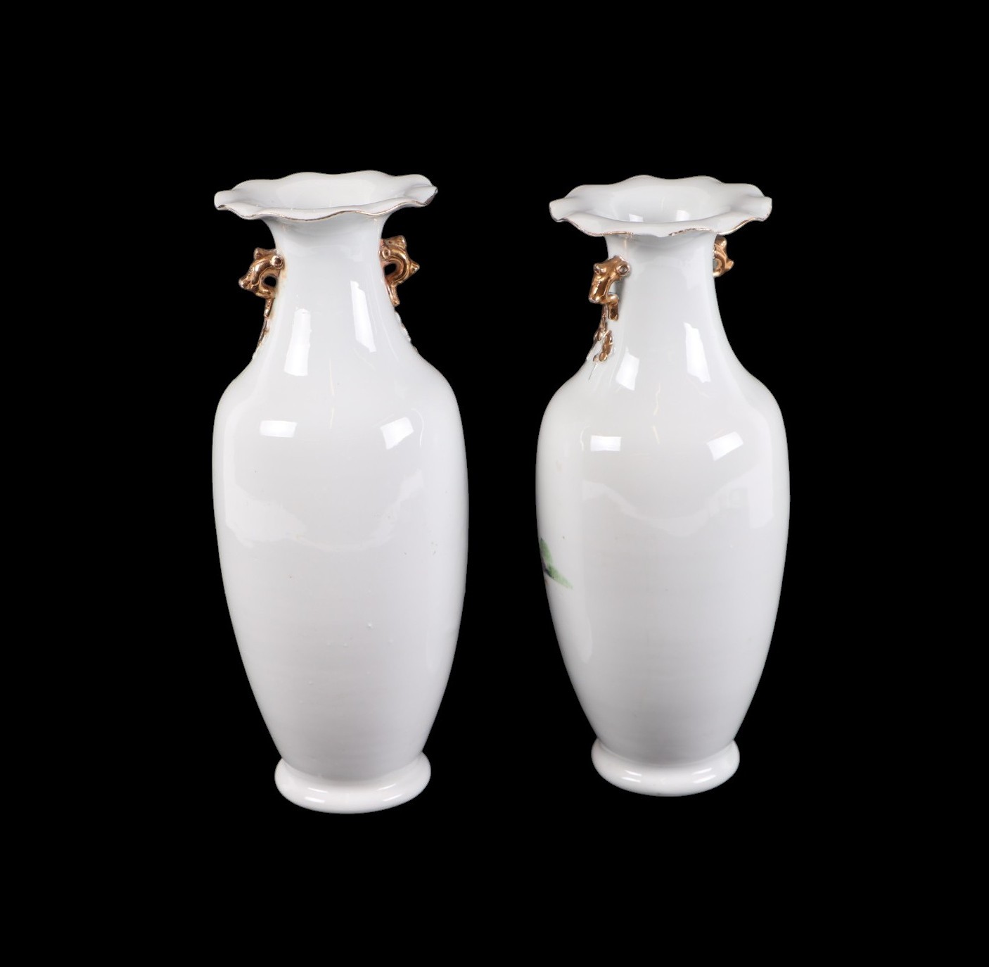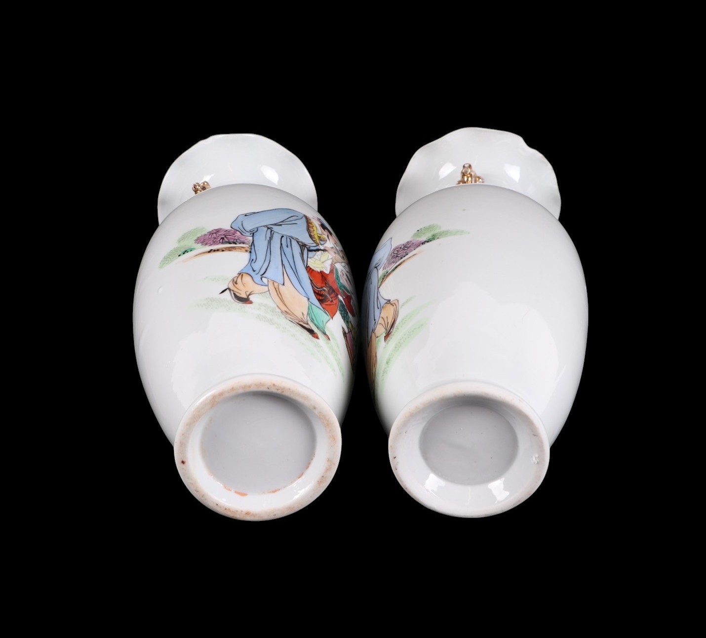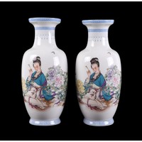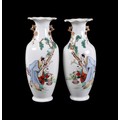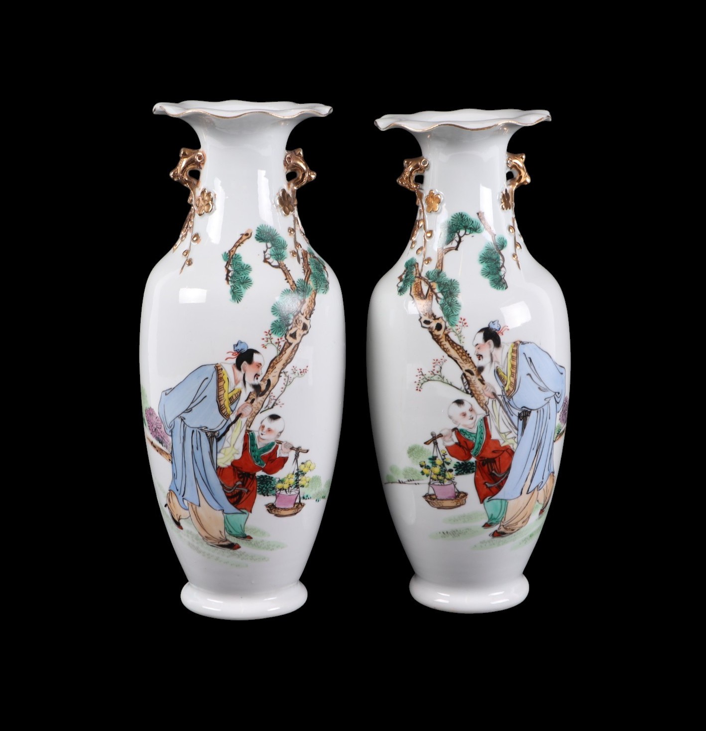 A pair of Chinese famille rose vases decorated with figures in a landscape, 28cms high.