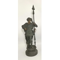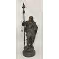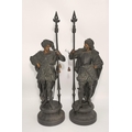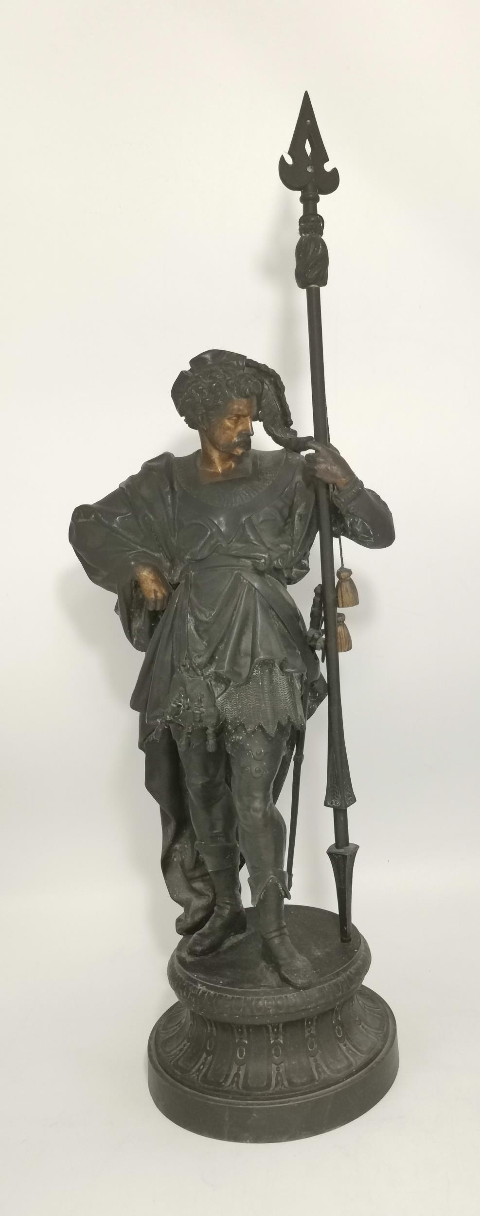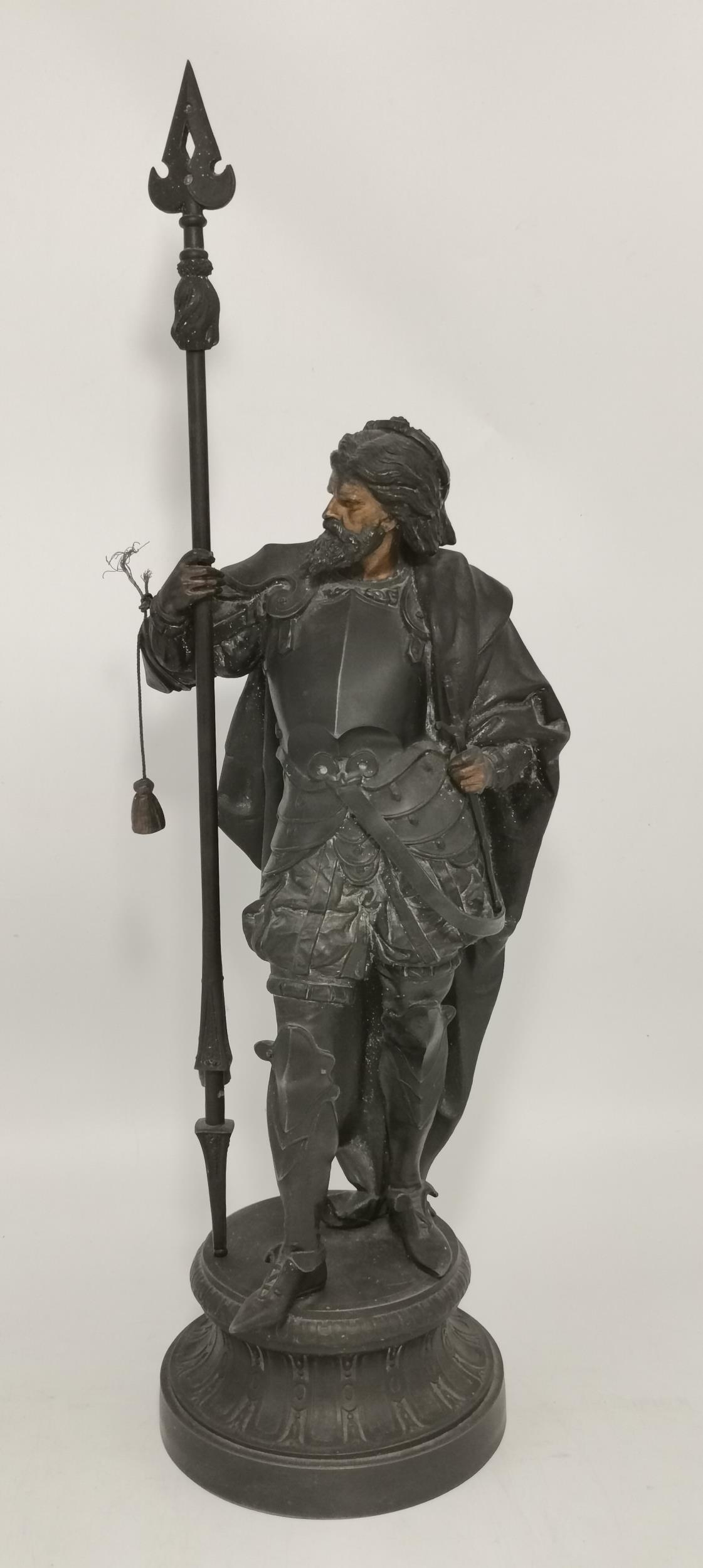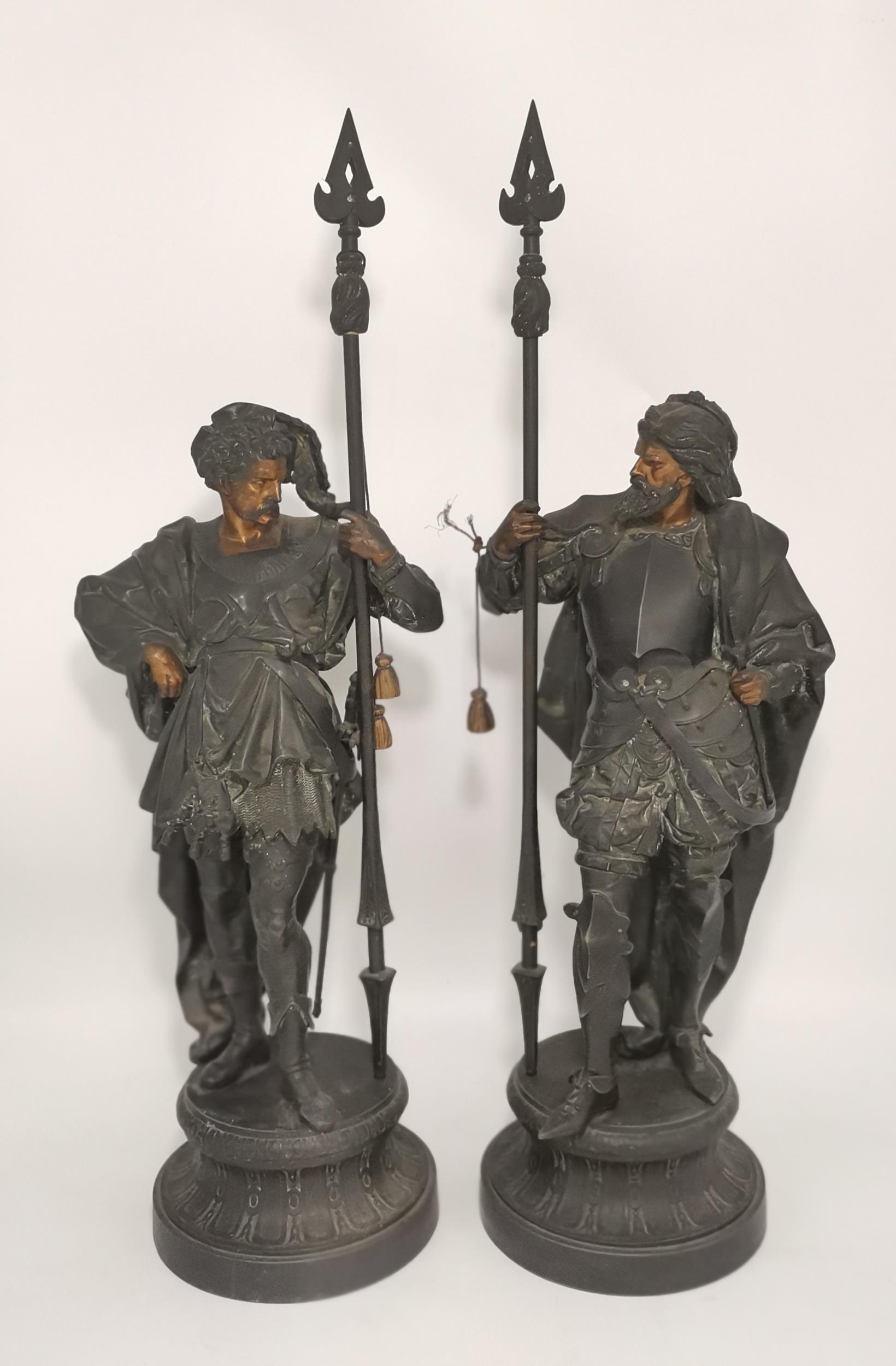 French School, second half 19th Century, a pair of spelter figures of Renaissance soldiers, with gilt-painted faces and hands, each modelled holding a lance, to a circular base. (2) 63cm high overall