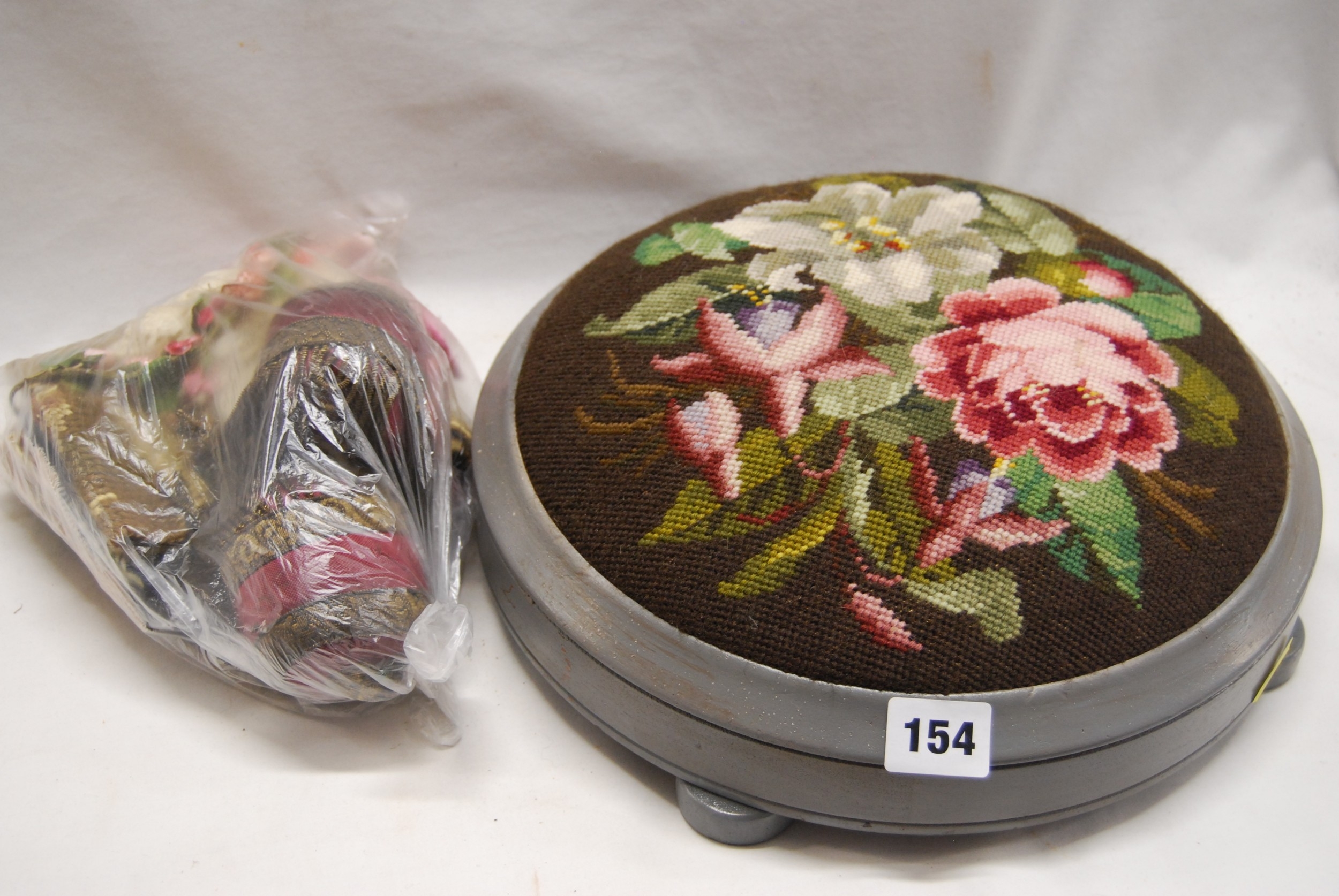 CIRCULAR PAINTED TAPESTRY TOP FOOTSTOOL