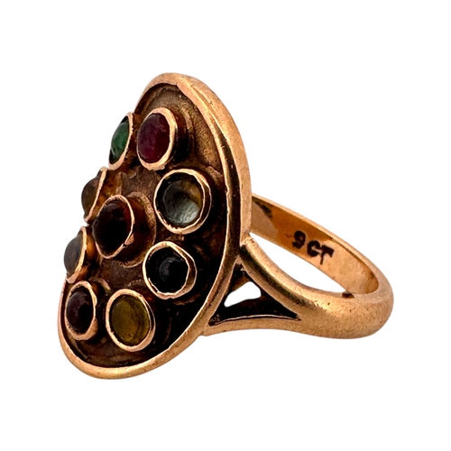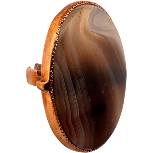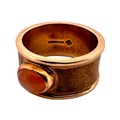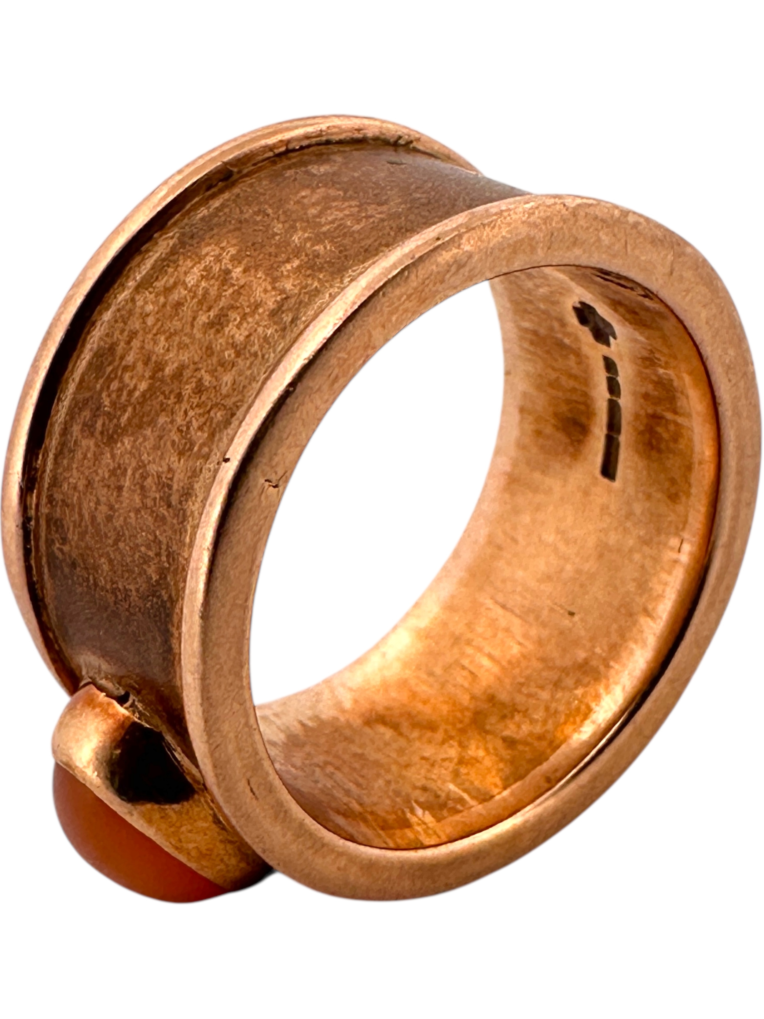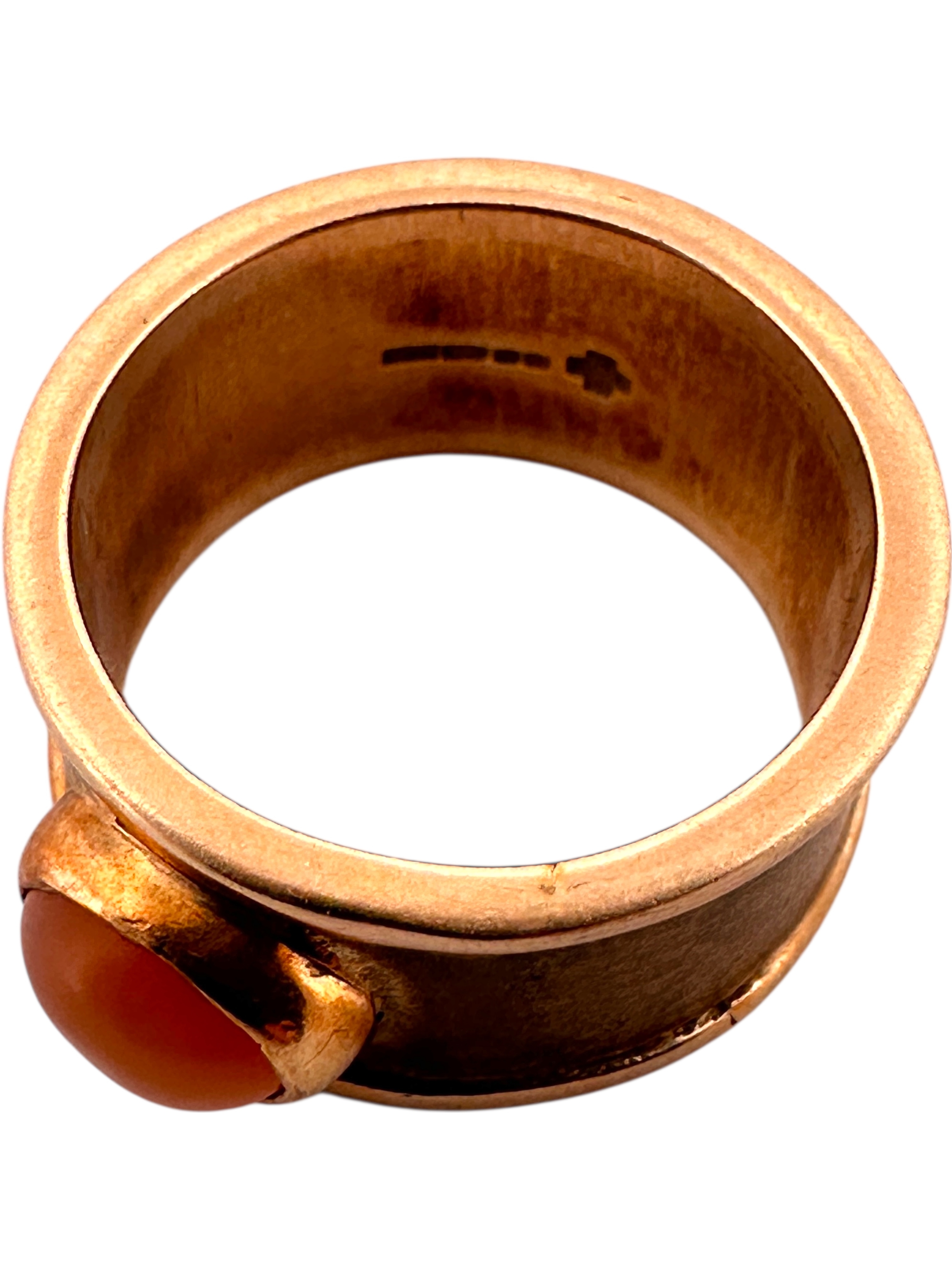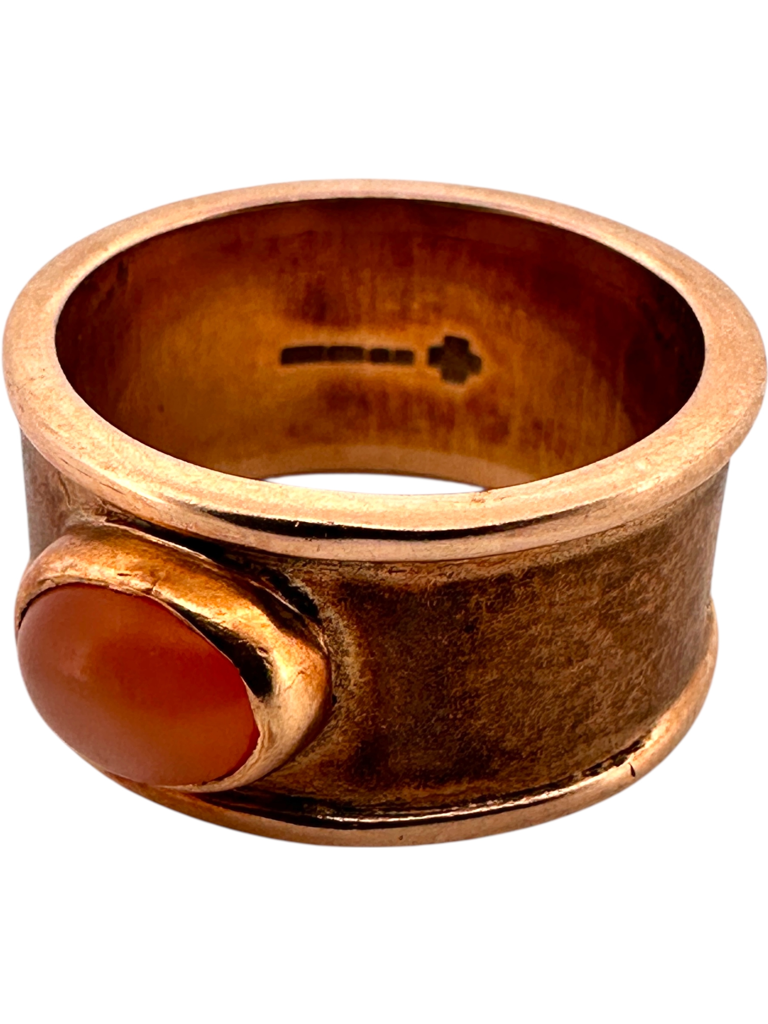 Thick Nine Carat Gold Band Ring set with Peach Coloured Cabochon. Full Hallmarks. Size P. 12g