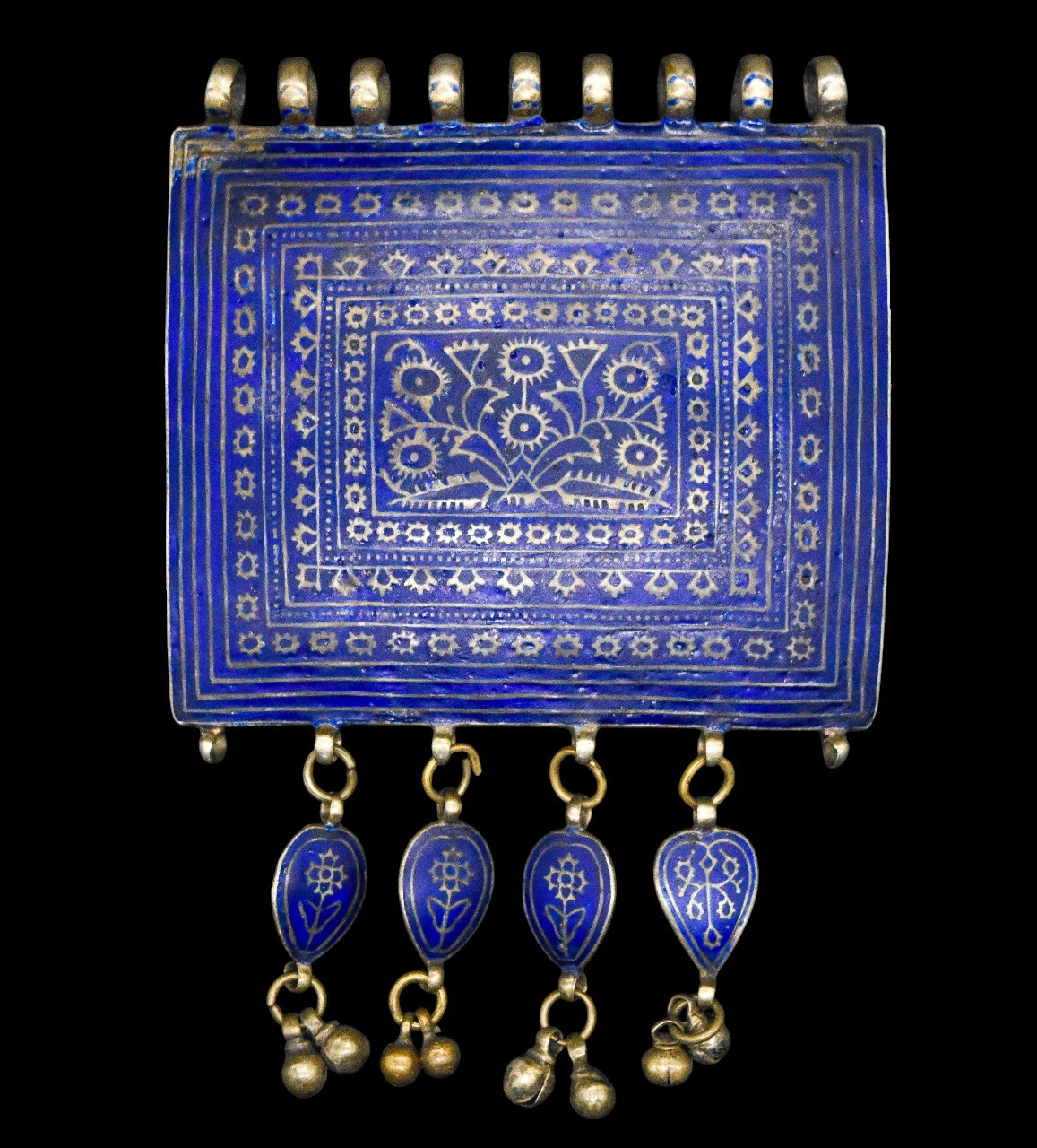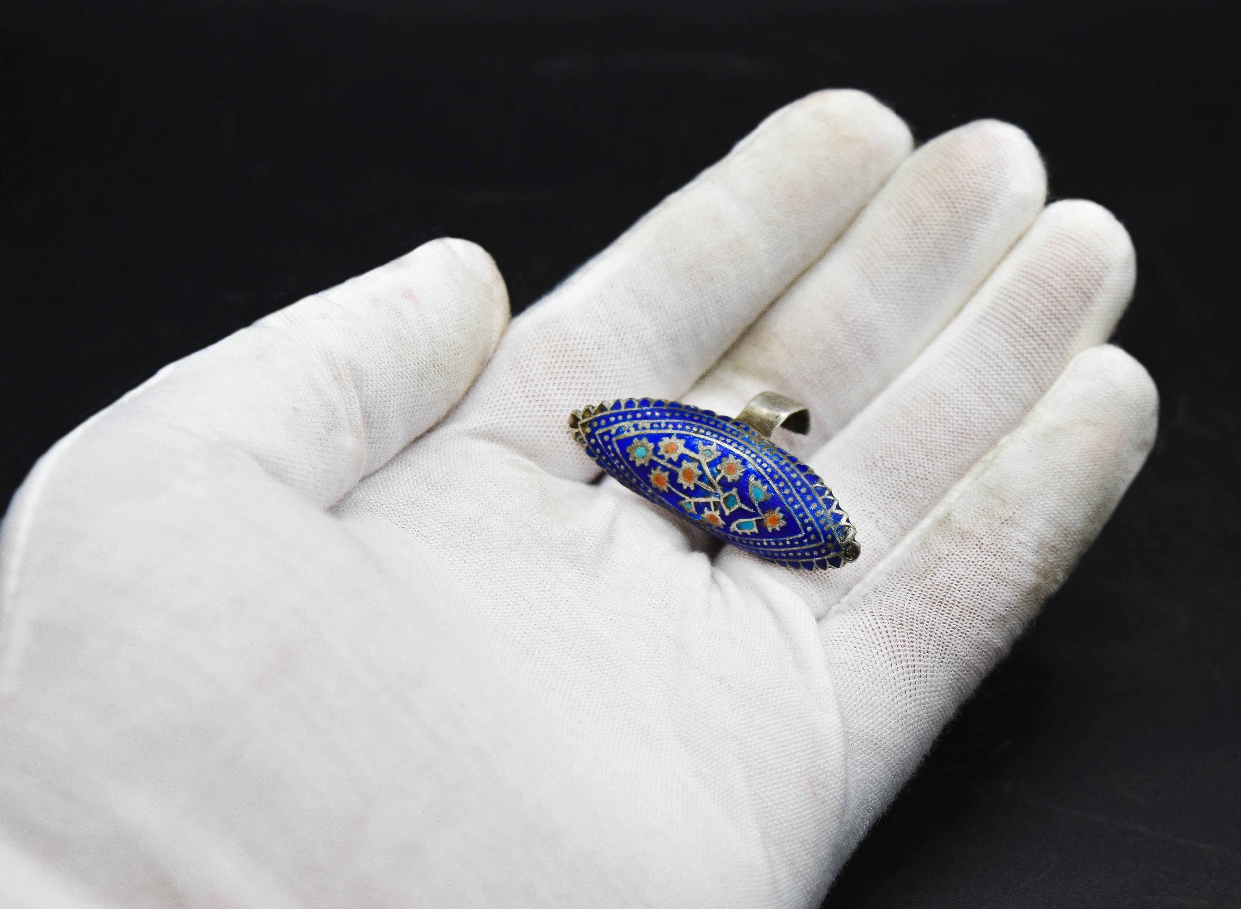 Antique Indian Sindhi (Multani) Silver Pendant Necklace & Ring with Blue Enamel, Islamic Eastern