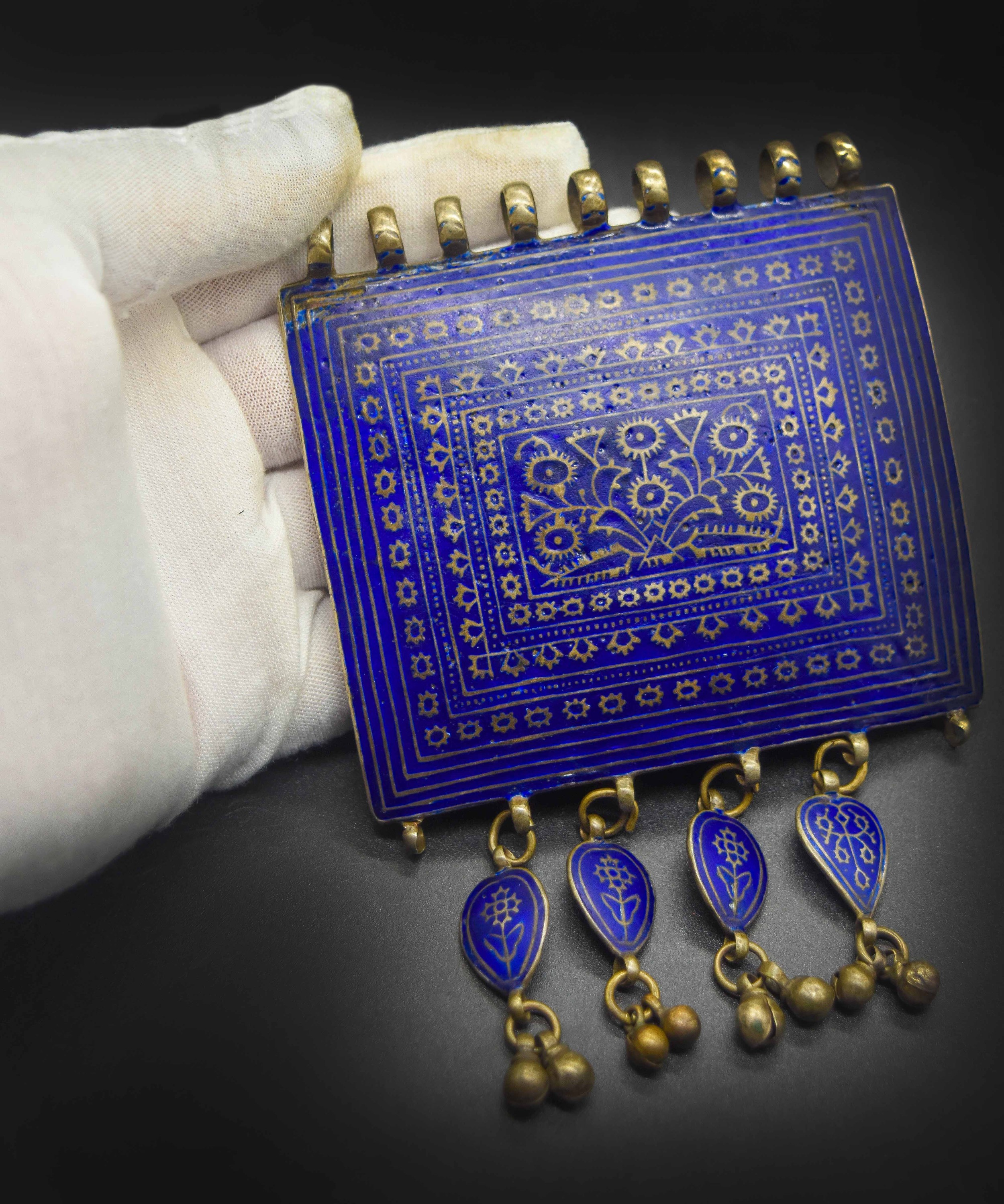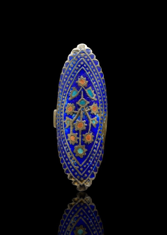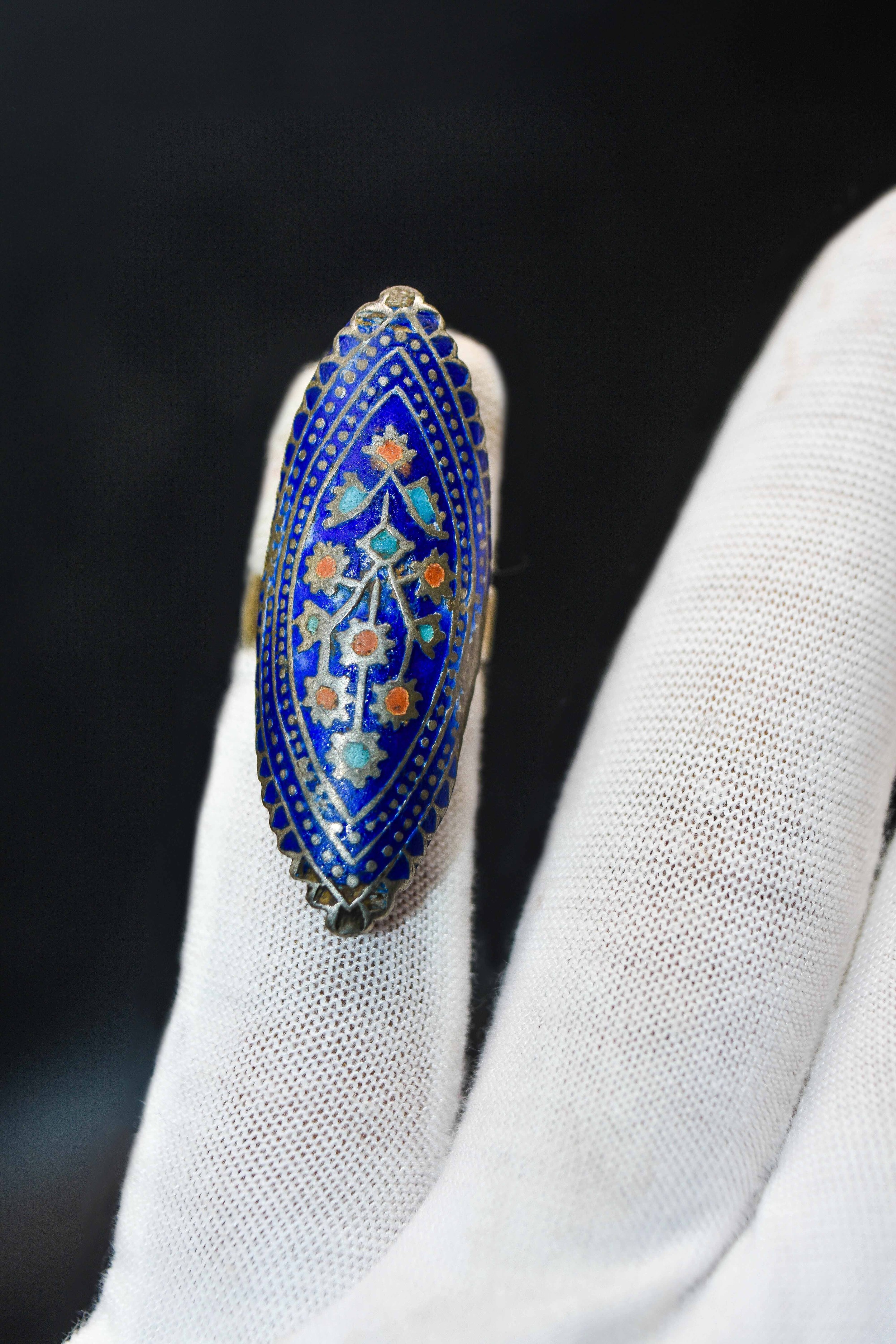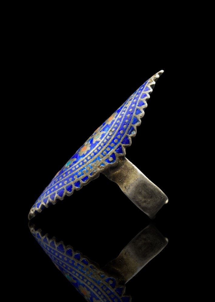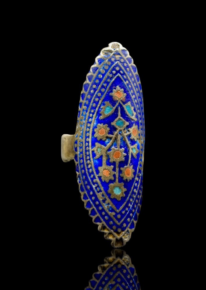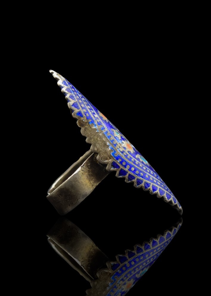 The matching ring mirrors the pendant’s design, with the same enamel detailing and ornamental engravings, forming a harmonious set. Likely dating back several decades, this jewelry set not only reflects the rich artisanal heritage of Sindh but also represents a bygone era of aesthetic elegance, identity, and craftsmanship. A true collector’s item, it serves as both a wearable artwork and a cultural heirloom.