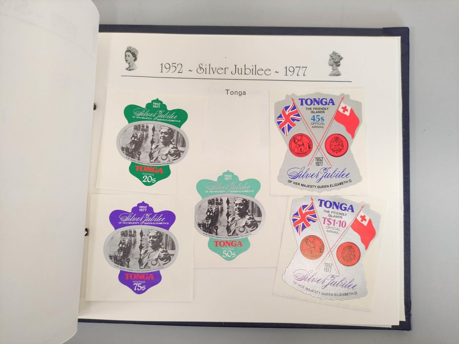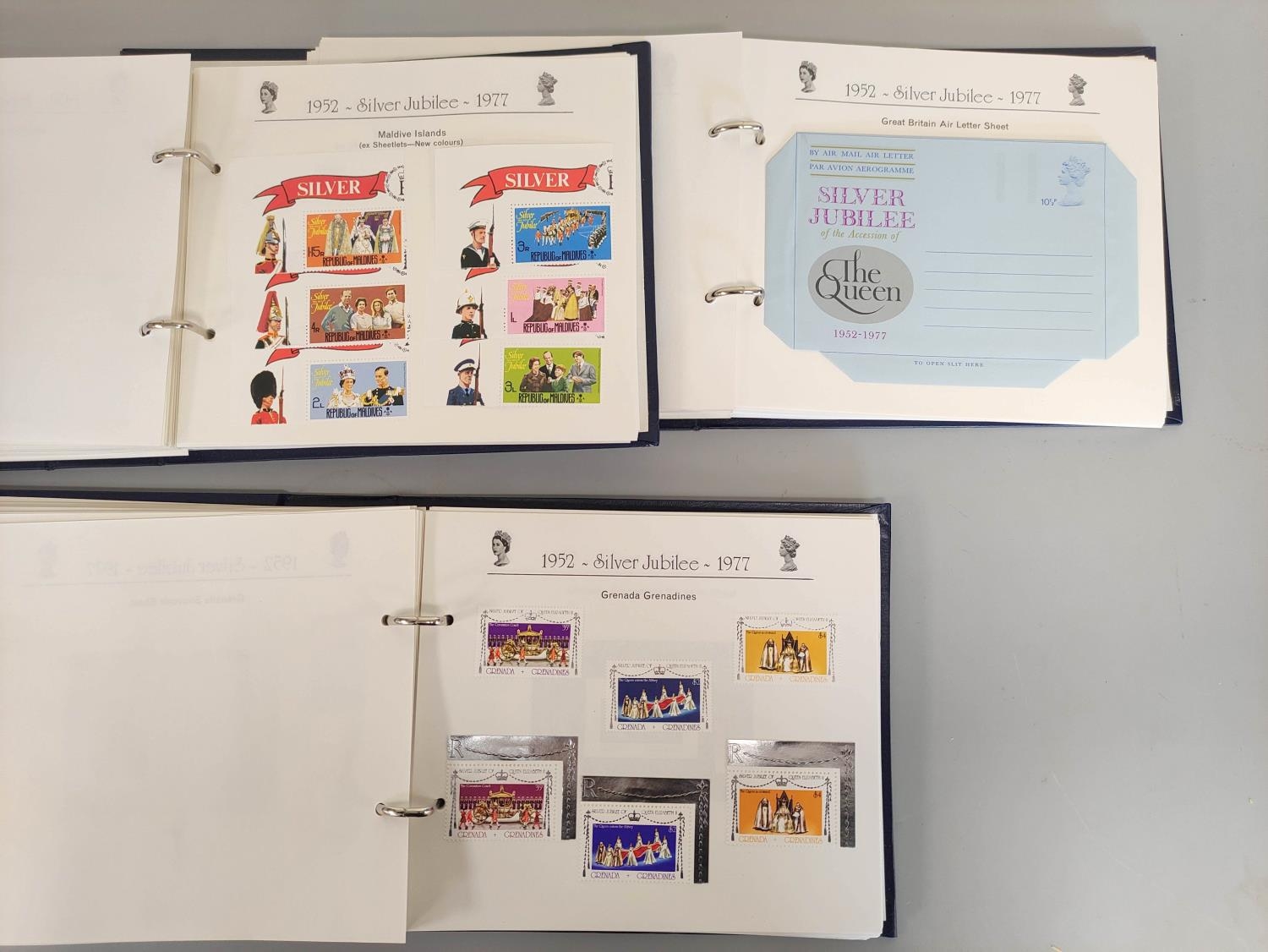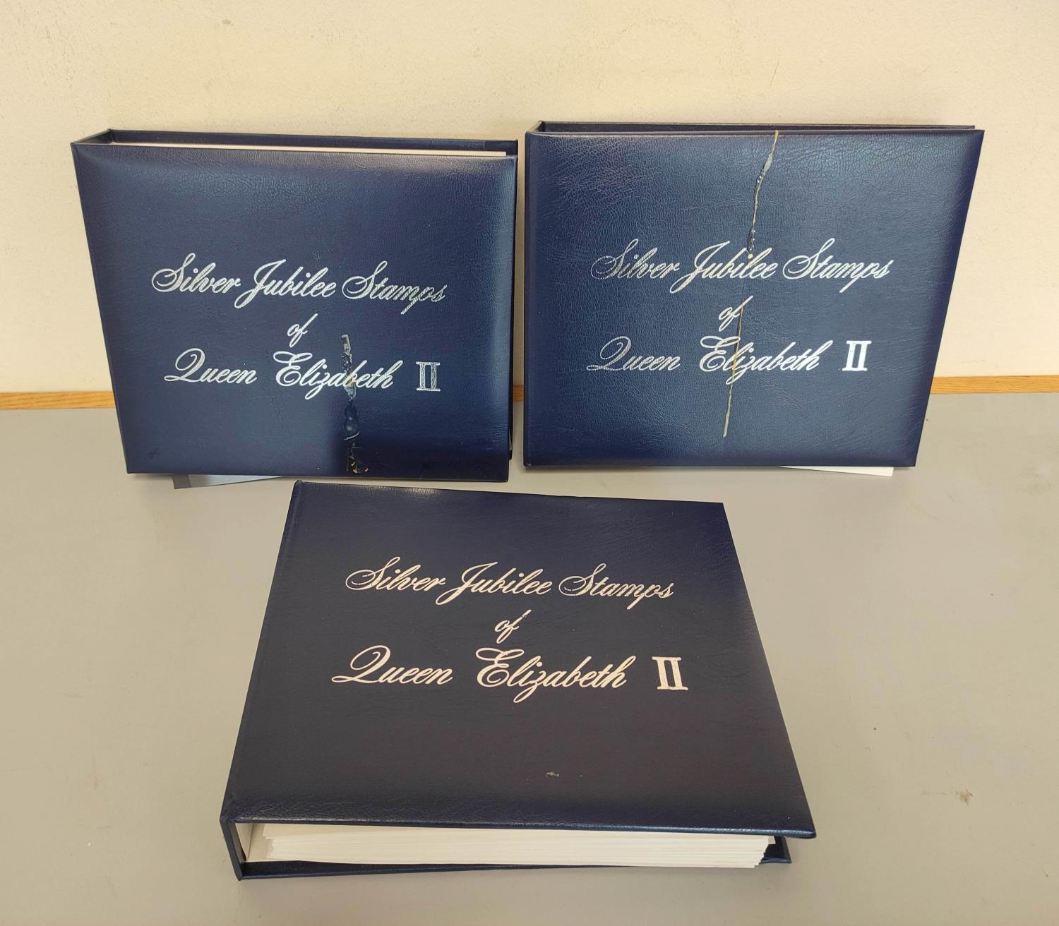 Three postage stamp albums relating to Queen Elizabeth II Silver Jubilee 1977 to include British & Commonwealth issues. All in excellent condition and lacking postmarks. (3)