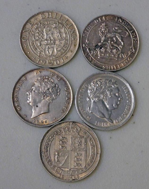 5 SILVER SHILLING COINS TO INCLUDE 1816 GEORGE III, 1826 GEORGE IV, 1890 & 1901 VICTORIA & 1906 EDWARD VII
