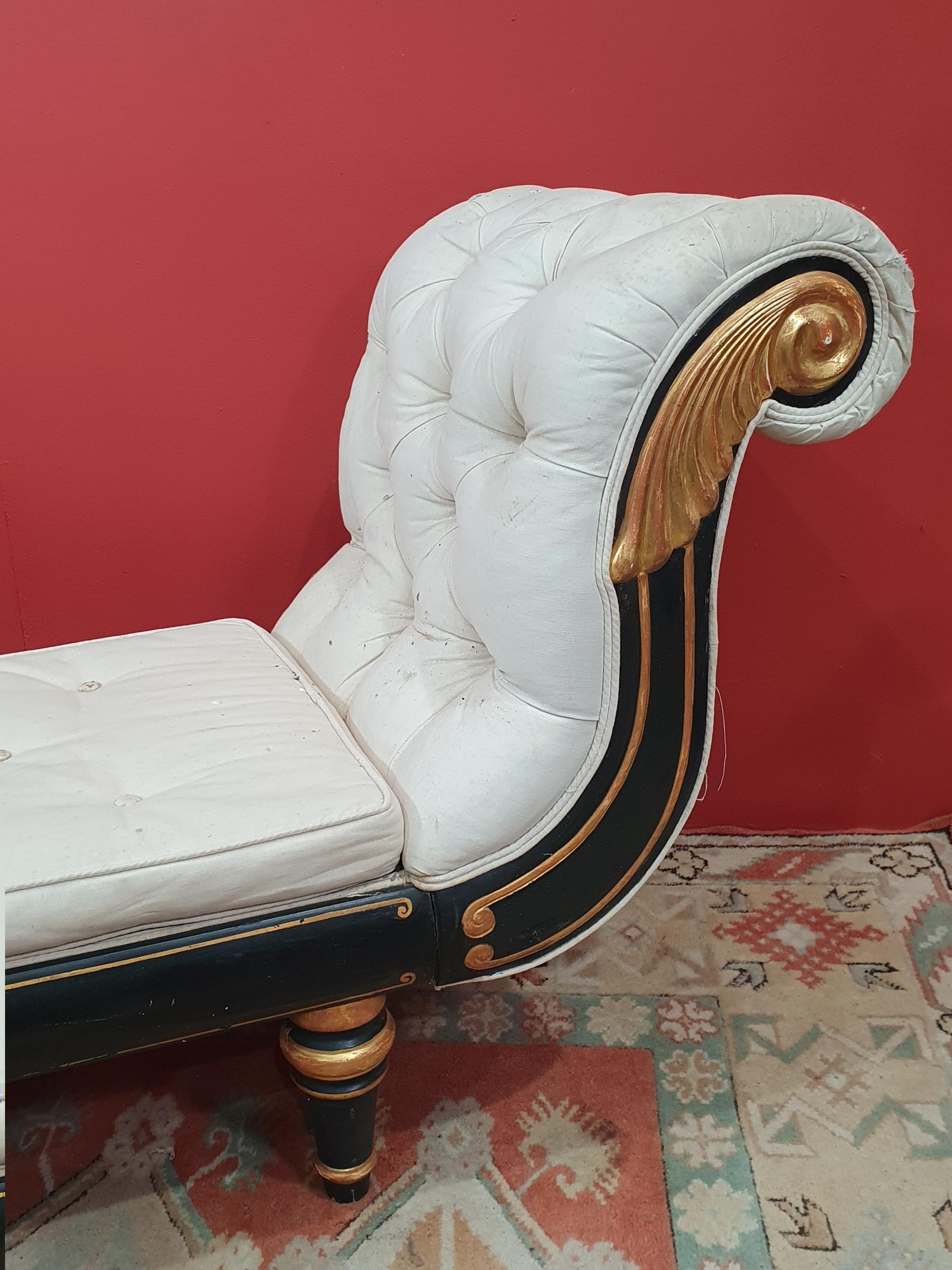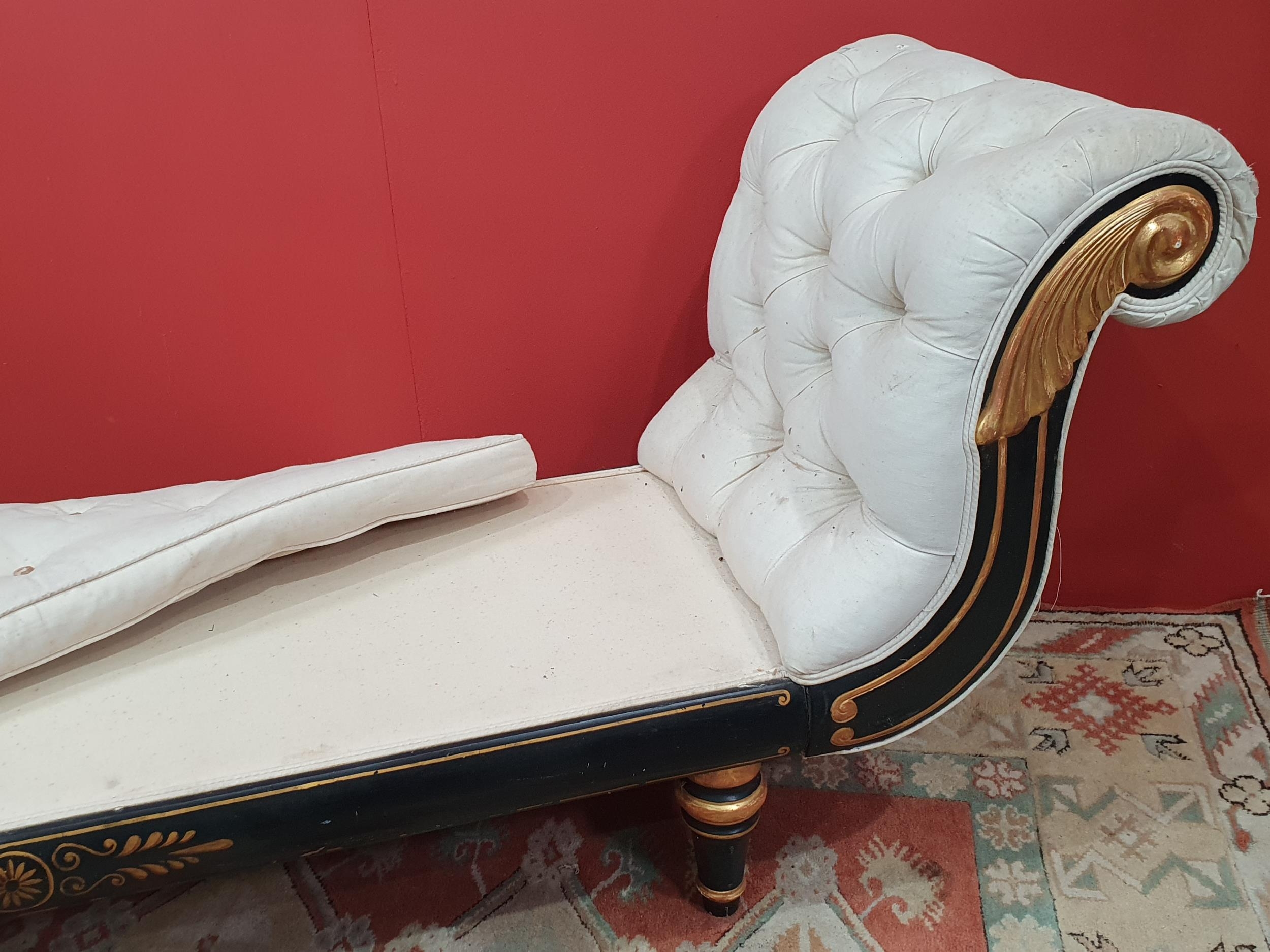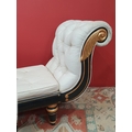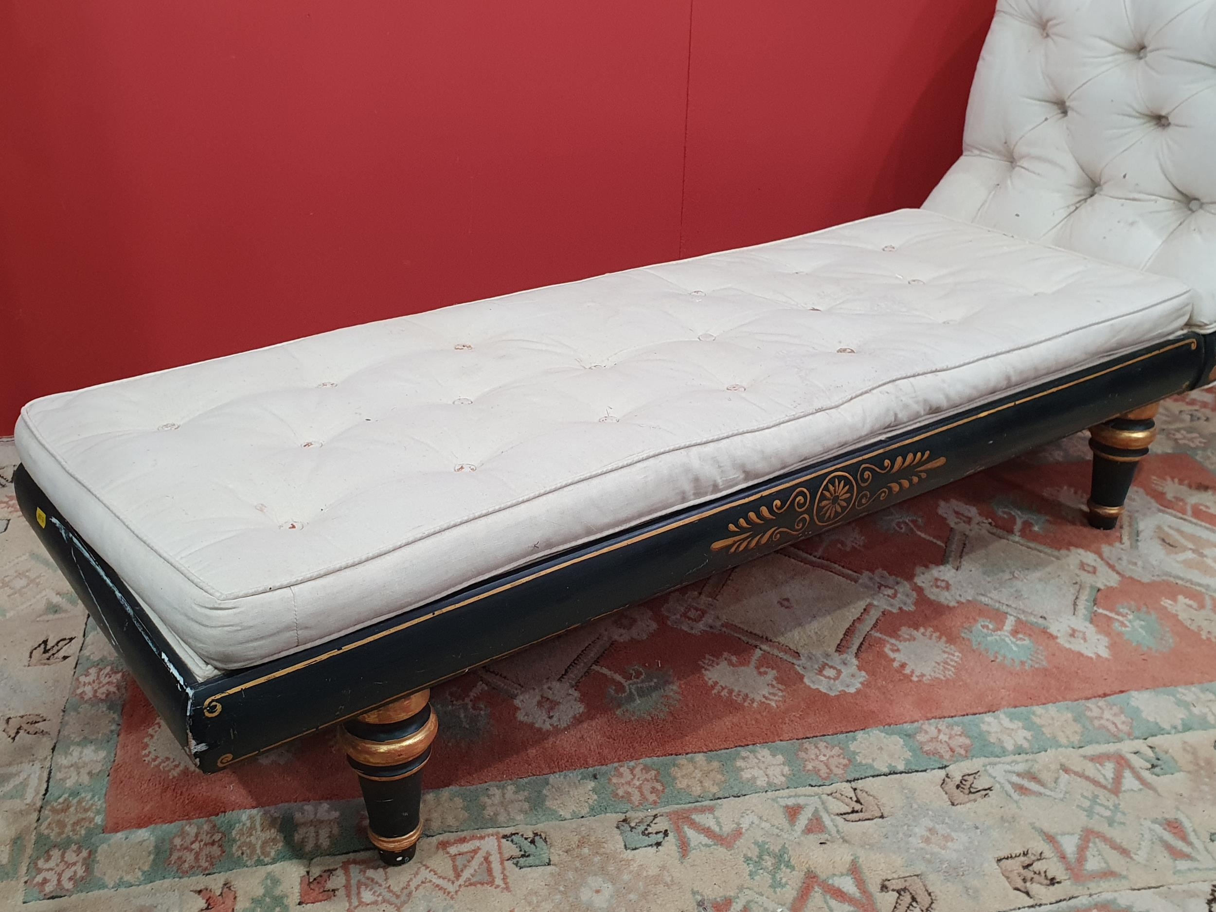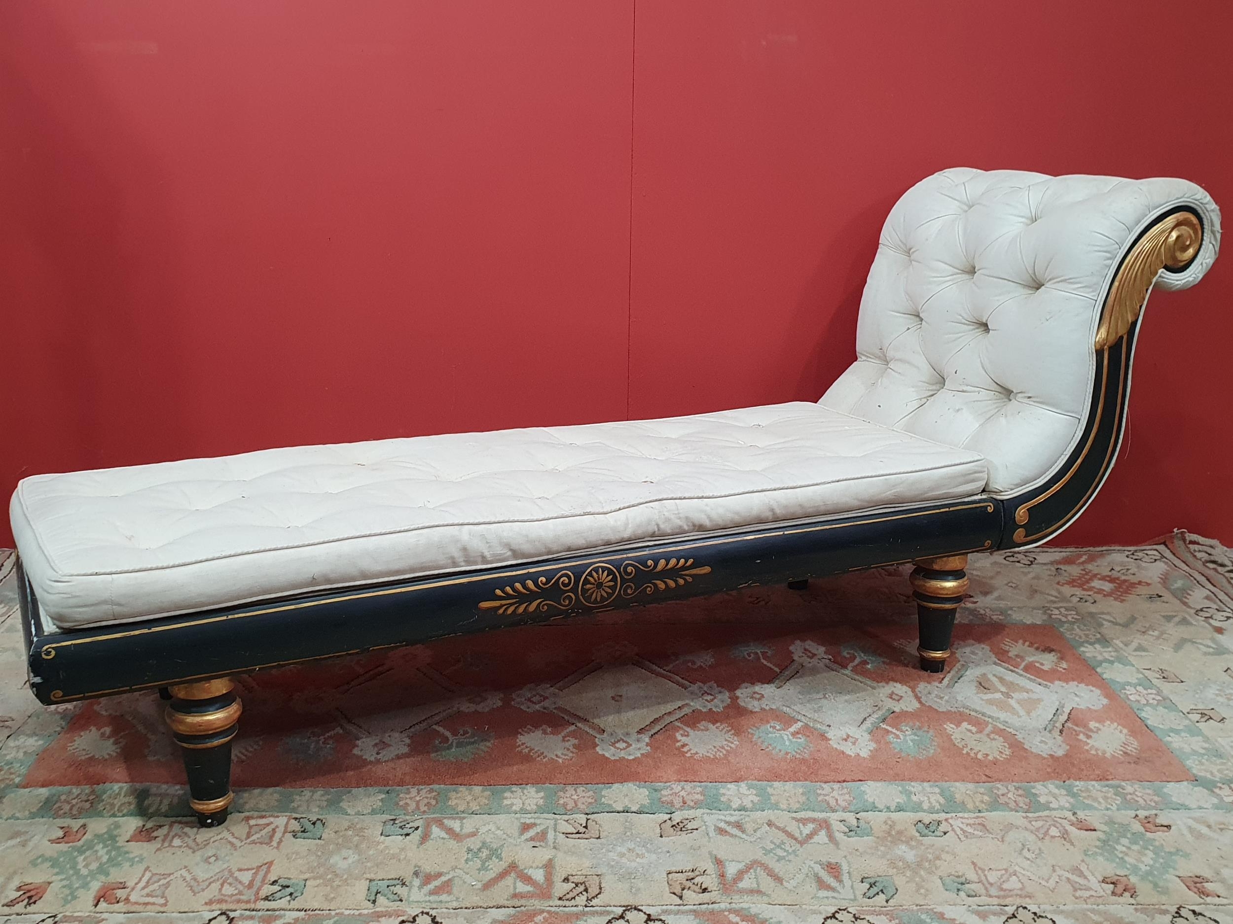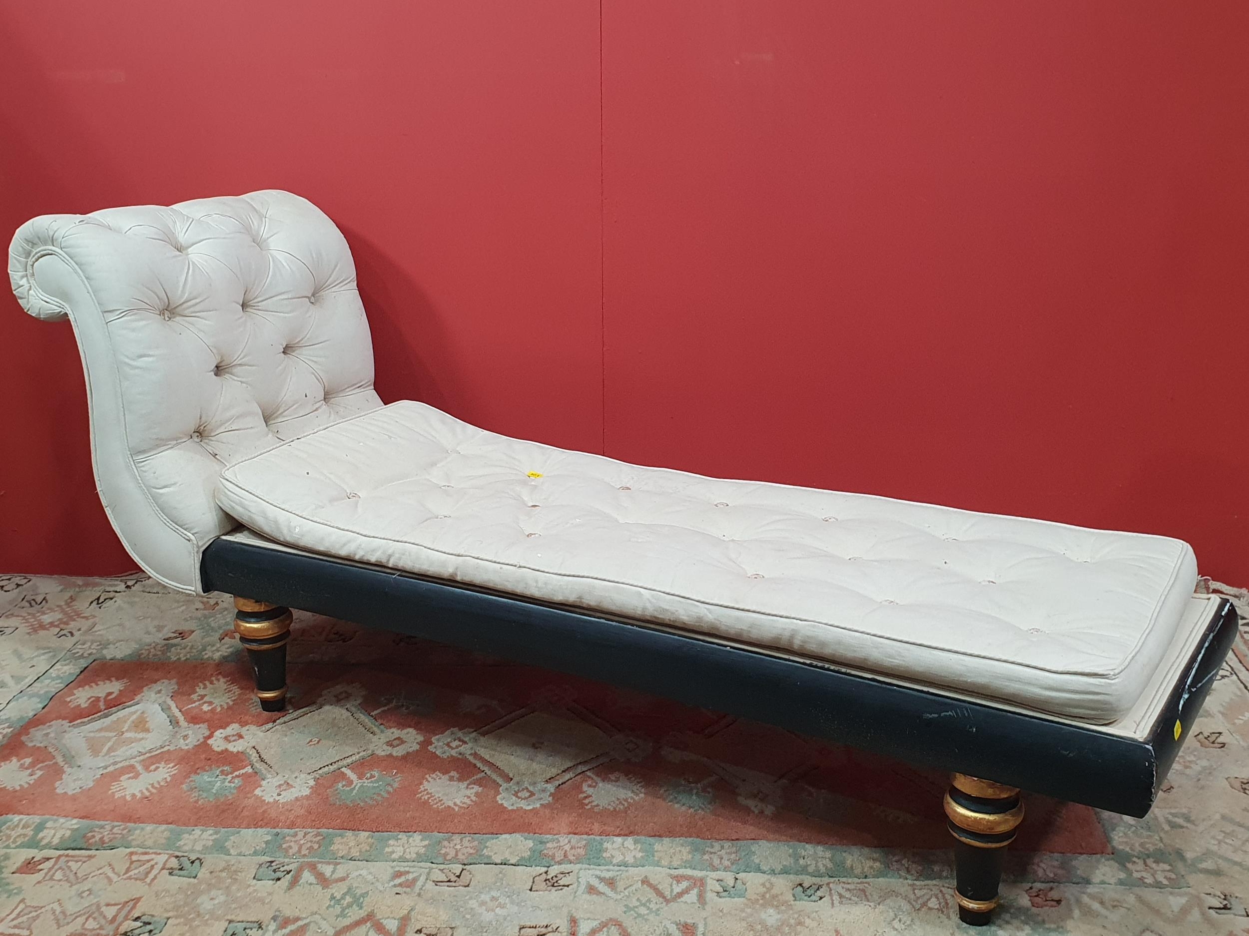 A cream button upholstered miniature Chaise Longue/Day Bed, the painted frame with gilt floral and scroll decoration, raised on four turned tapered supports, 4ft 7in L, (R3)