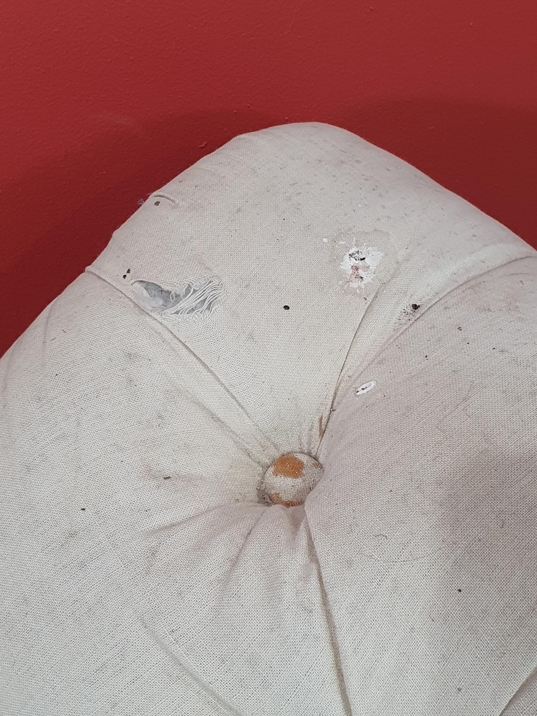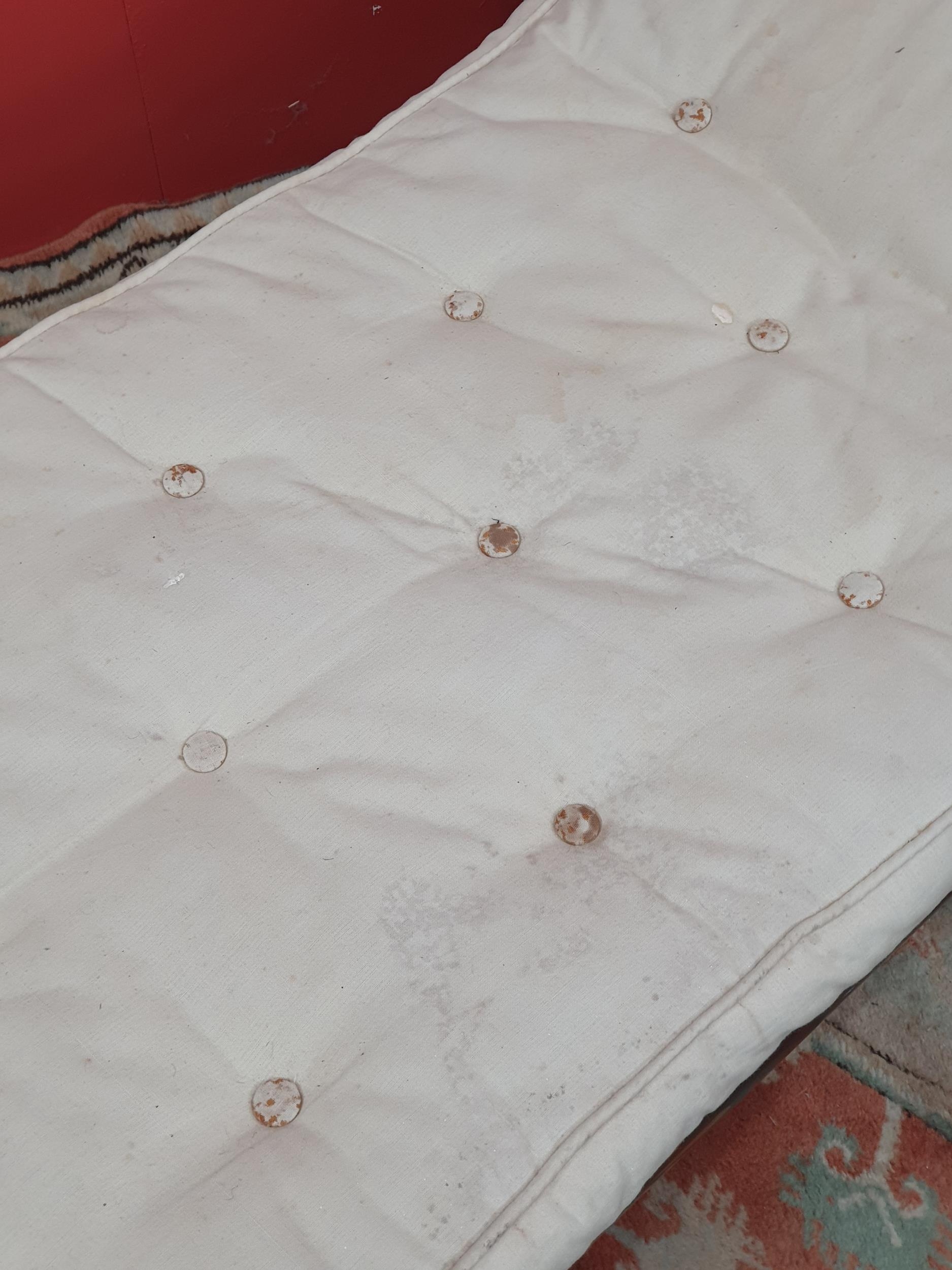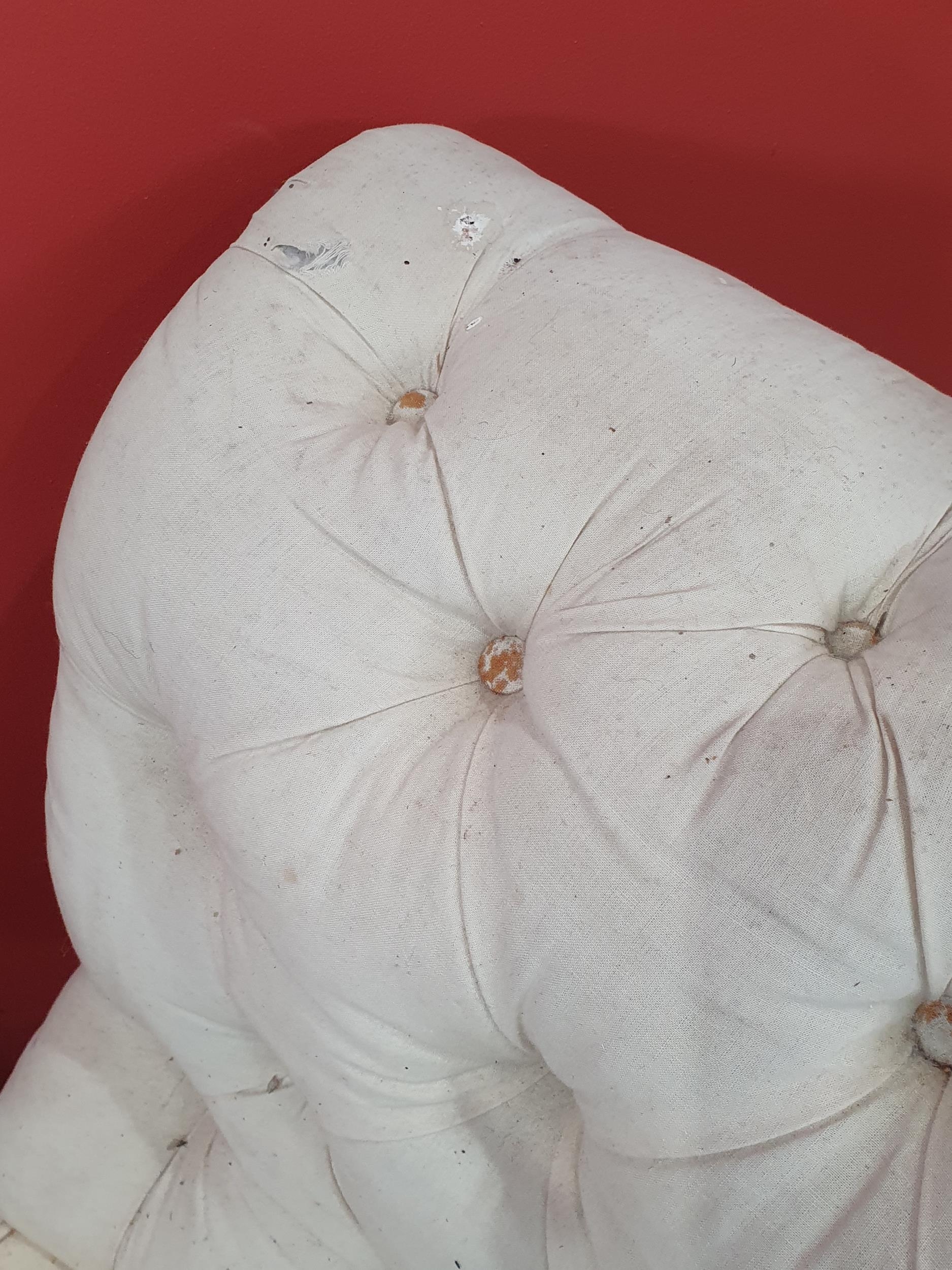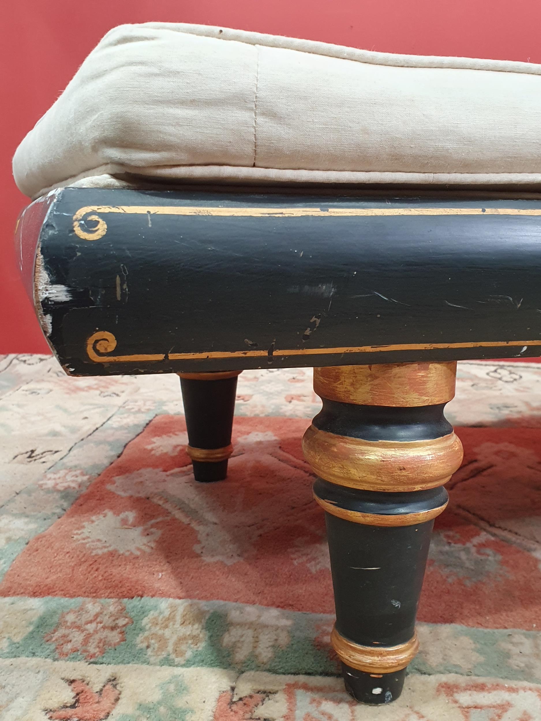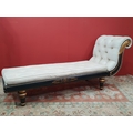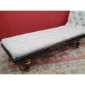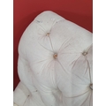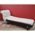 A cream button upholstered miniature Chaise Longue/Day Bed, the painted frame with gilt floral and scroll decoration, raised on four turned tapered supports, 4ft 7in L, (R3)