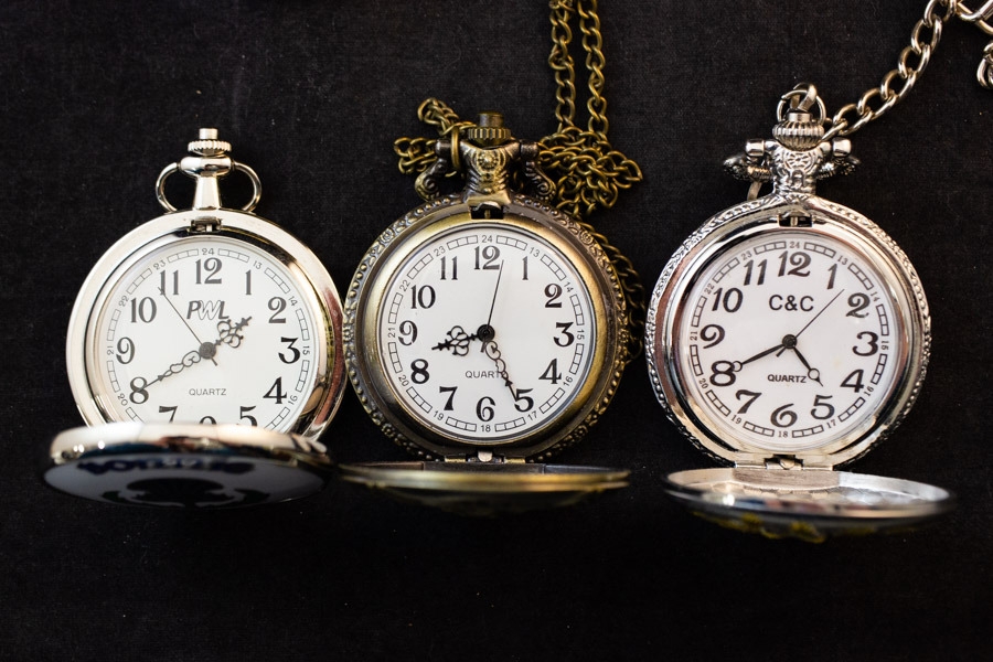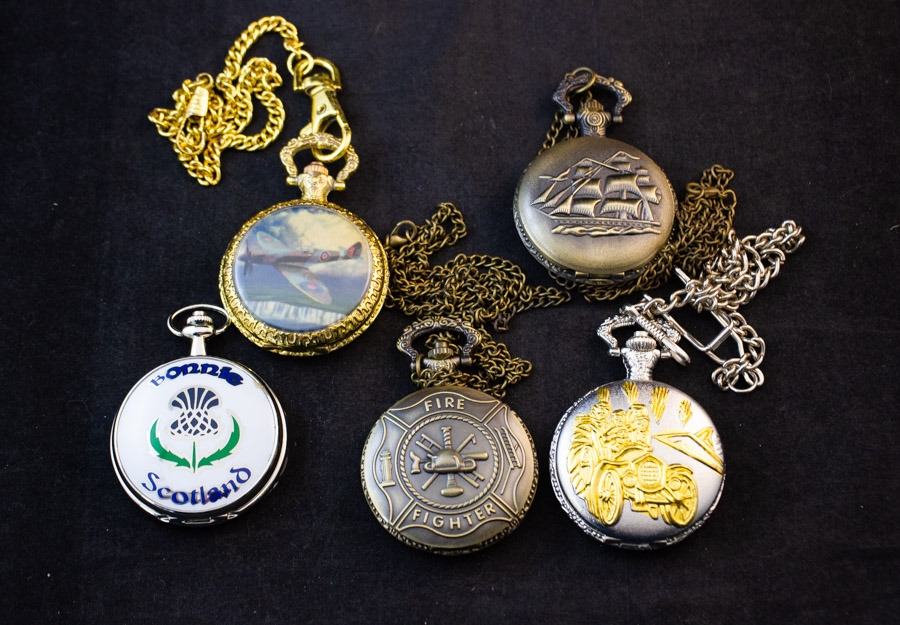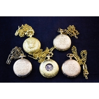 FIVE ASSORTED MODERN POCKET WATCHES, SOME WITH CHAINS