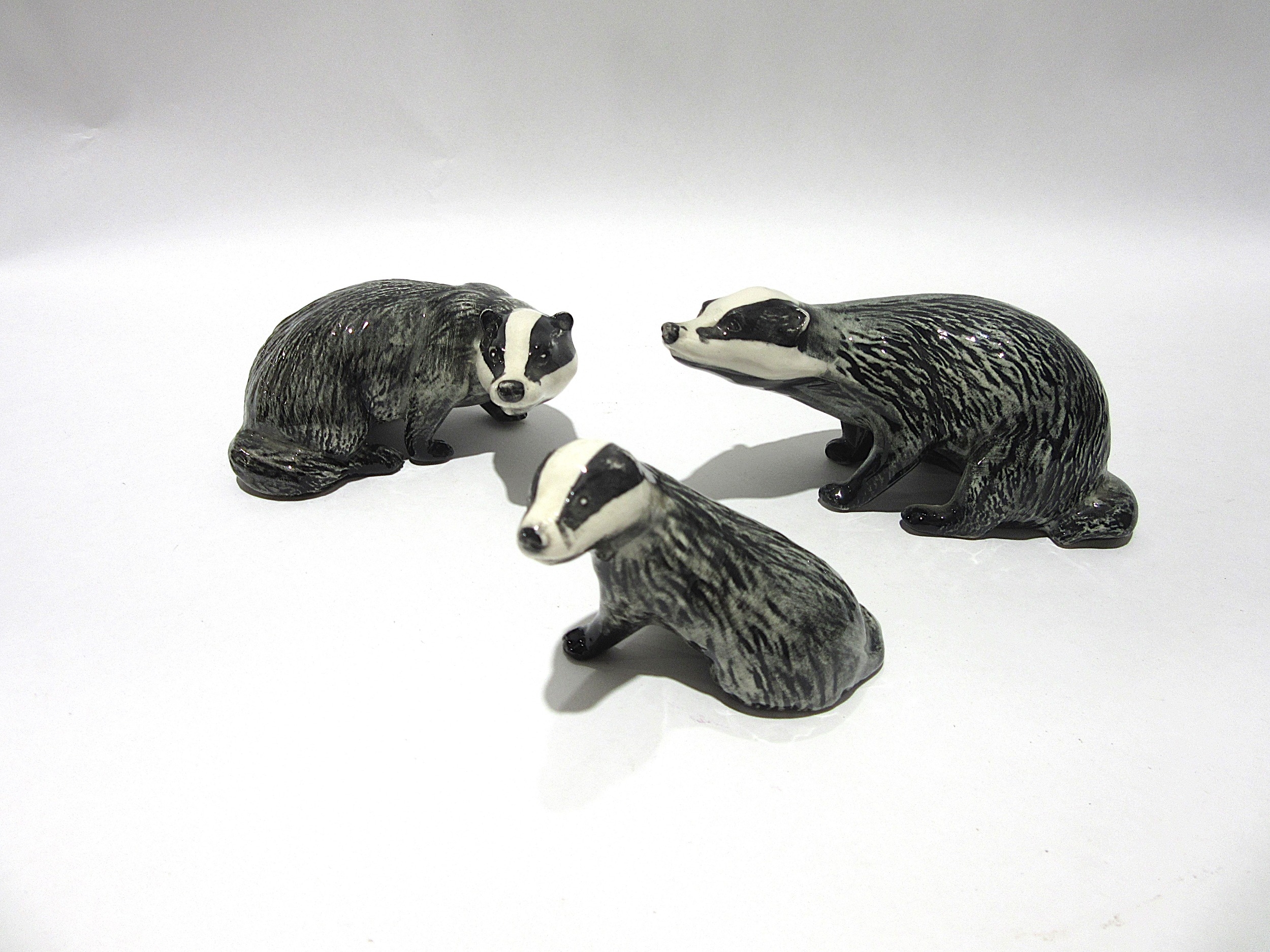 Three Beswick Badgers. Male model no. 3393, Female 3394 and Badger Cub, model no. 3392