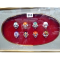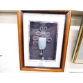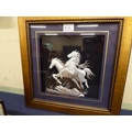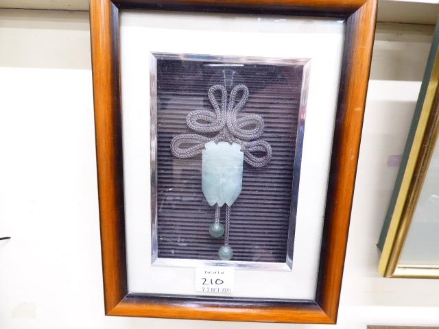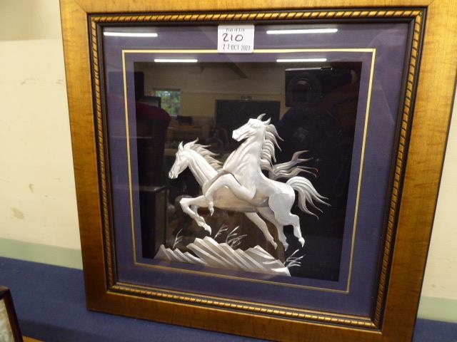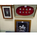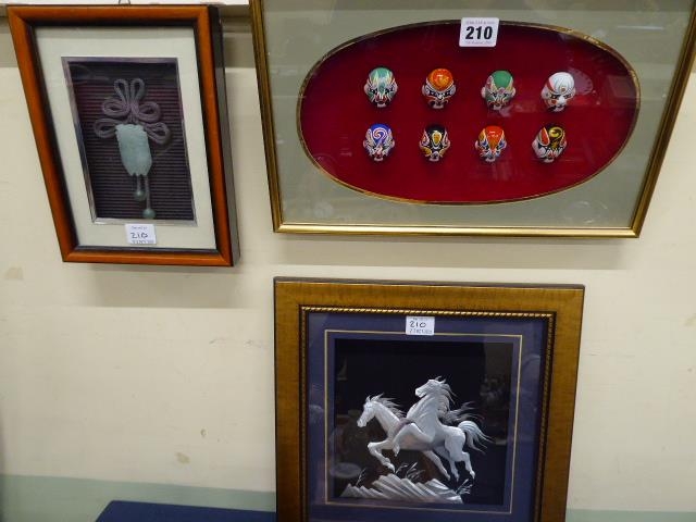 Framed ceramic miniature Mexican wrestler masks, silver 3D effect horse collage and Chinese style jade pendant (3)