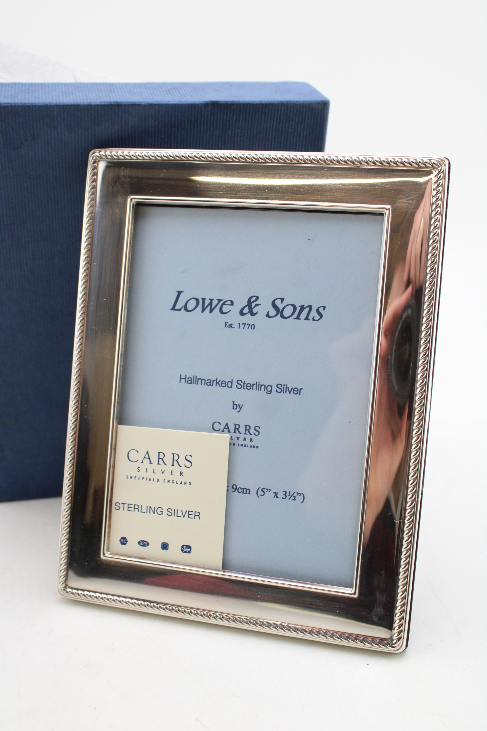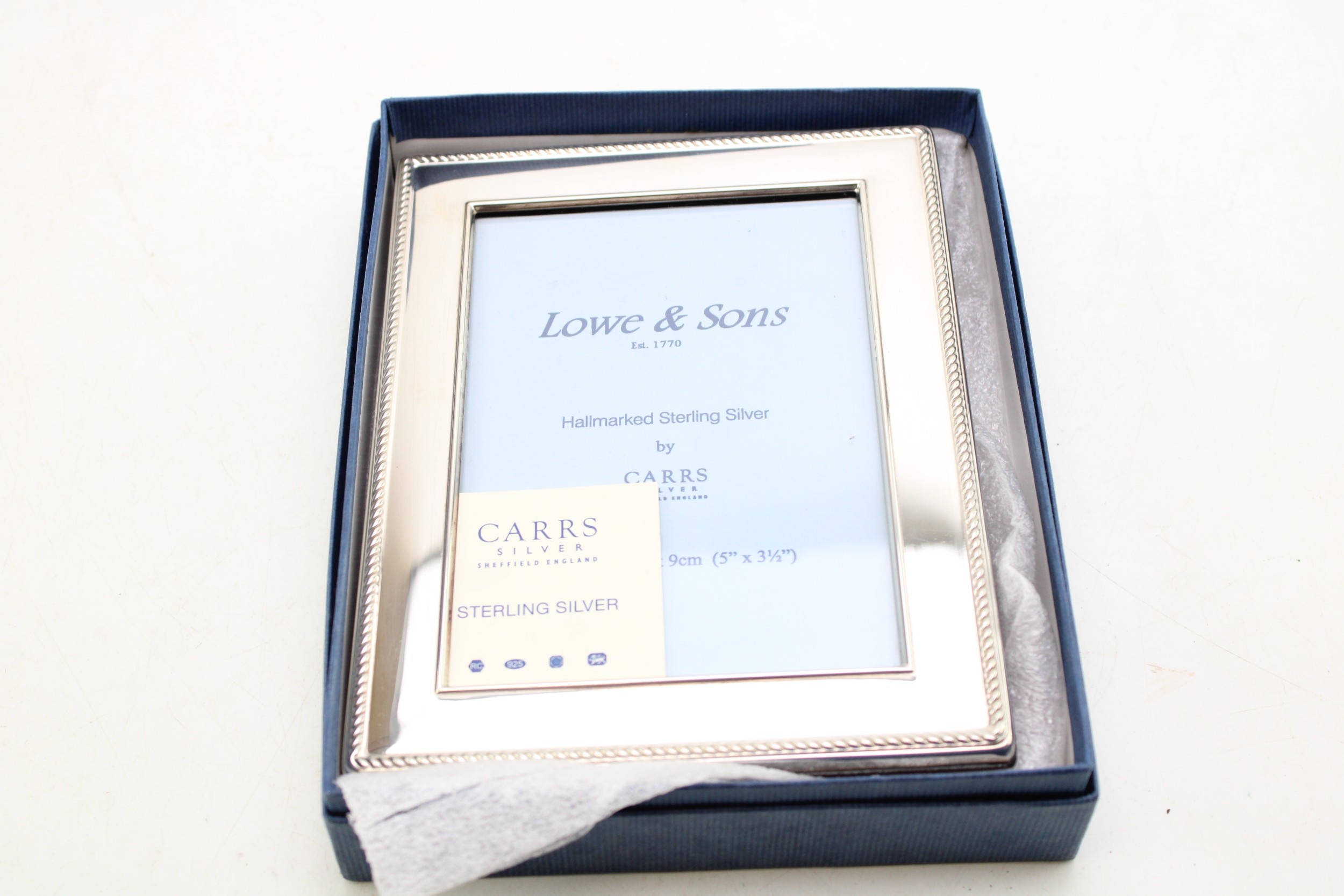 Boxed sterling silver photo frame, by Carrs of Sheffield 2007, 13cm tall.