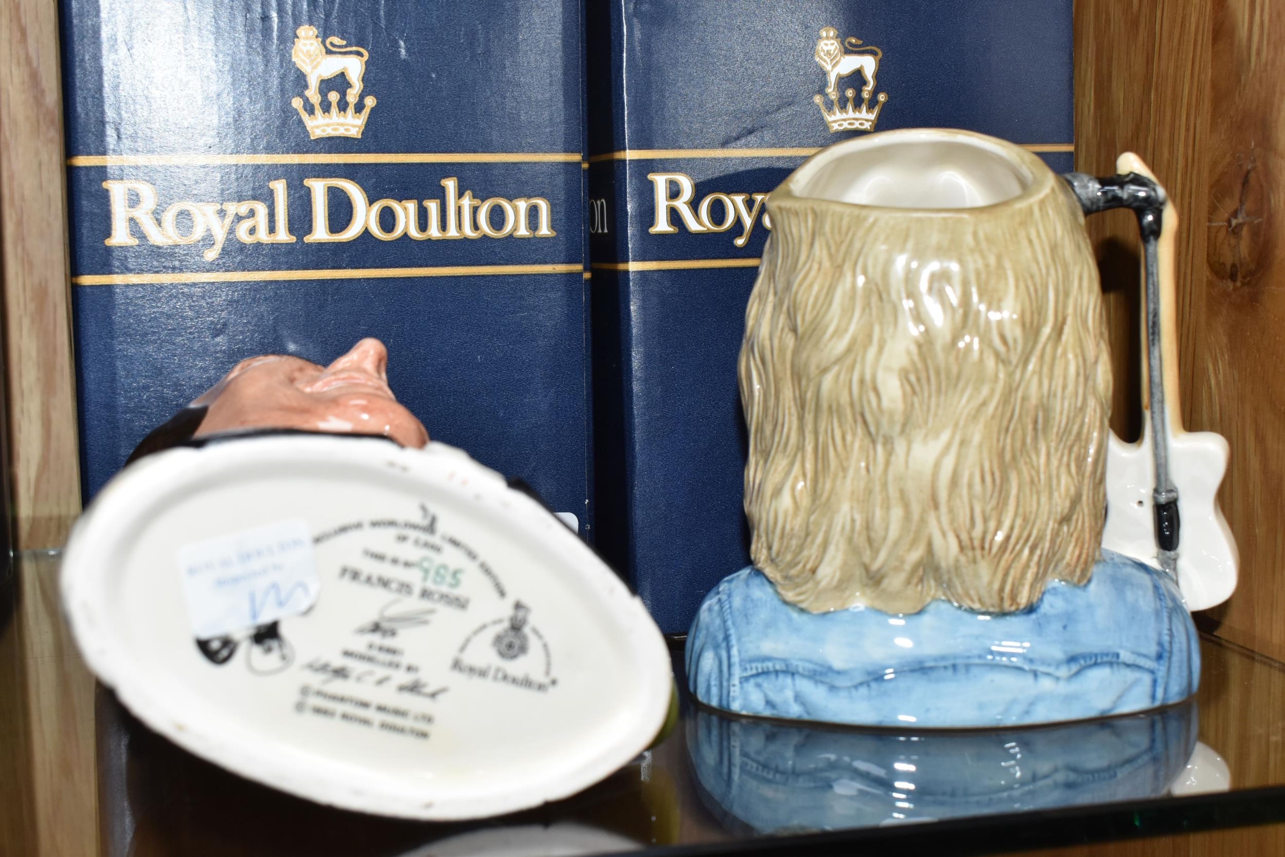 TWO BOXED ROYAL DOULTON LIMITED EDITION 'STATUS QUO' CHARACTER JUGS, Francis Rossi D6961 and Rick Parfitt 6962, numbered 985/2500, height 12.5cm (2 + 2 boxes) (Condition Report: pieces appear in good condition with no obvious damage, slight wear to boxes)