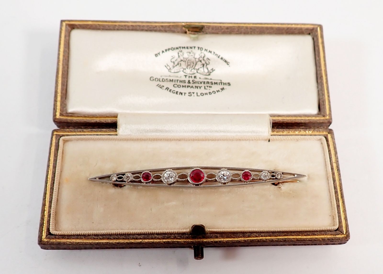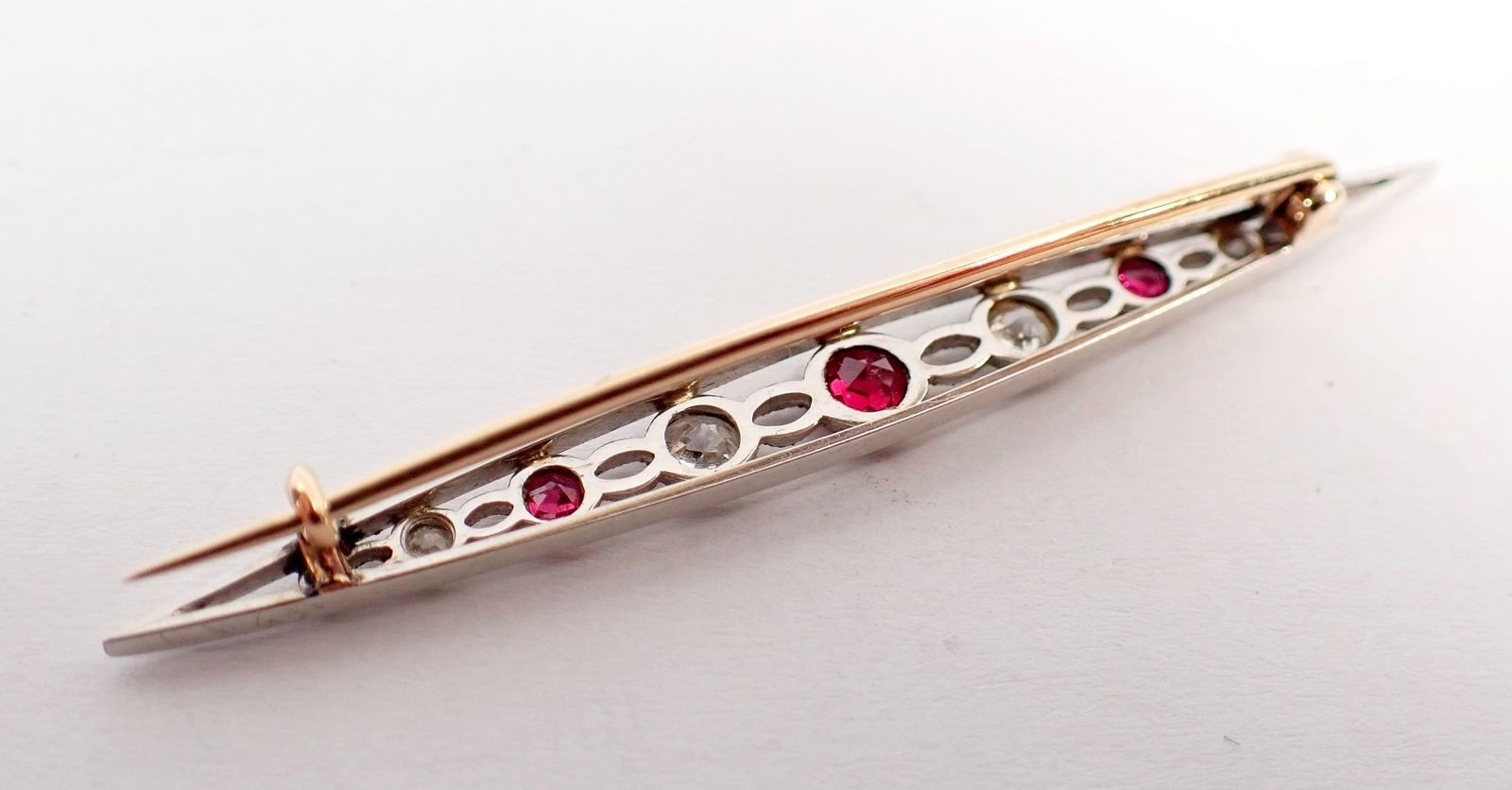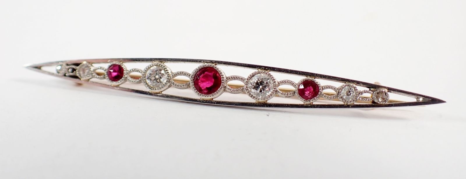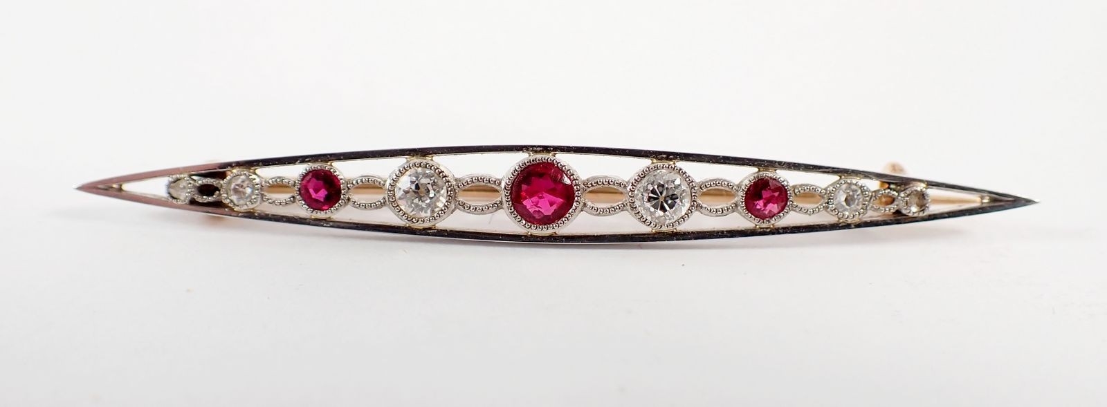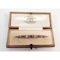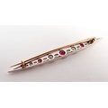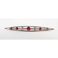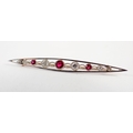 An Edwardian ruby and diamond bar brooch set in open work white and yellow gold, 5.5cm long - in original box, 3.2g