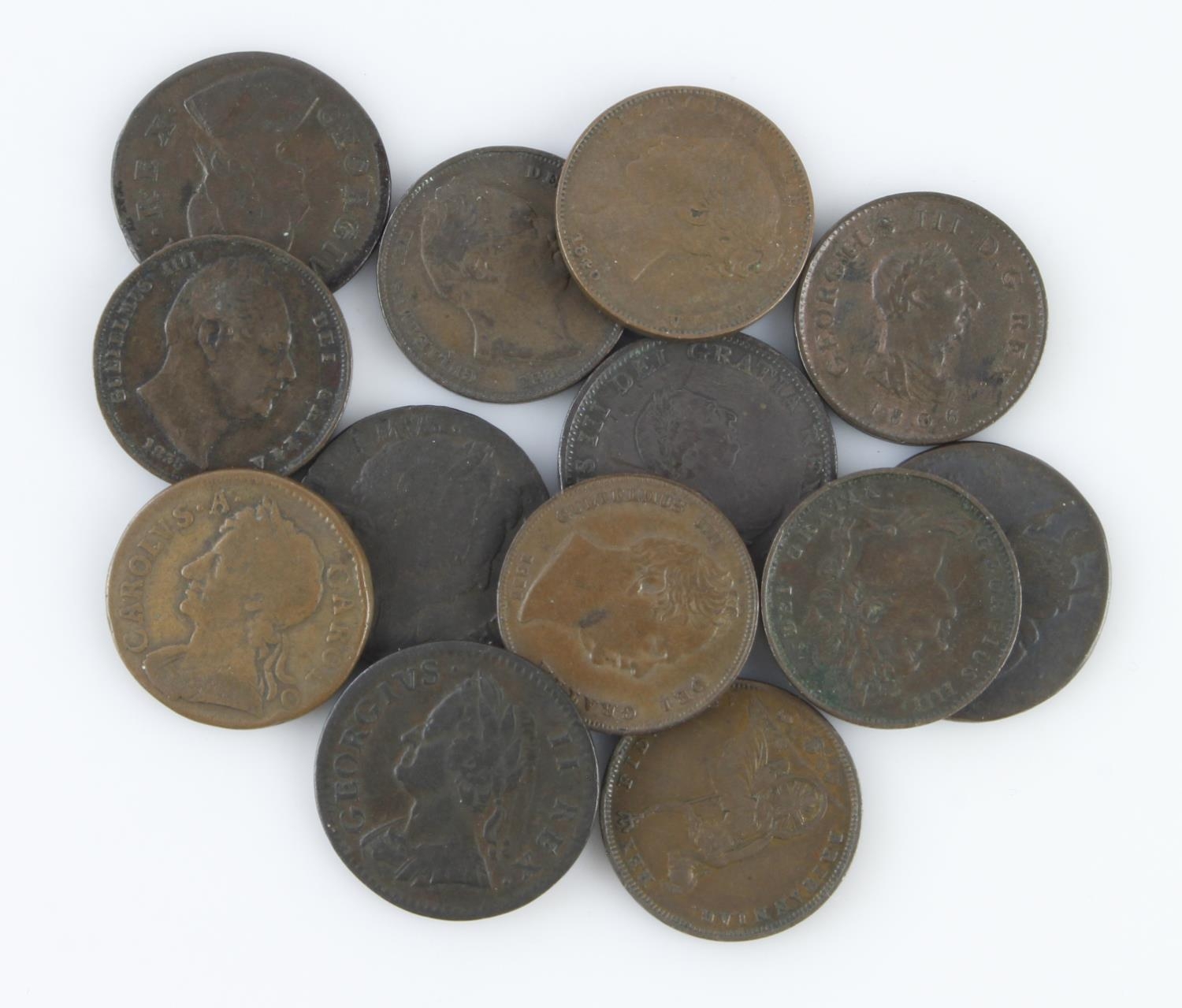 GB Farthings (13) 17th-19thC assortment, mixed grade, noted William & Mary 1694 F-GF, etc.