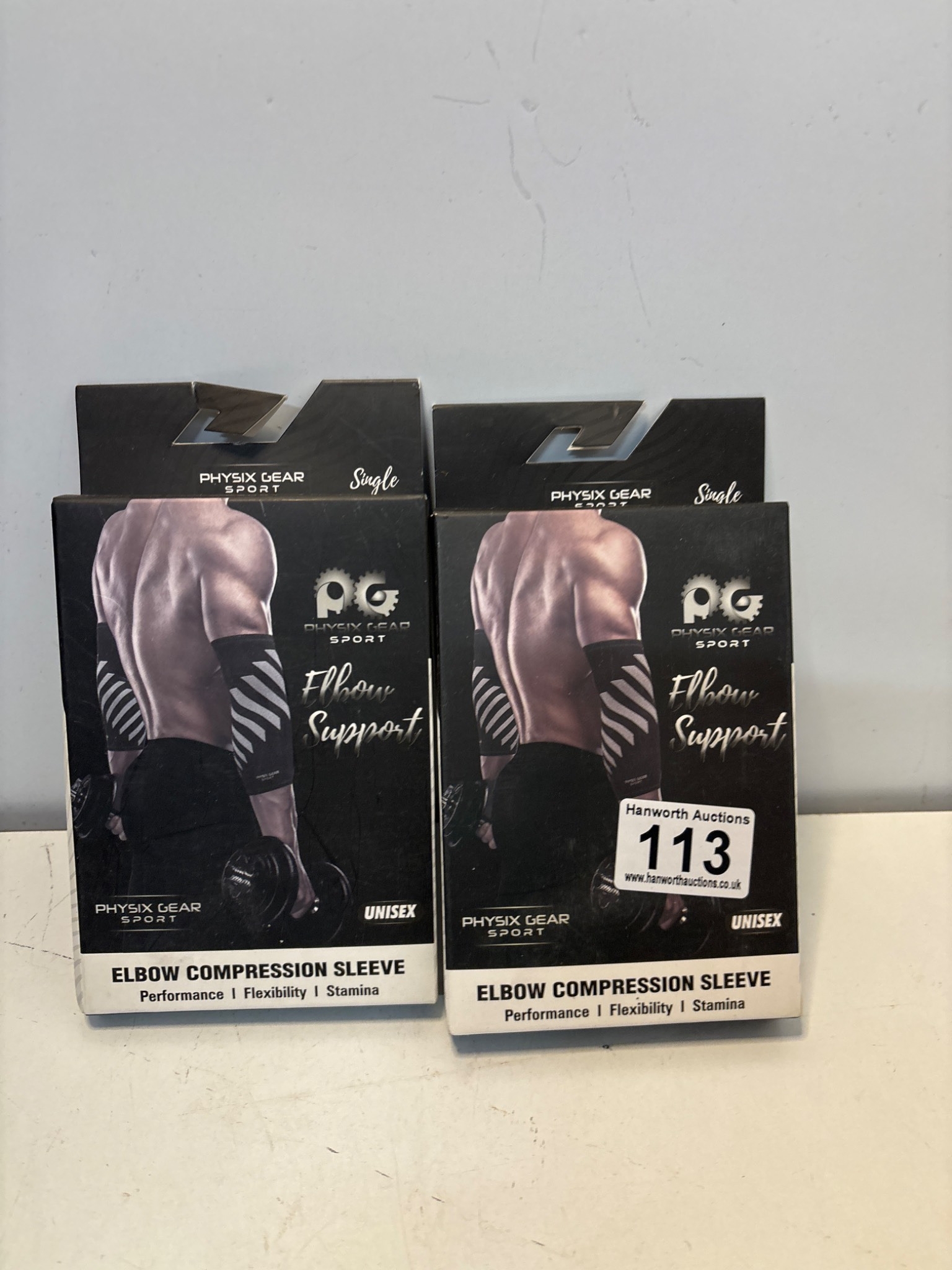 Two Physix Gear elbow compression sleeves, unisex, in original packaging.
