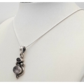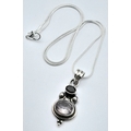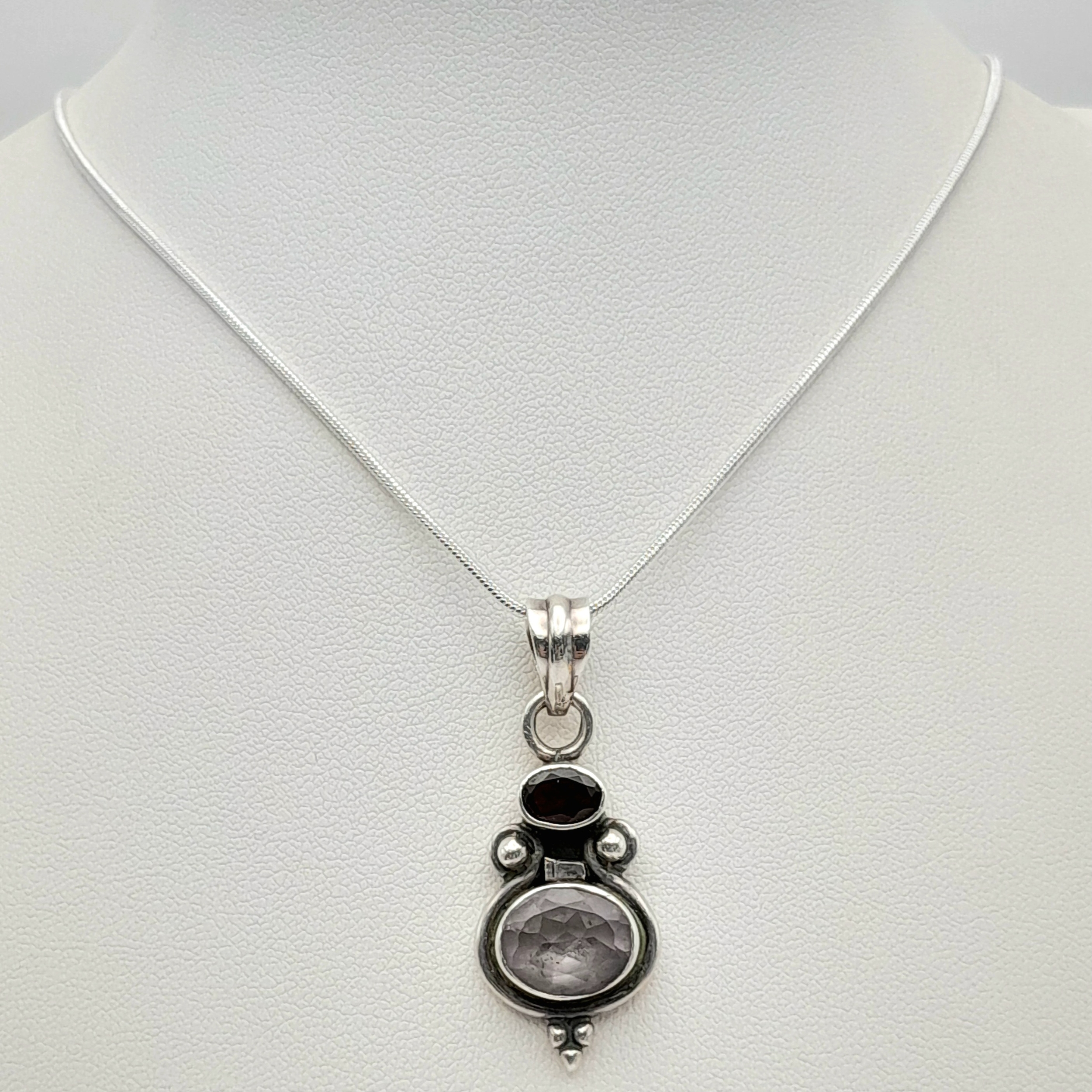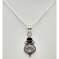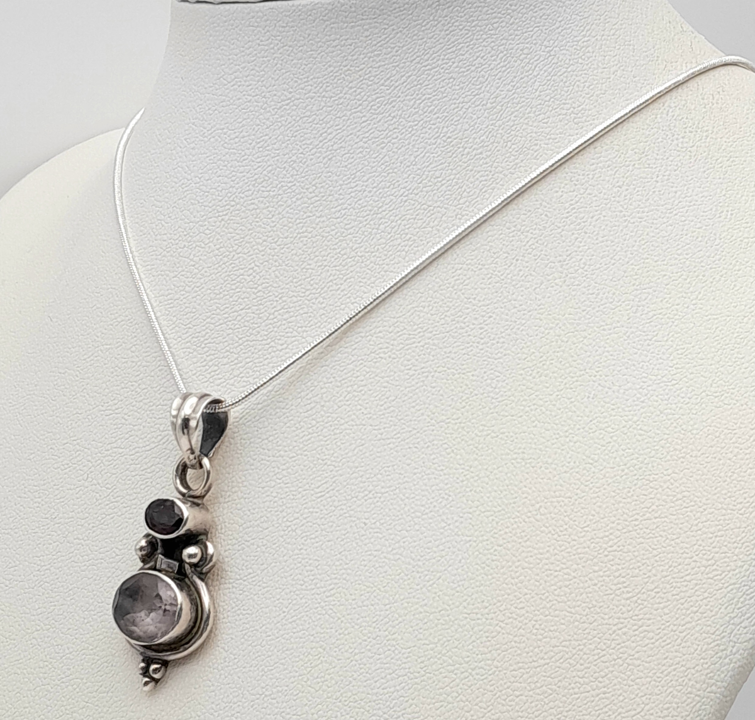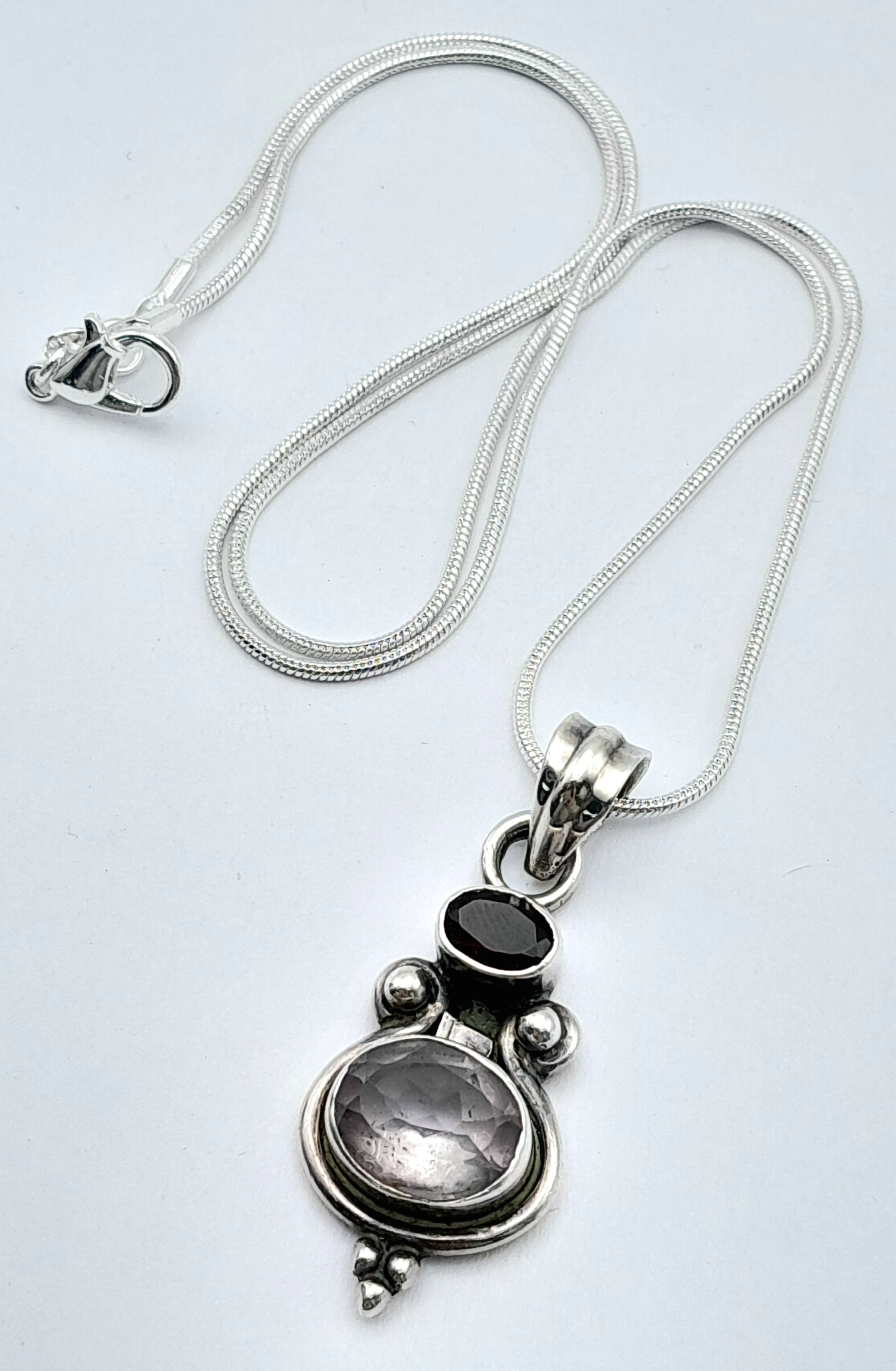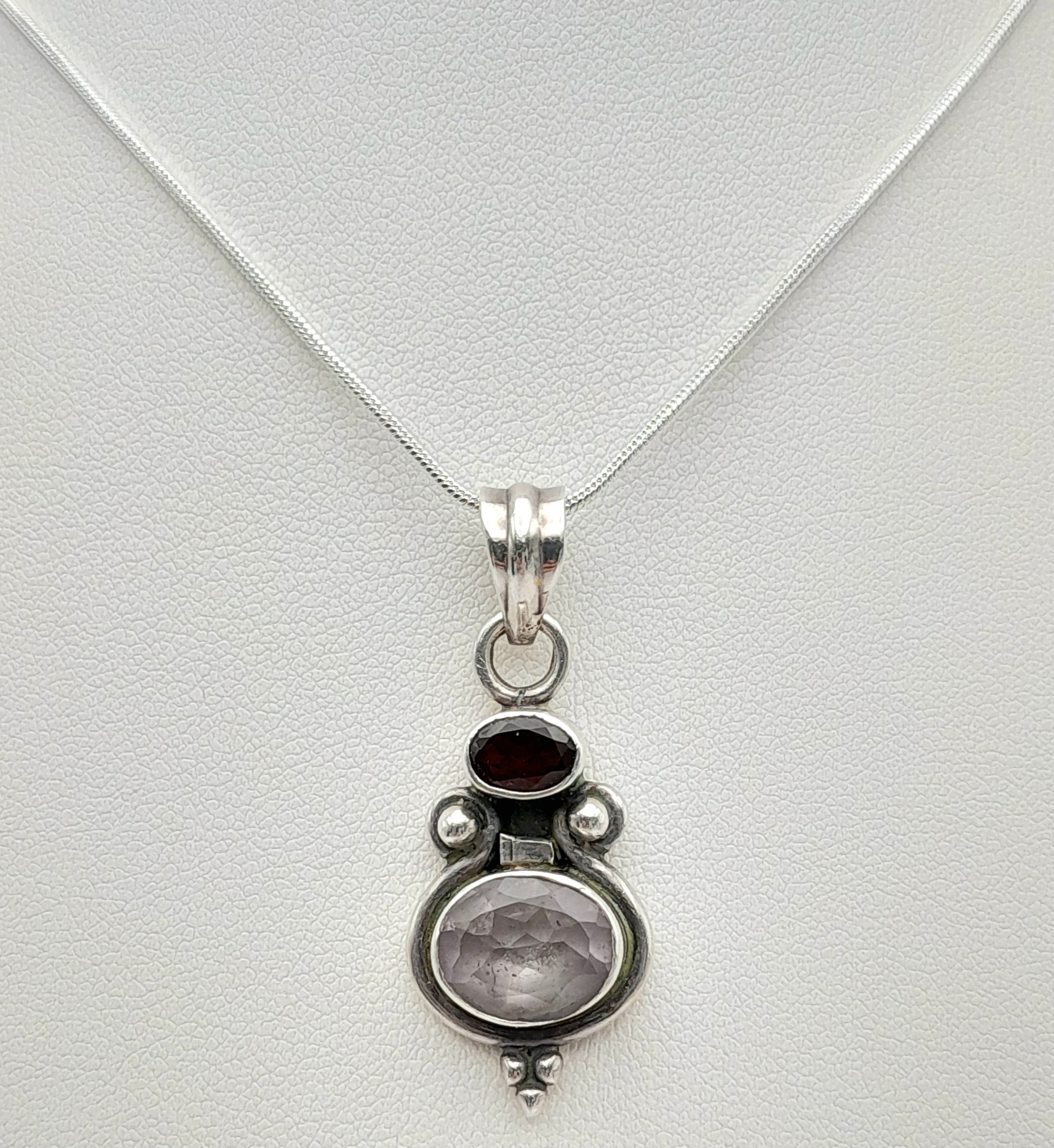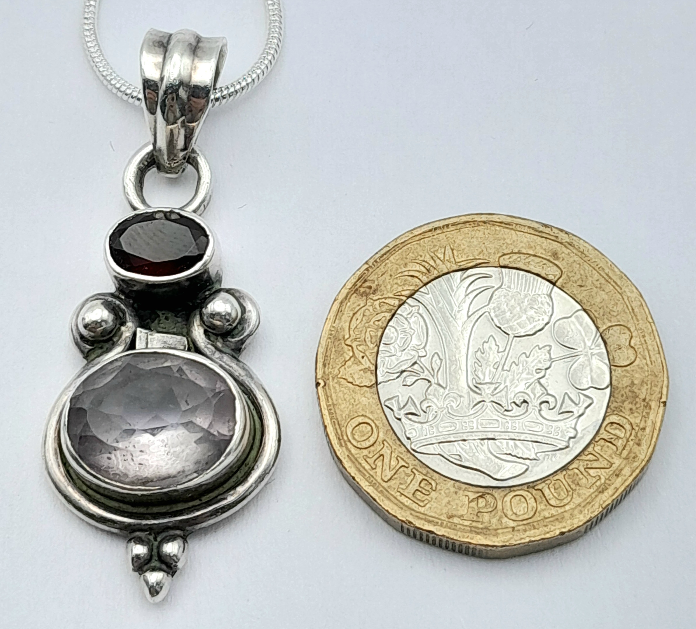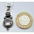 Vintage SOLID SILVER, AMETHYST and GARNET DROP PENDANT Mounted on a SILVER NECKLACE. Necklace x 45 cm. Pendant x 4 cm. Please see pictures.