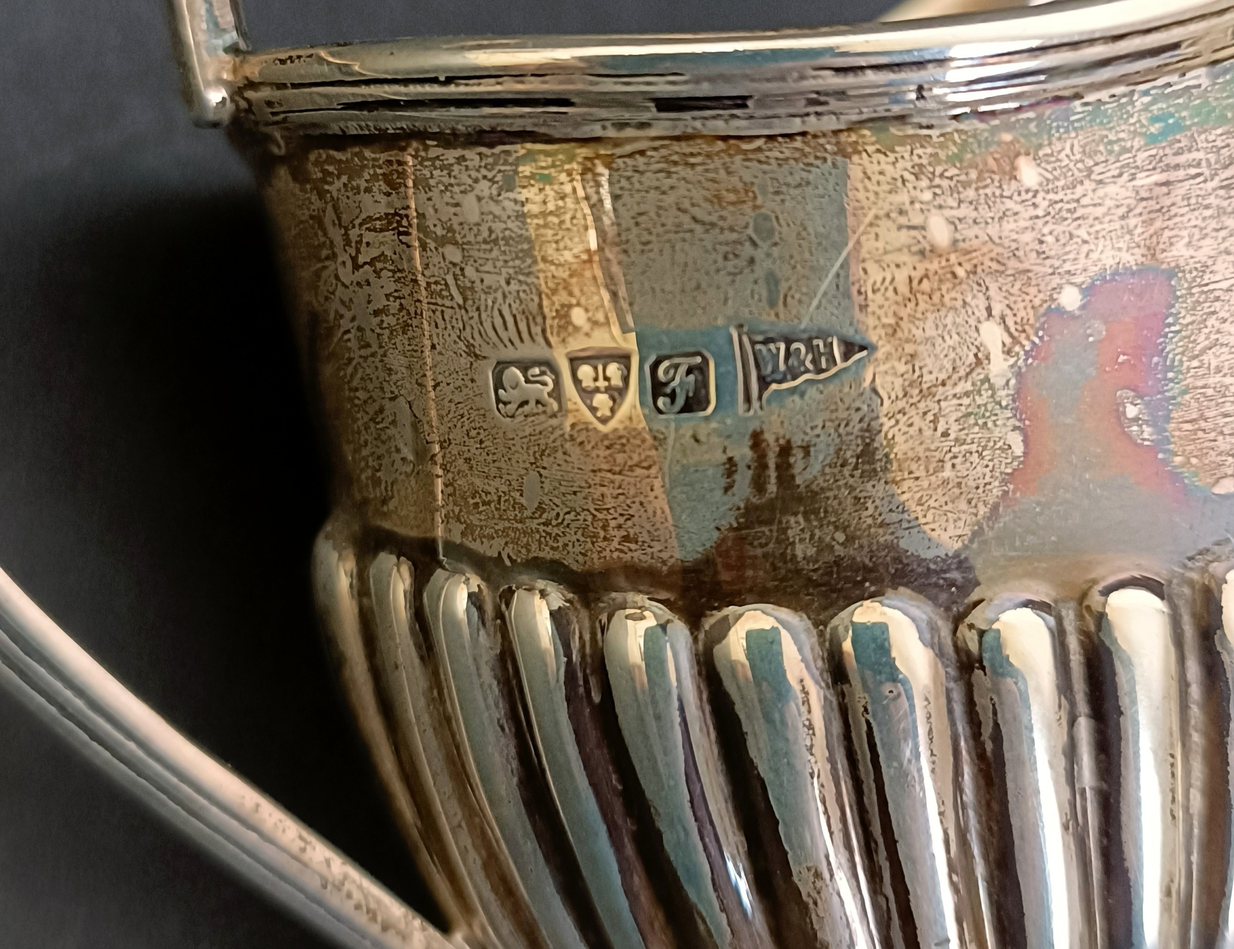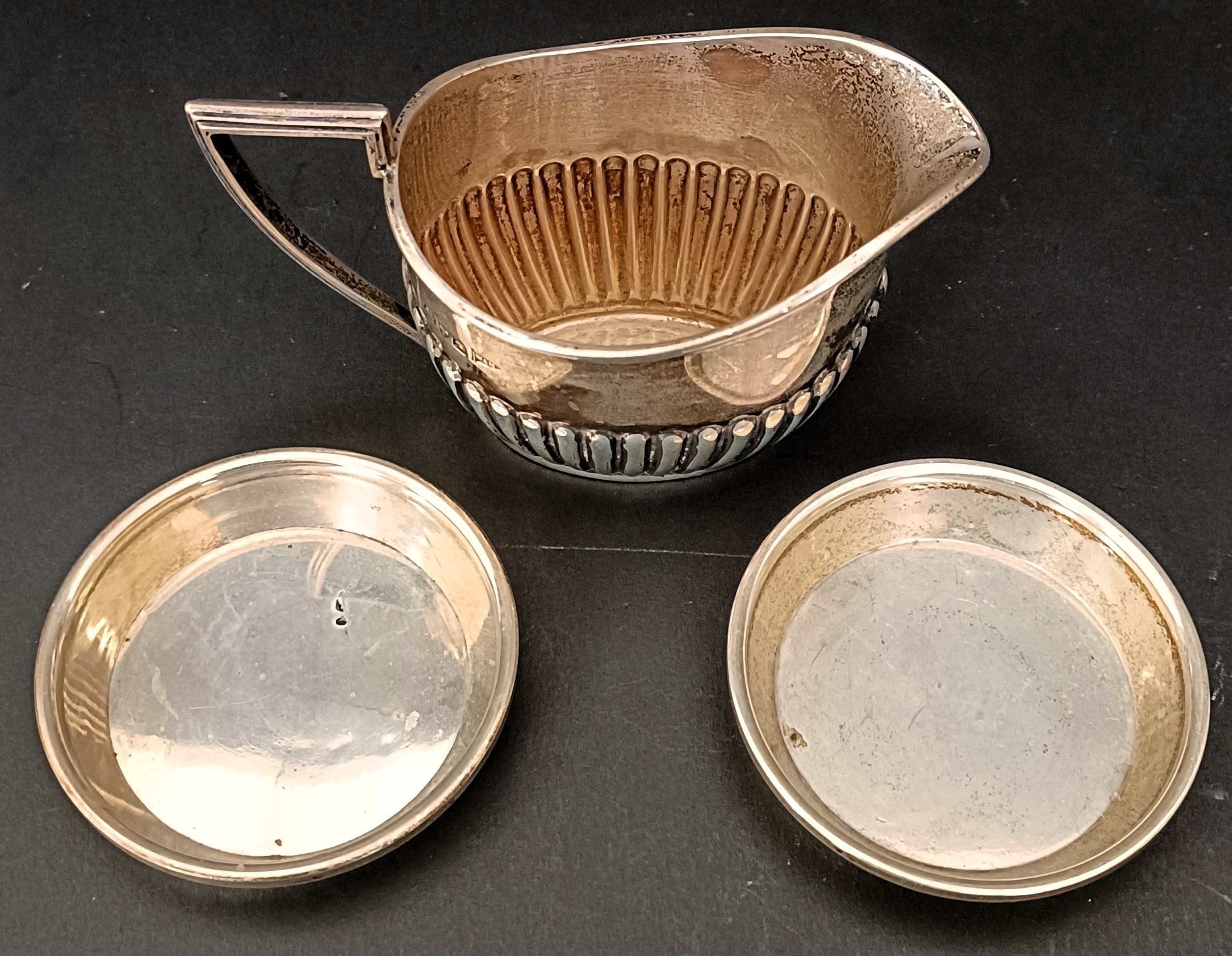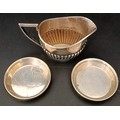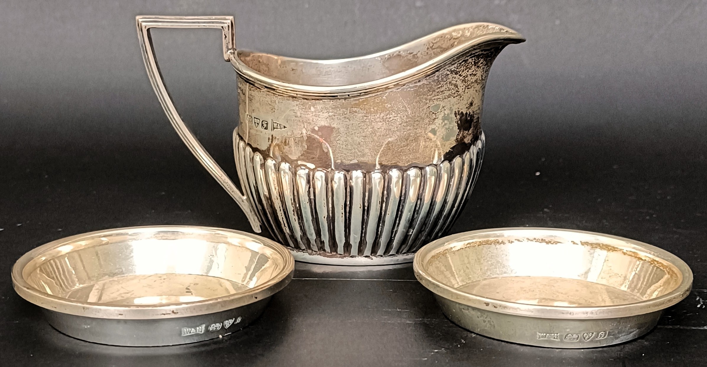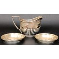 A George V silver cream jug, 12 cm wide, and a pair of silver pin dishes, 4.3 ozt (3)