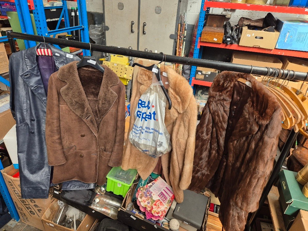 Fashion items including fur coats, leather coats, fur stole, offcuts, vintage brooches, etc.