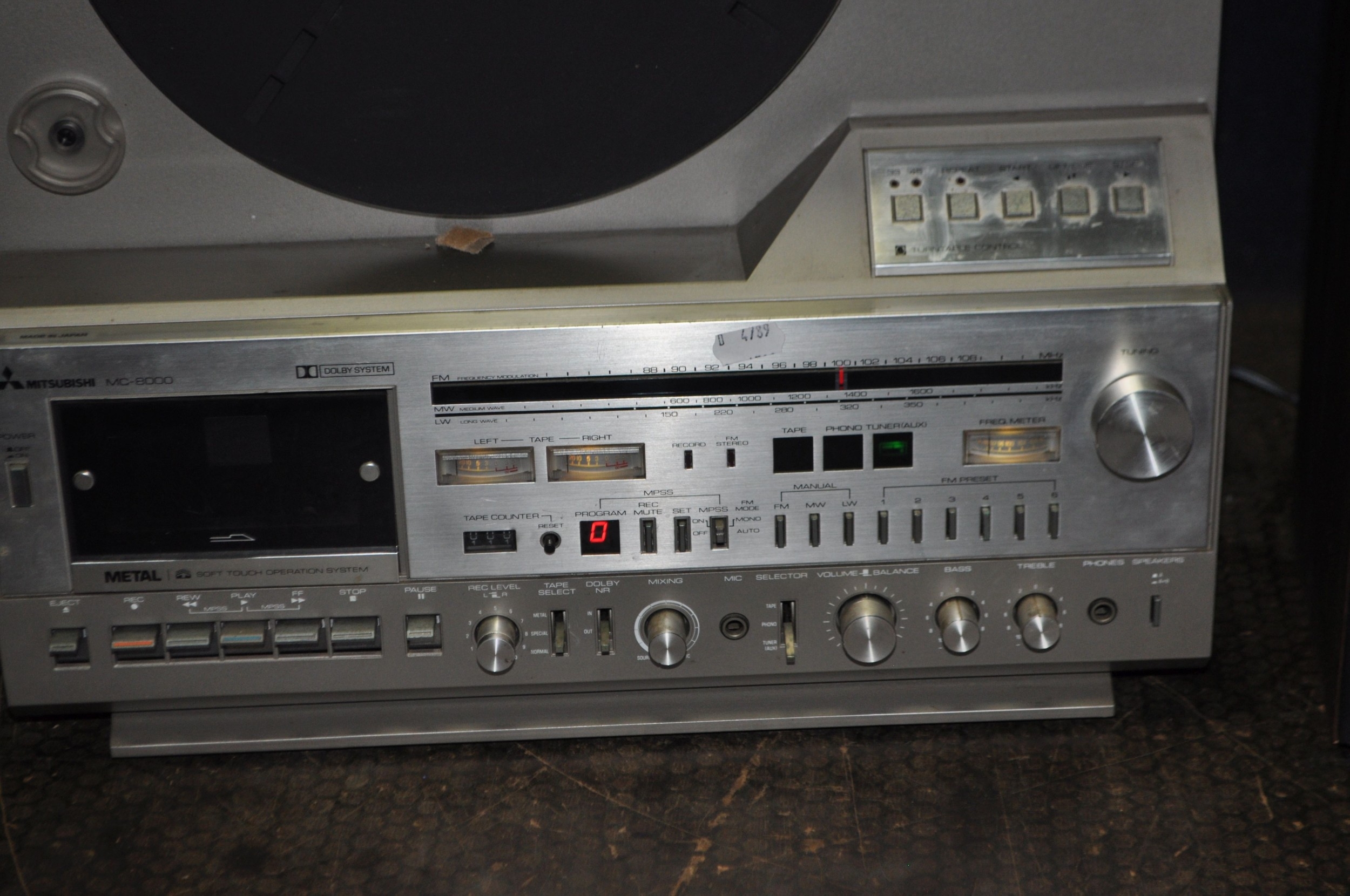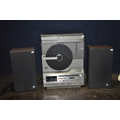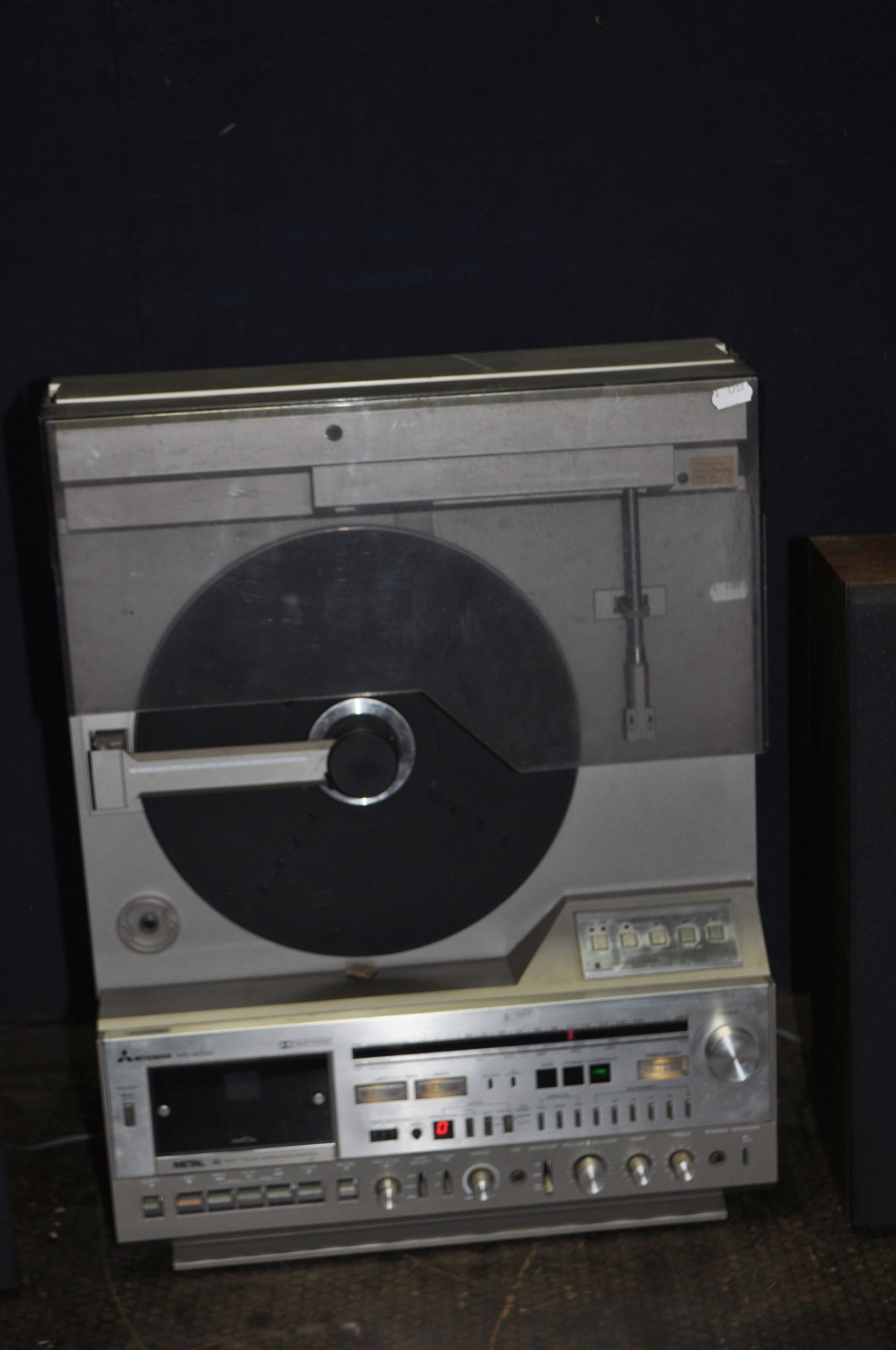 A MITSUBISHI MC8000 MUSIC CENTRE with a linear tracking turntable, FM radio, tape and matching speakers (PAT fail due to uninsulated plug, all working apart from tape not turning and turntable skips so need adjusting) (3)