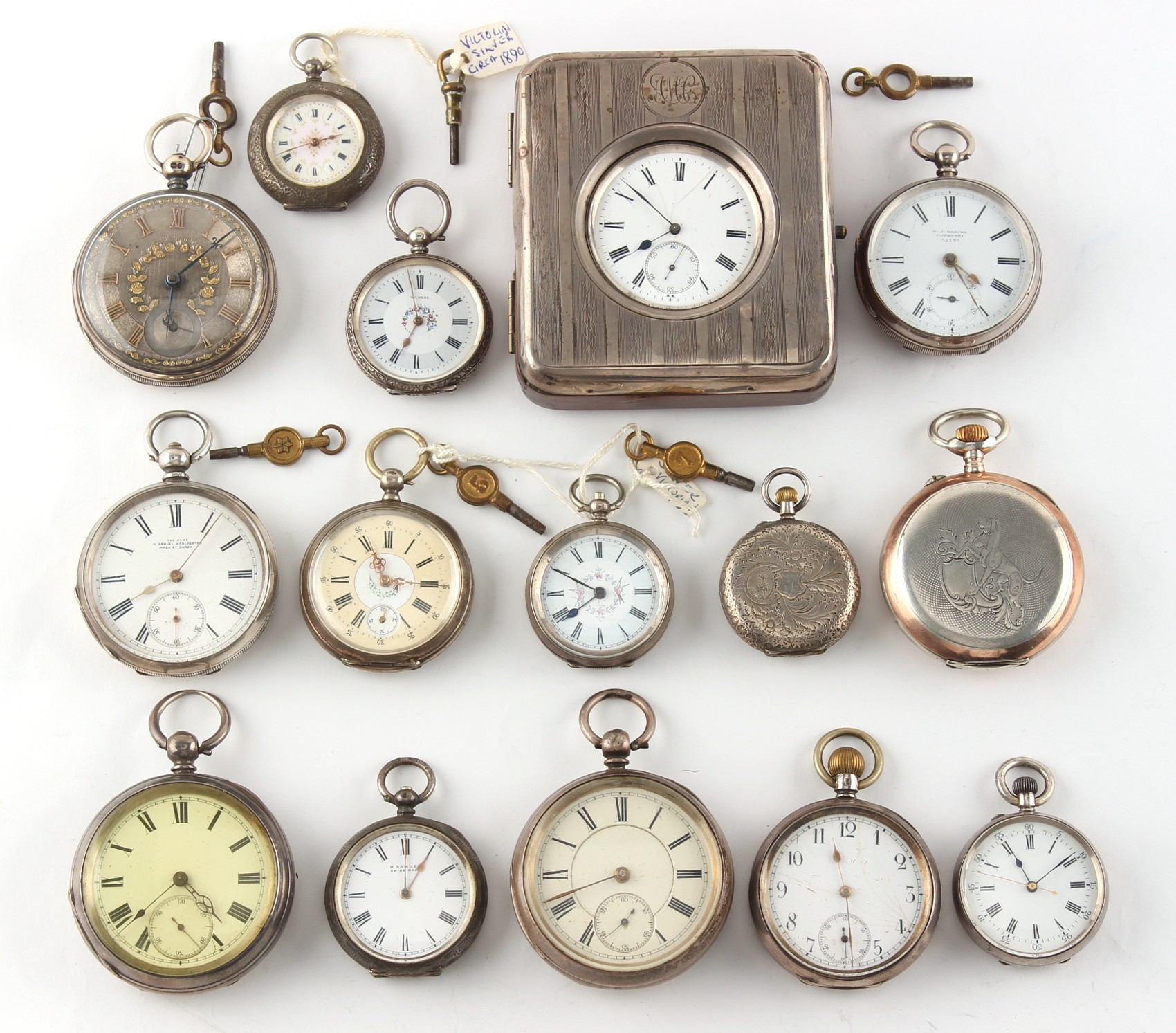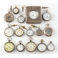 Property of a deceased estate, a private collection of watches - fifteen assorted silver pocket watches and fob watches, late 19th century and early 20th century, the largest 54mm diameter, one in a silver fronted easel case, ten appear to be working but no guarantees are given (15).