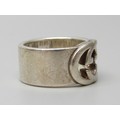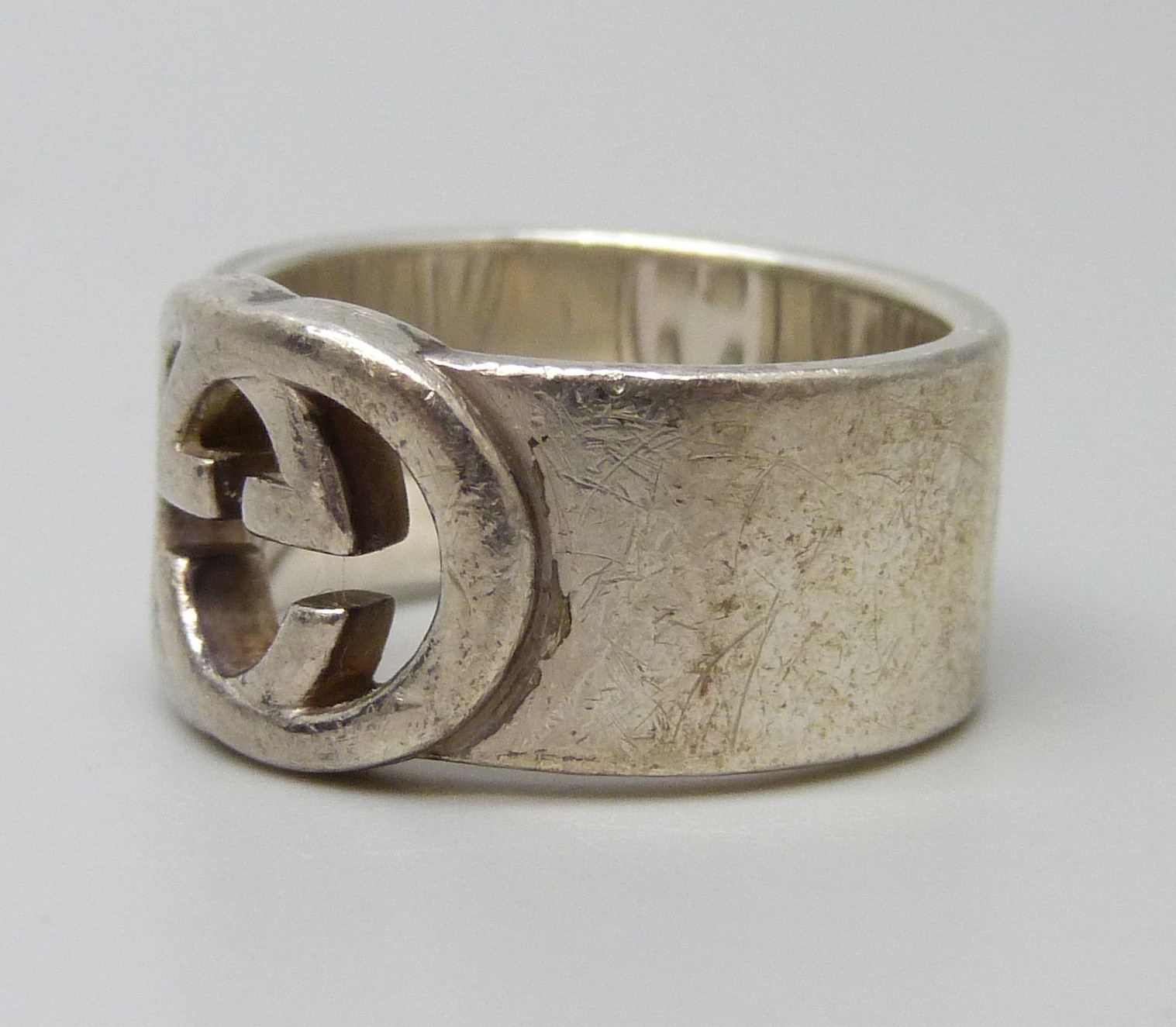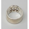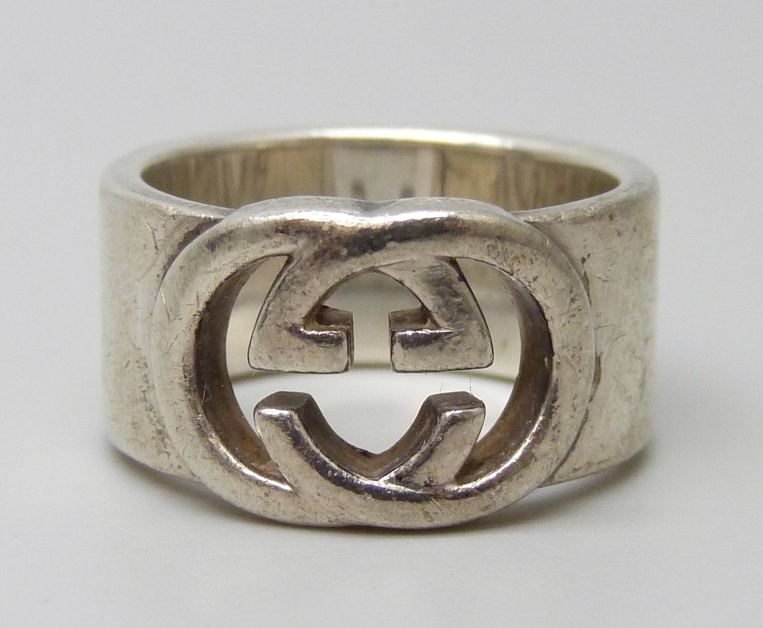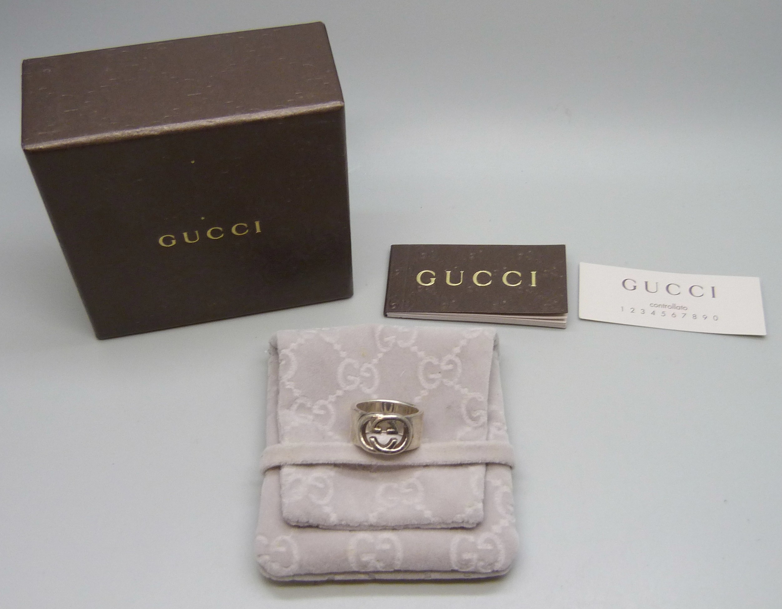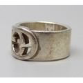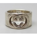 A Gucci silver ring, interlocking G design, Italian hallmarks, size O, 1cm band with leaflet, with pouch and box