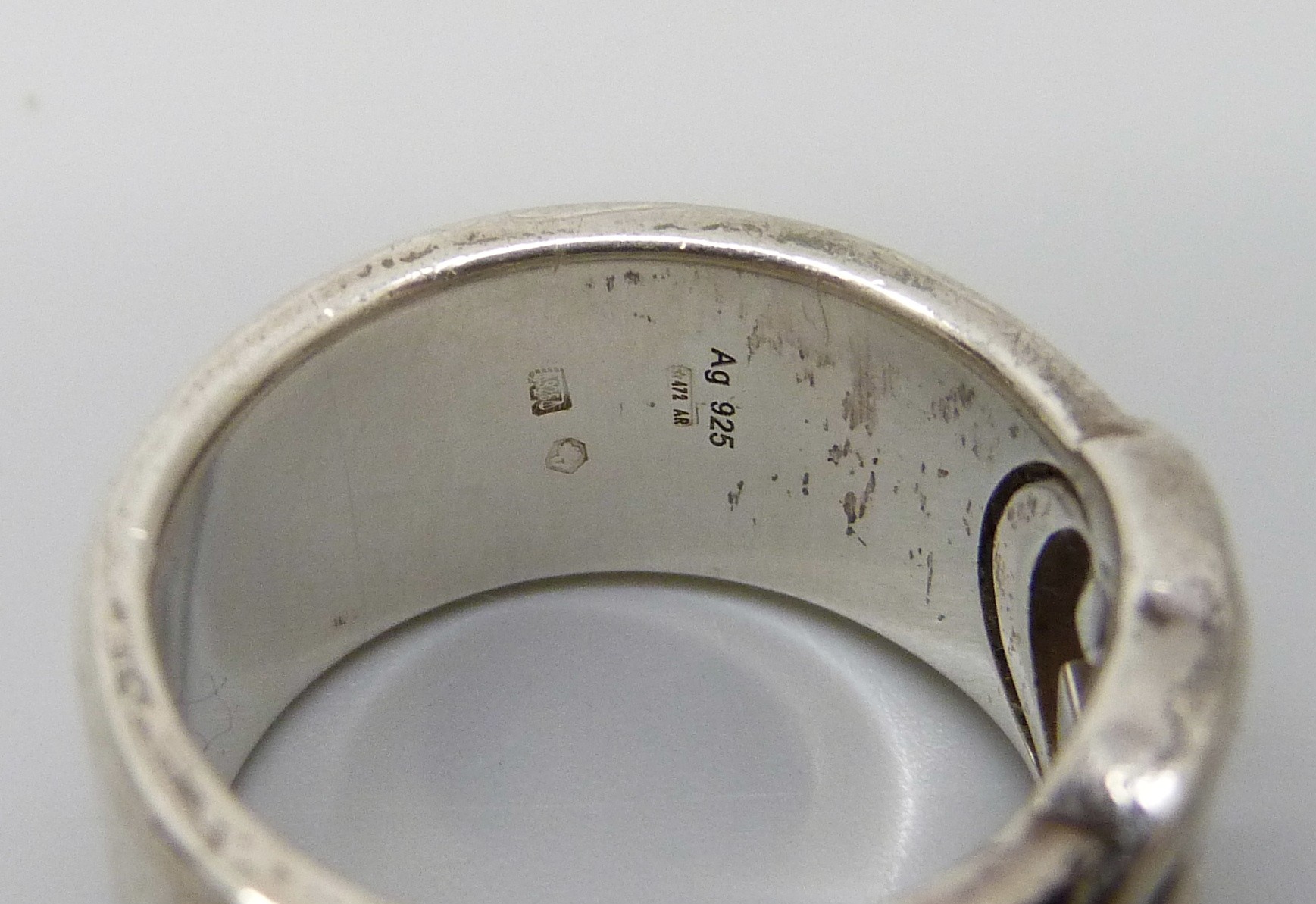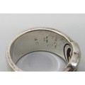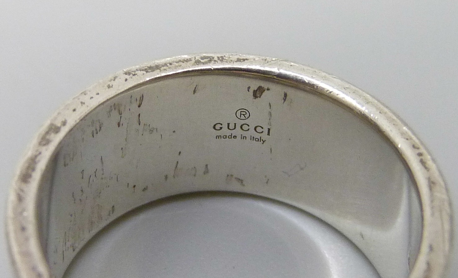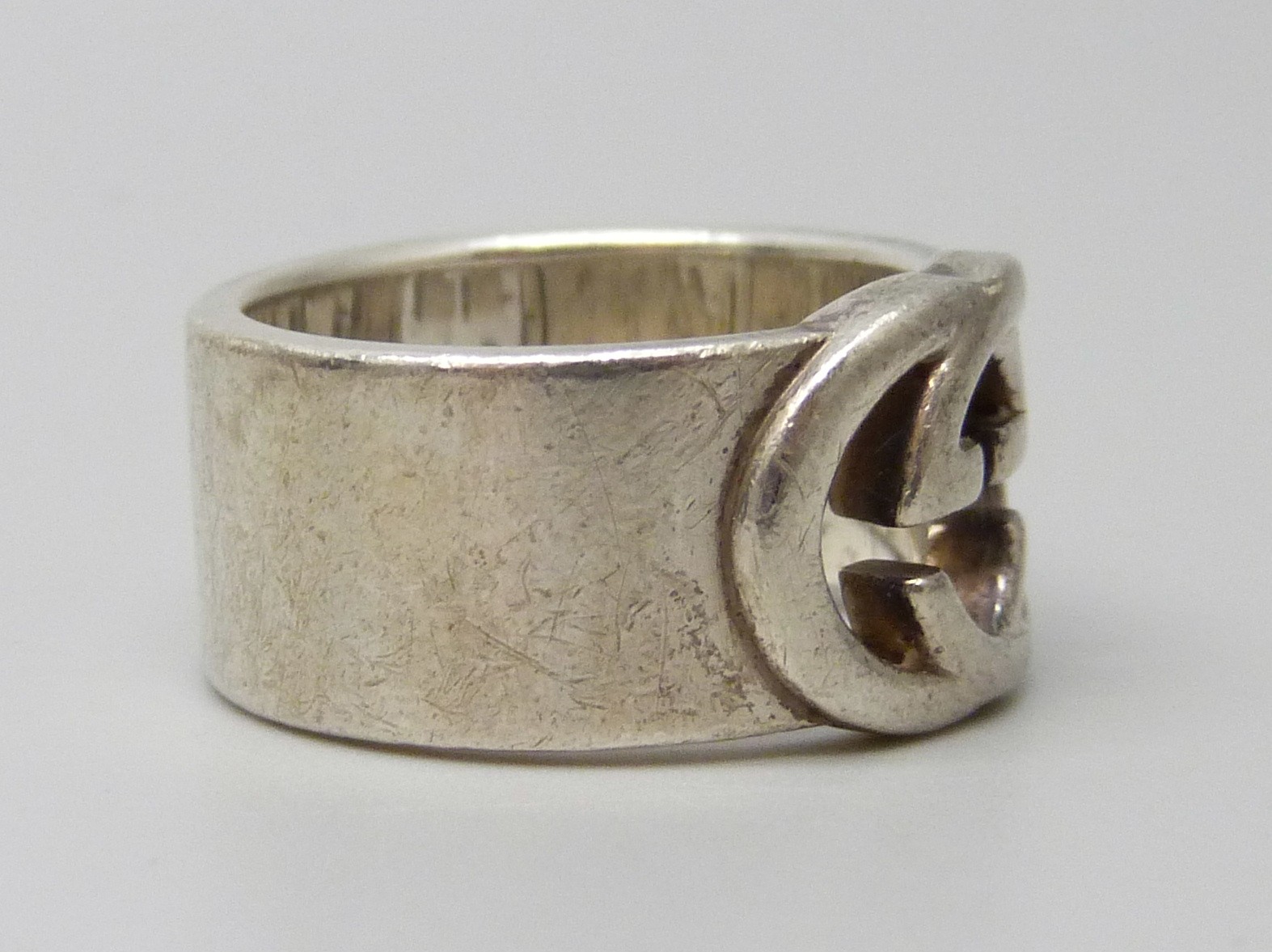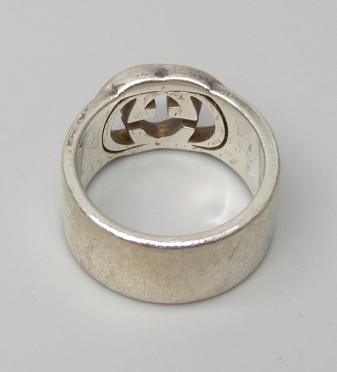 A Gucci silver ring, interlocking G design, Italian hallmarks, size O, 1cm band with leaflet, with pouch and box