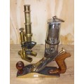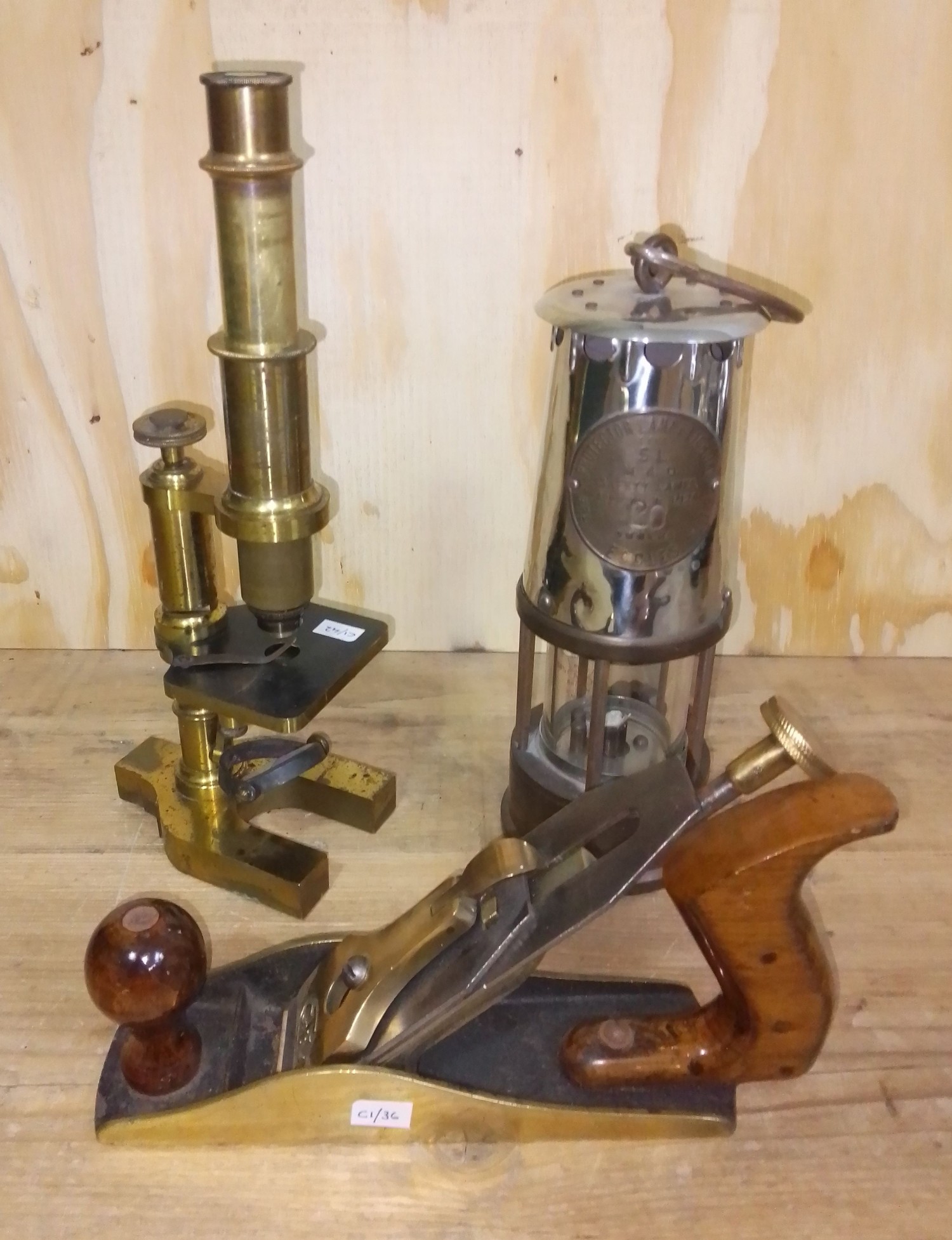 A mixed lot comprising a pit lamp, a plane and a microscope.